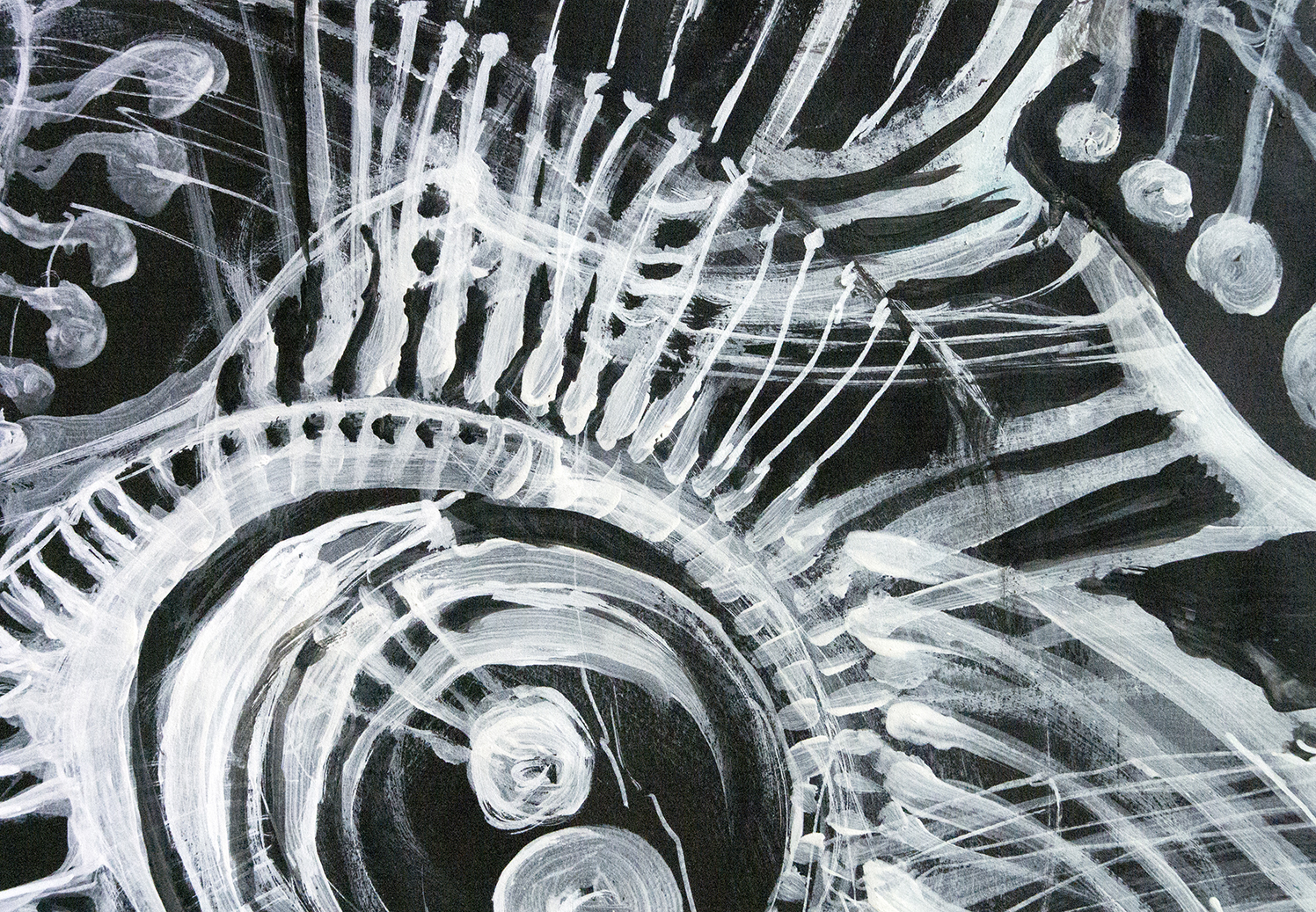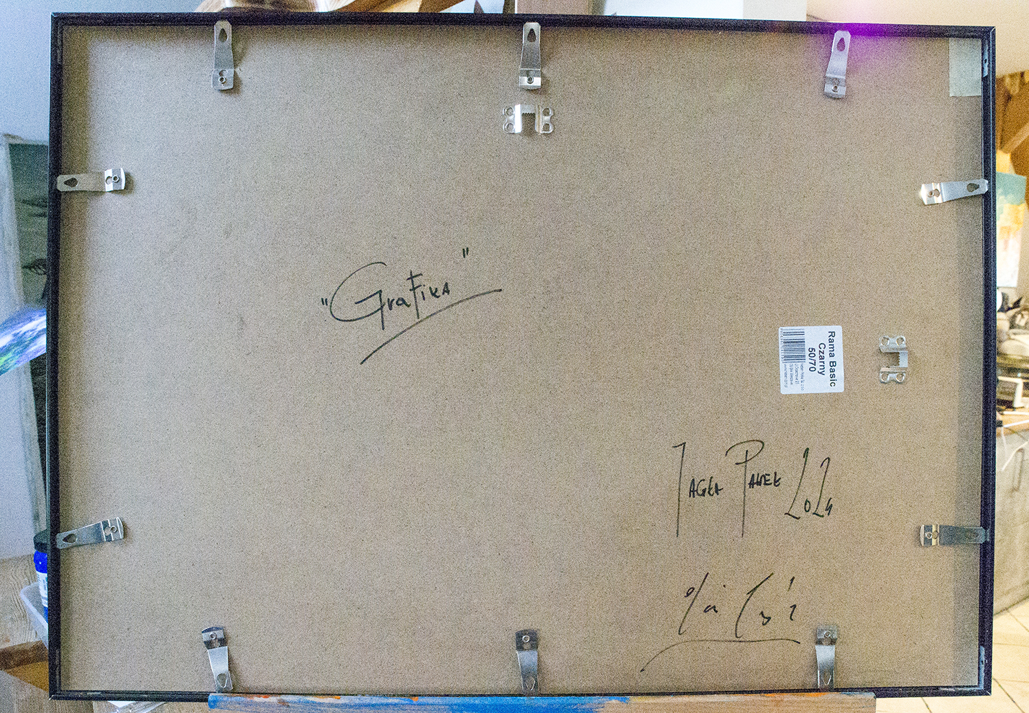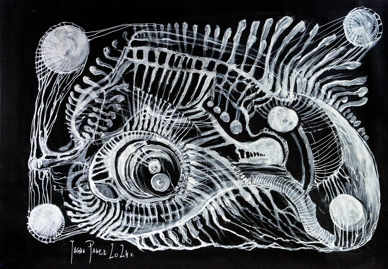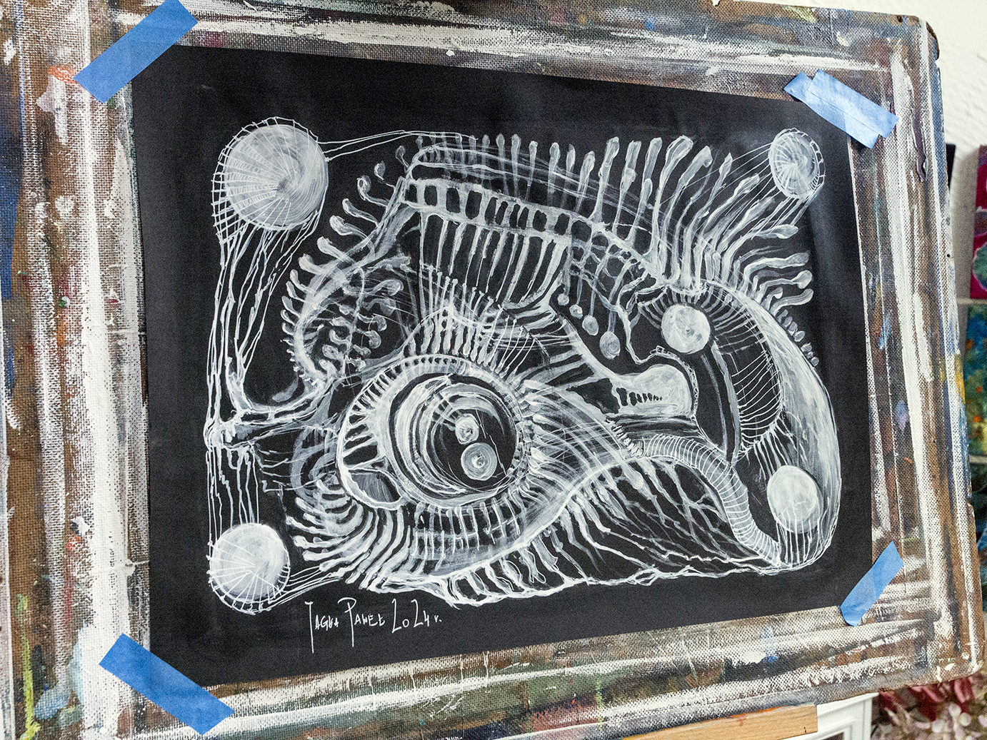 Praca autorska akryl na papierze czarnym w ramie aluminiowej pod szkłem 50×70 Akryl
