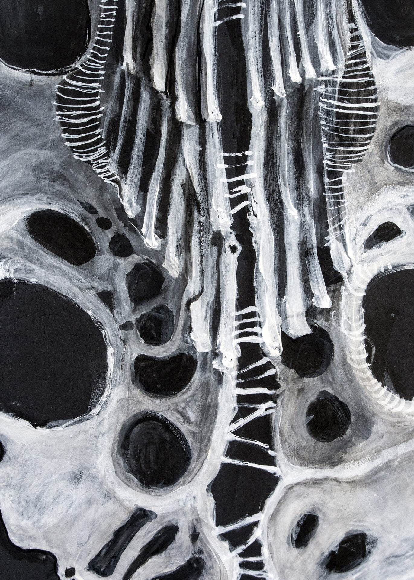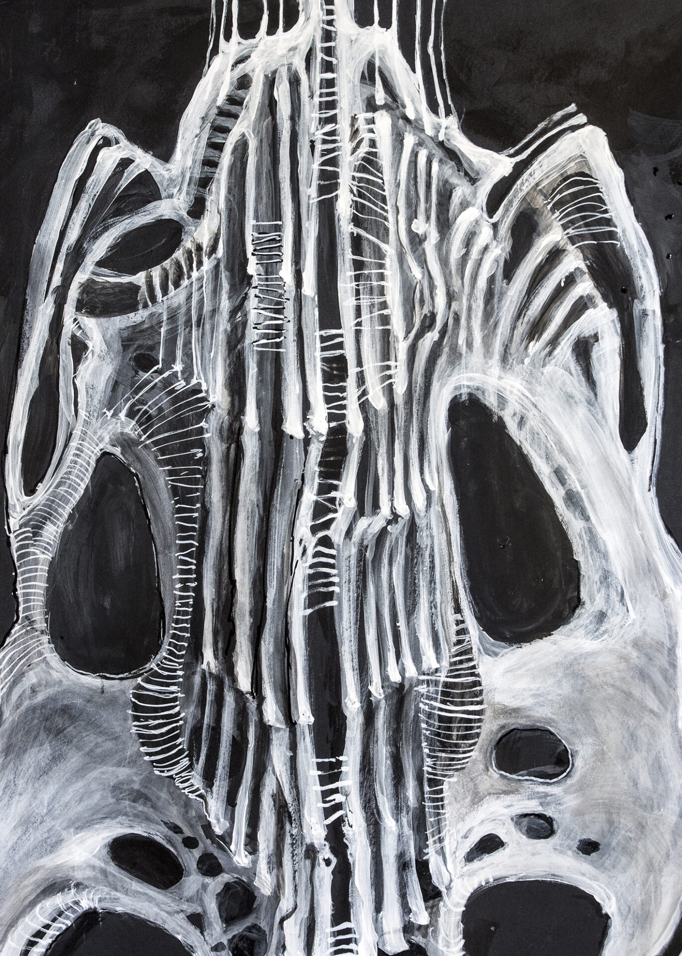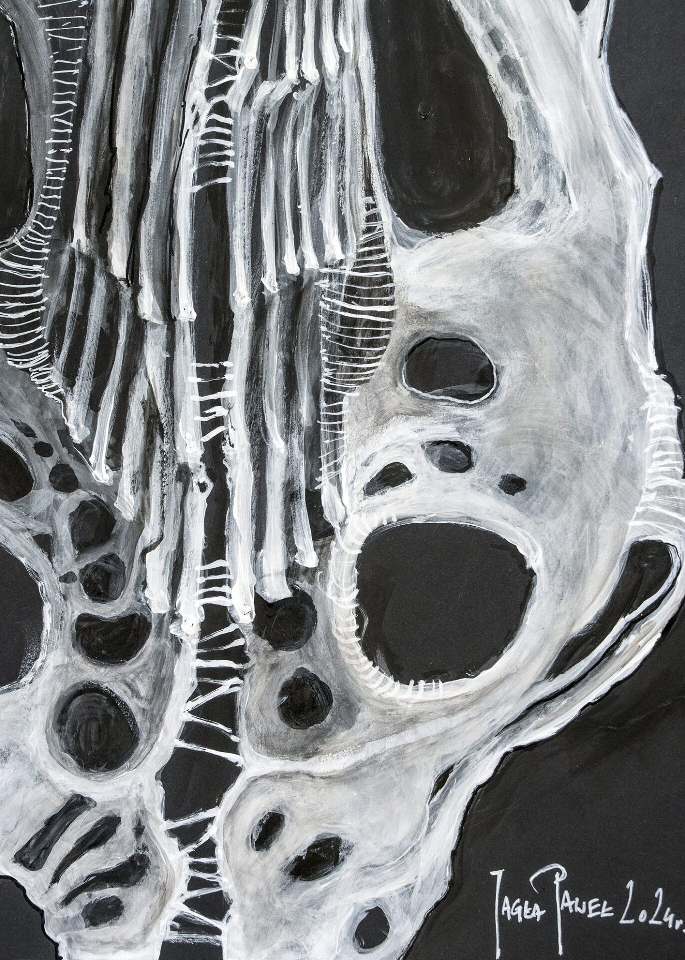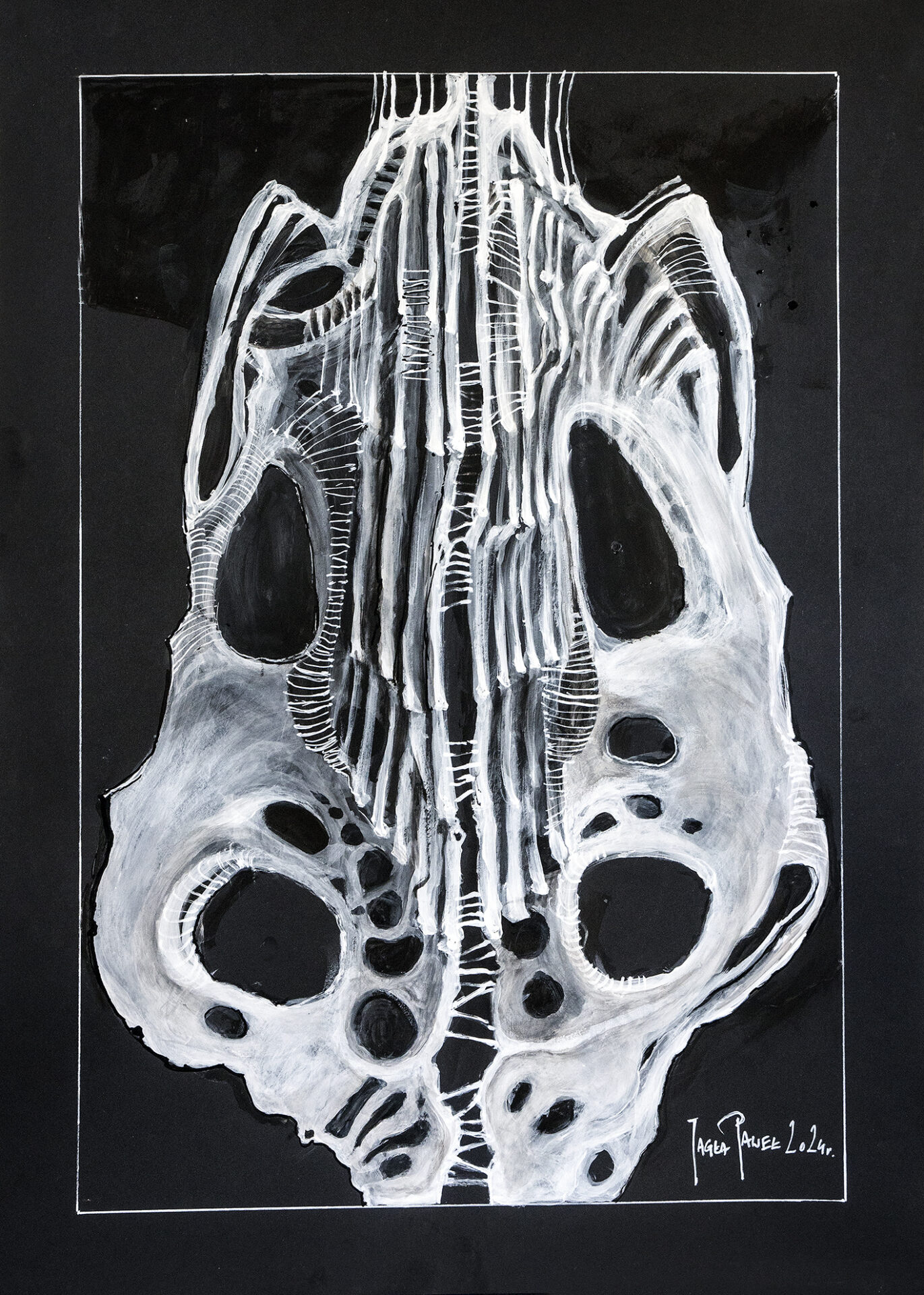 Farba akrylowa biała i czarna na papierze format 50×70 w oprawie aluminiowej czarnej pod szkłem.Praca autorska Paweł Jagła Sygnowana certyfikat autentyczności
