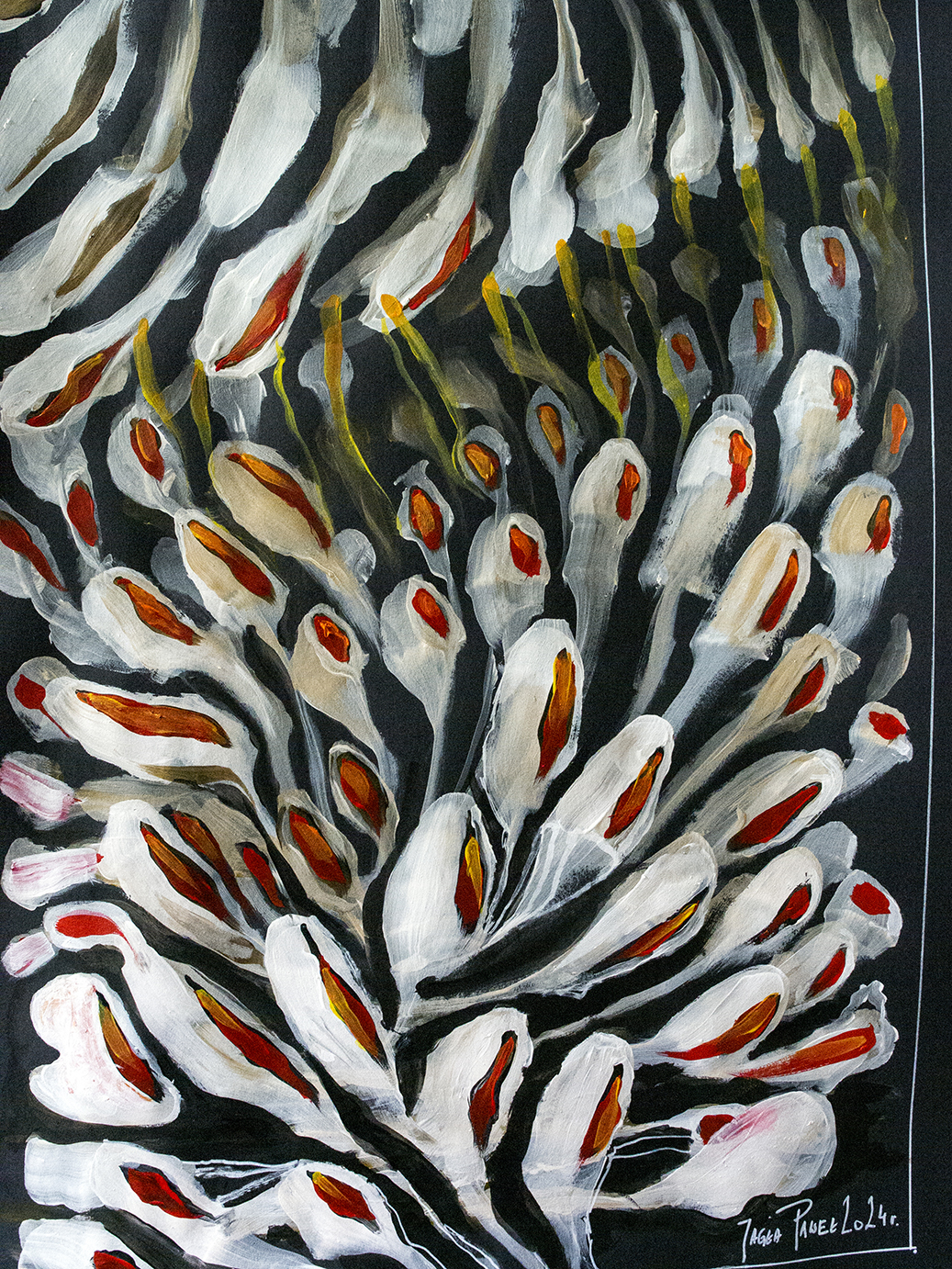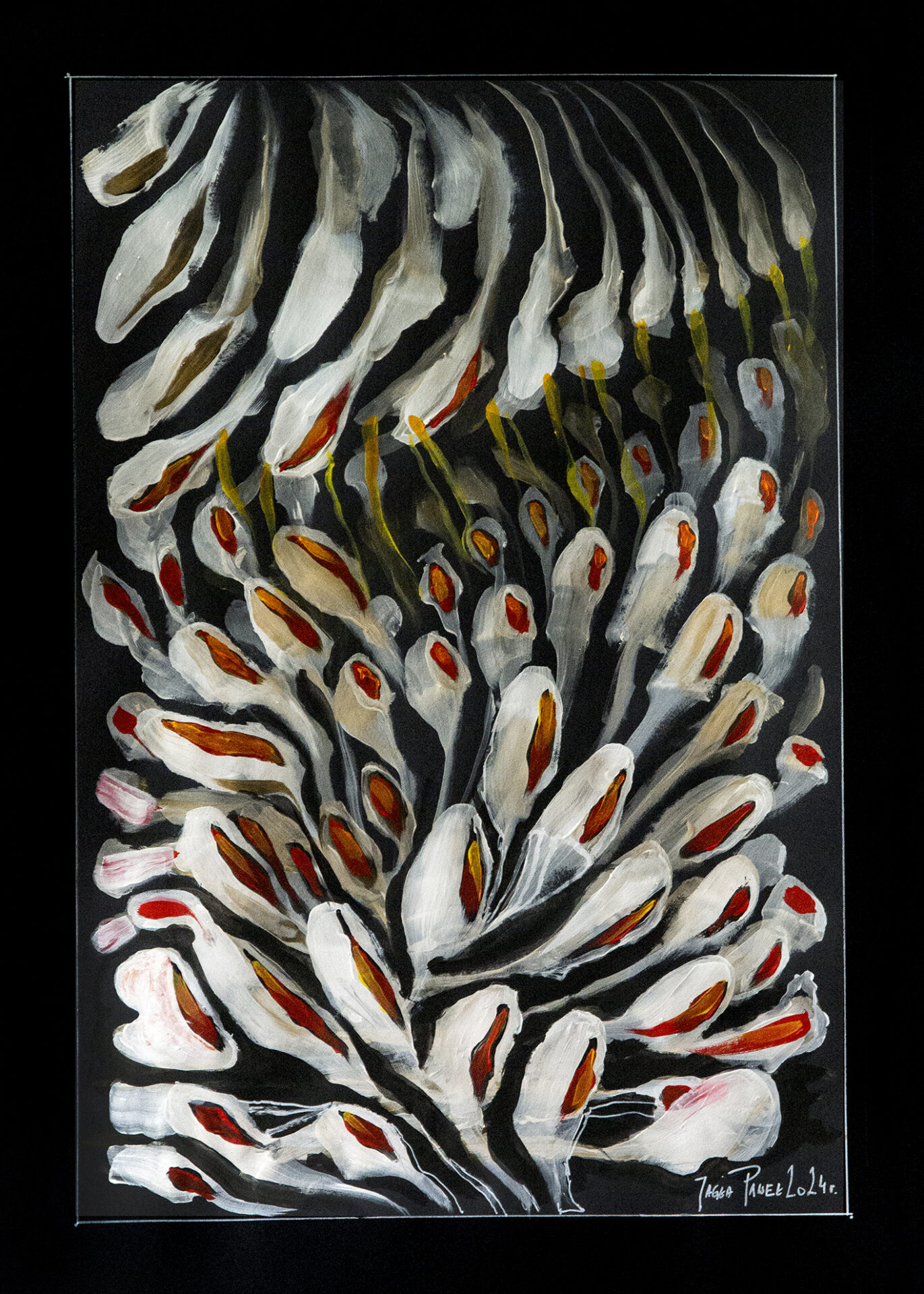 Farba akrylowa na papierze format 50×70 w oprawie aluminiowej czarnej pod szkłem.Praca autorska Paweł Jagła Certyfikat autentyczności
