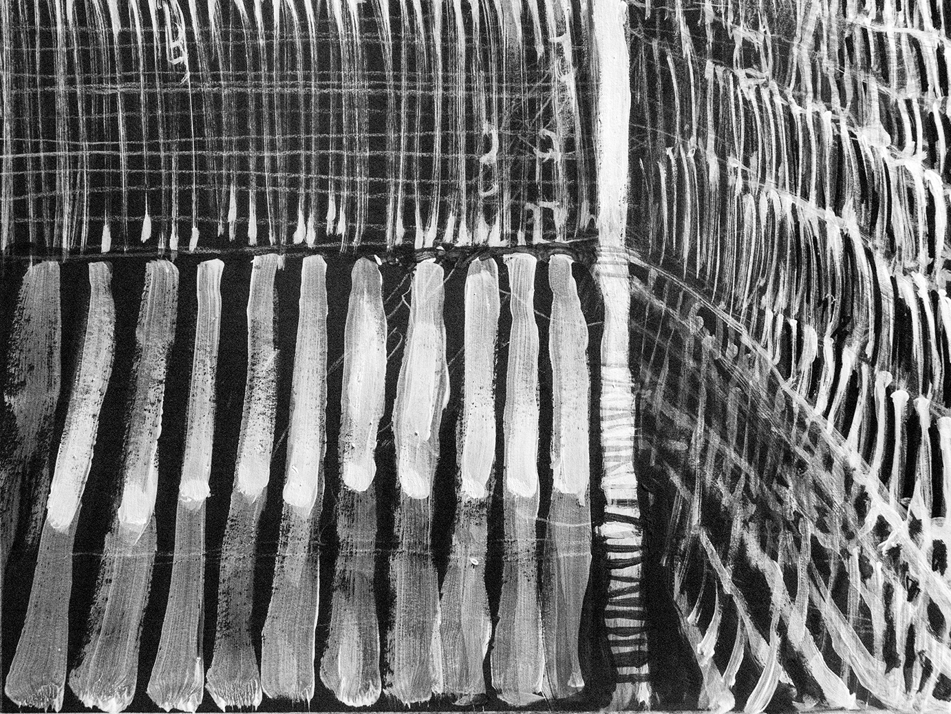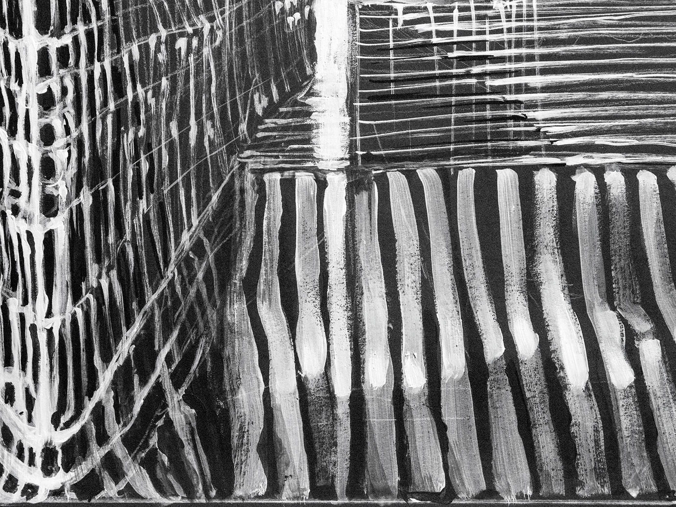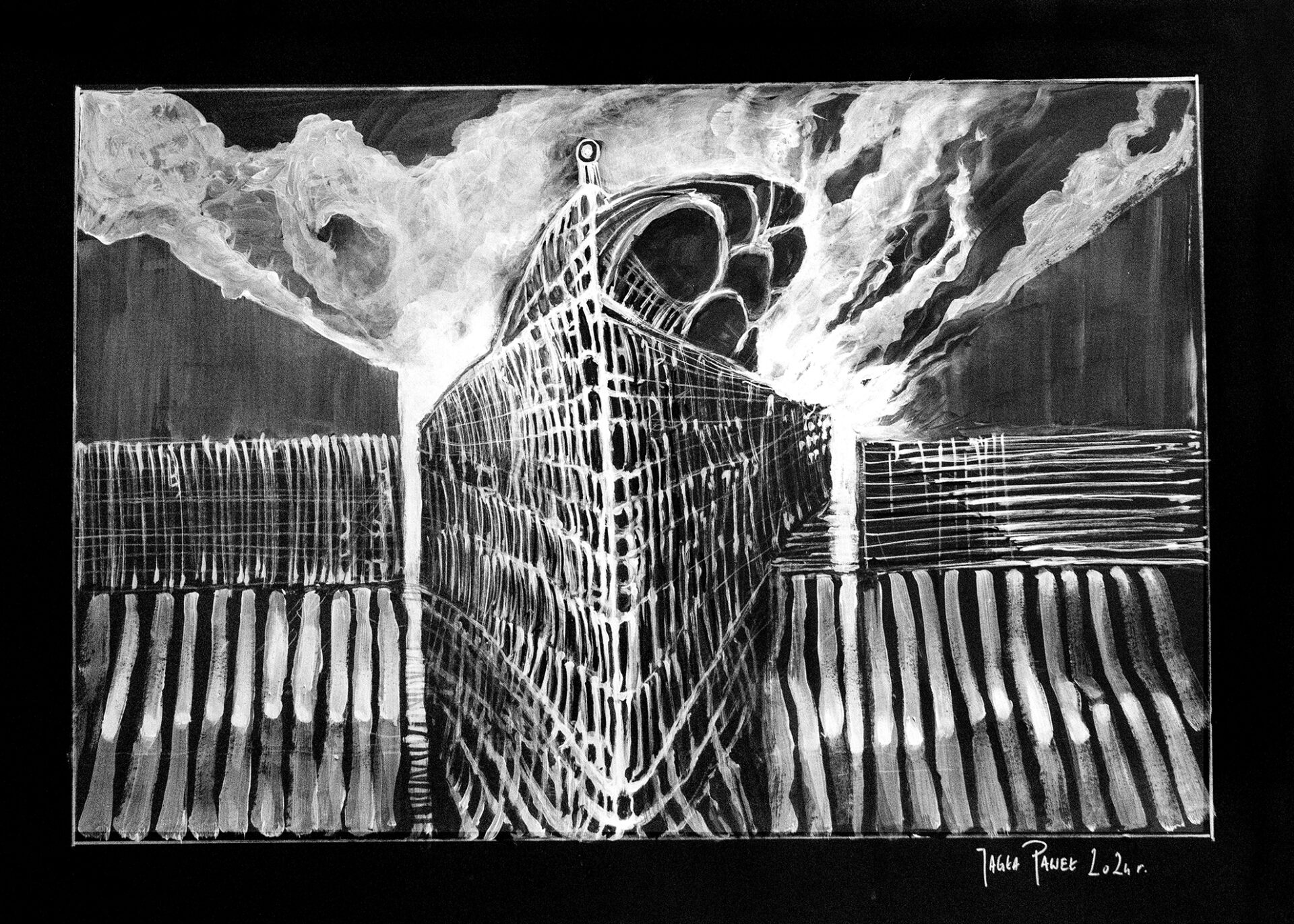 Farba akrylowa biała i czarna na papierze format 50×70 w oprawie aluminiowej czarnej pod szkłem.Praca autorska Paweł Jagła
