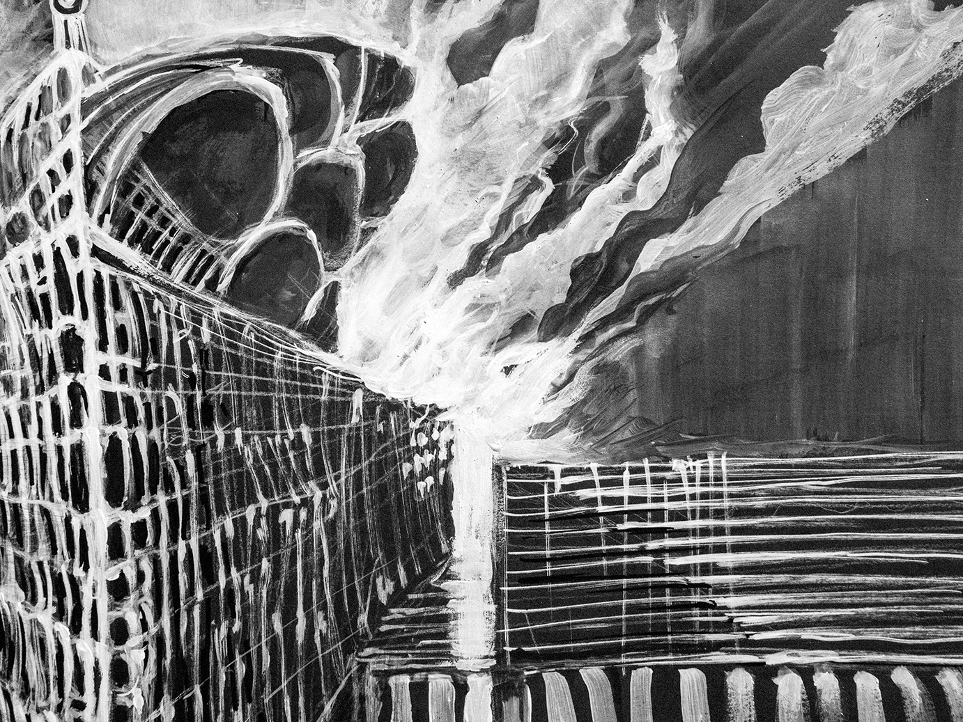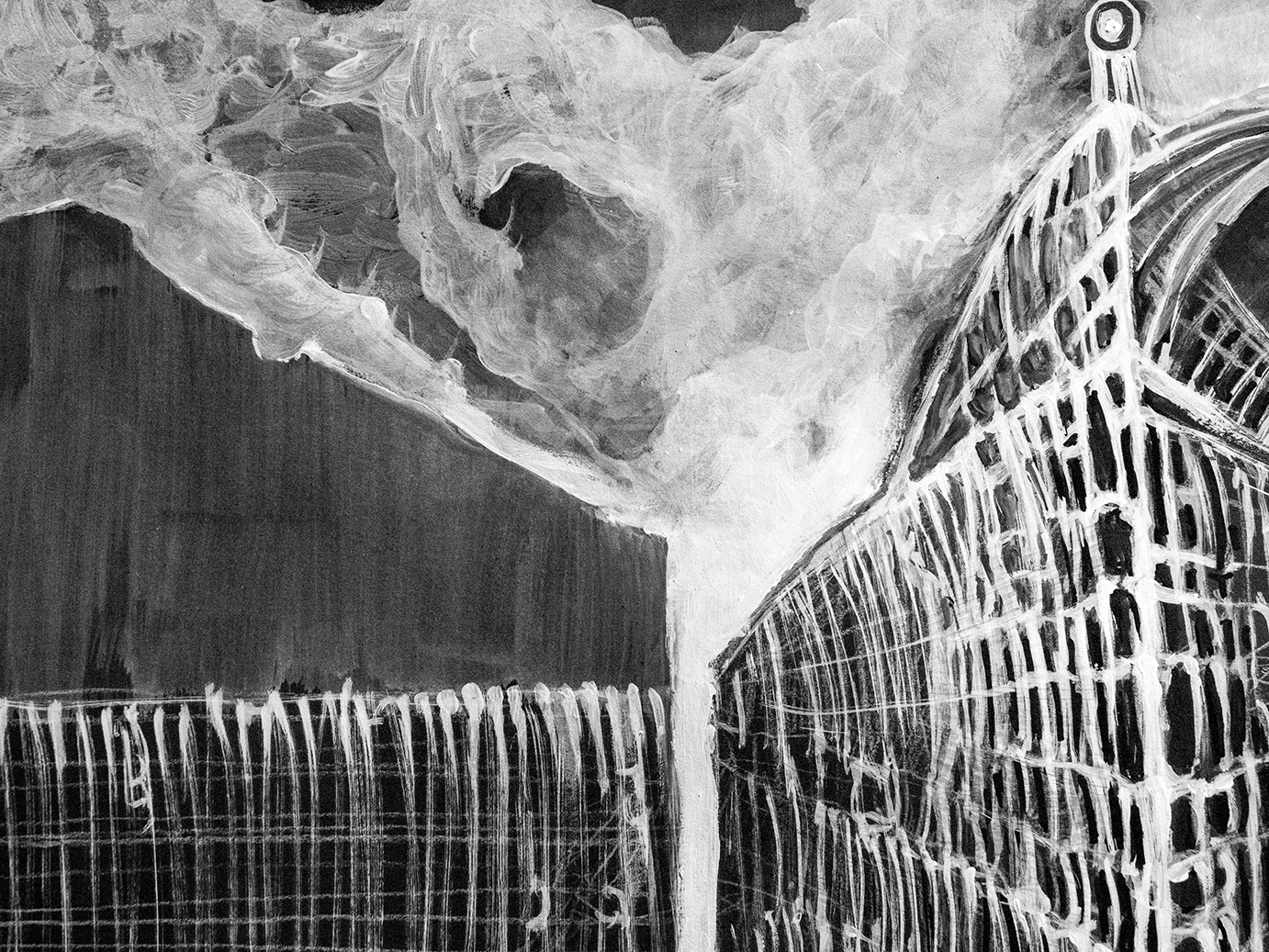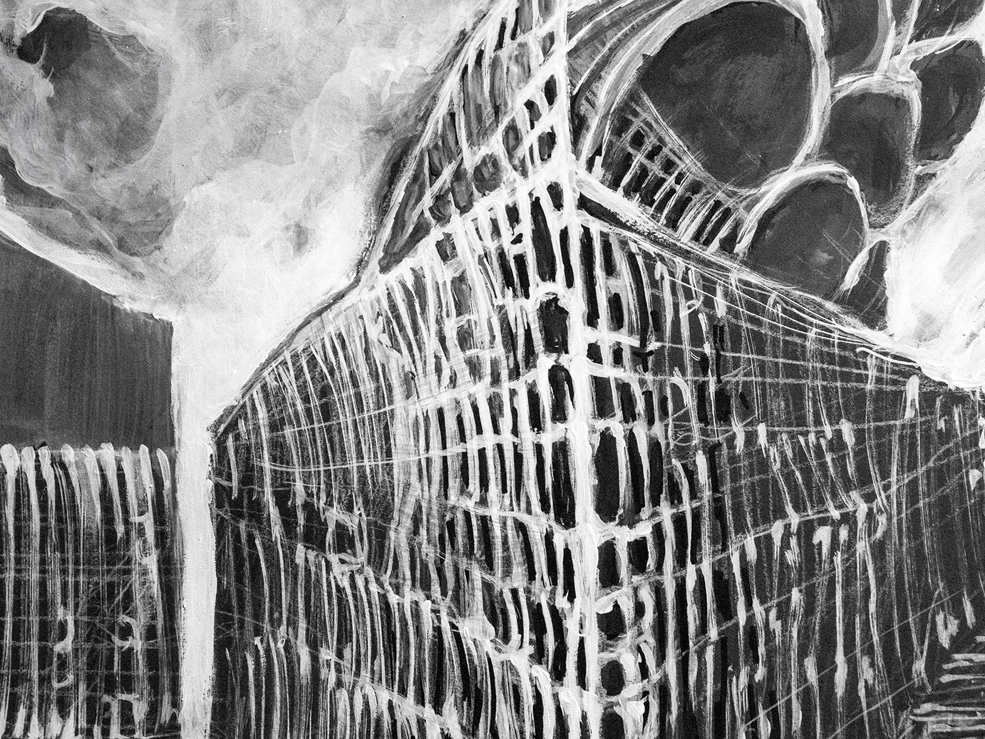Farba akrylowa biała i czarna na papierze format 50×70 w oprawie aluminiowej czarnej pod szkłem.Praca autorska Paweł Jagła