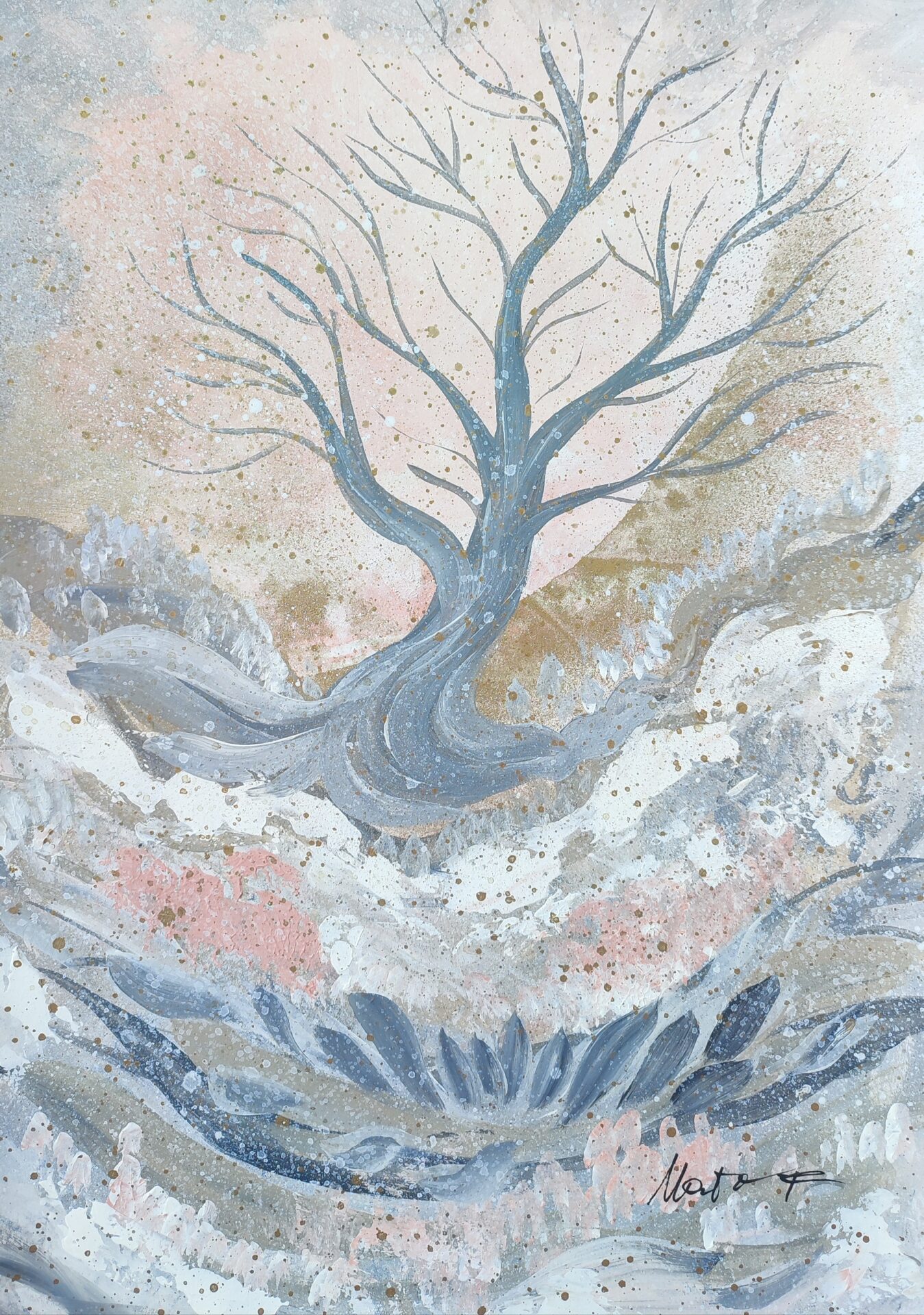 Obraz akrylowy wykonany na papierze o wysokiej jakości w technice własnej mieszanej. Praca inspirowana otaczającą nas naturą. Delikatne pastelowe kolory oraz odrobina złota, które pięknie mieni się w świetle dnia. Obraz można oprawić w białą Lub drewnianą ramę.