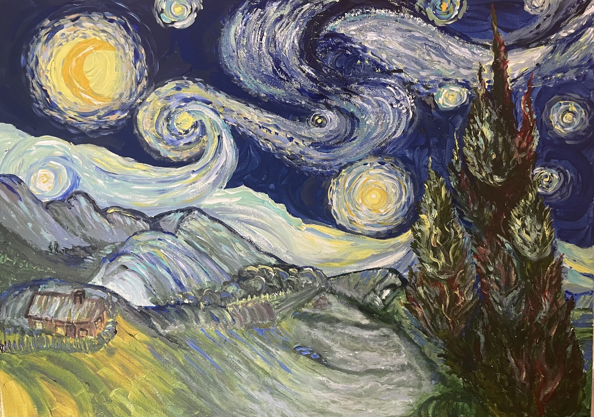 Podjęłam wyzwanie namalowania tego obrazu chcąc doświadczyć wrażenia jakie odczuwał Vincent malując jedyny swój obraz, który powstał z wyobraźni. Oddałam wymiar nieba za Vincentem tworząc szczególną atmosferę dramatycznej, kosmicznej gry rozgrywającej się na ciemnoniebieskim niebie, gdzie dwie olbrzymie, spiralne mgławice splatają się nawzajem z nienaturalnie powiększonymi gwiazdami otoczonych świetlistą aureol. Nierzeczywisty księżyc swoim kolorytem i wielkością wydaje się słońcem. Obraz skupia uwagę oglądającego na niebie, gwiazdach, poblasku zorzy skrzącej się pod nimi. Całość za górami. Na pierwszym planie po prawej stronie ognisty cyprys, a w dole dolina spowita mgłą, a na skraju doliny (po lewej stronie obrazu) znajduje się rozświetlona drewniana chata – emanująca ciepłem i dobrobytem