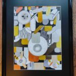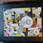 Obraz wykonany cienkopisami różnej grubości oraz kolorowymi metalicznymi pisakami.kolory szary, srebrny, żółty, oliwkowy, czarny. Cienkopisy wodoodporne i trwałe. Papier gruby, biały. Rozmiar obrazu 30×40 cm. Rama wymiary 54×43 cm.
