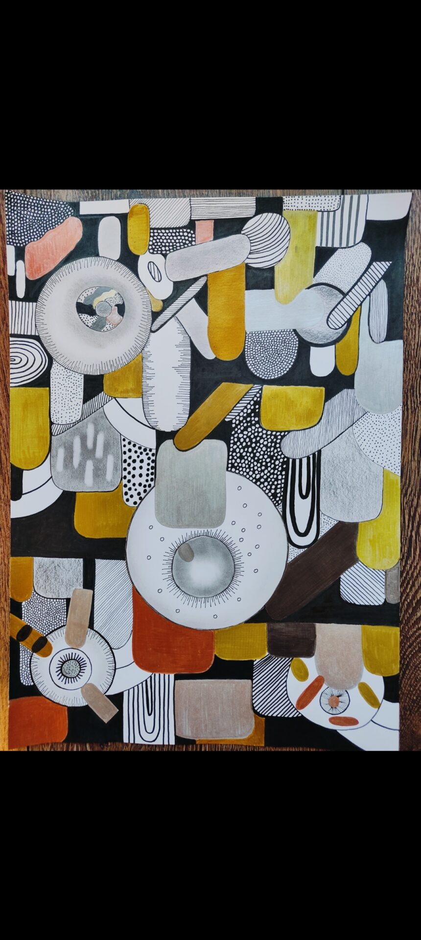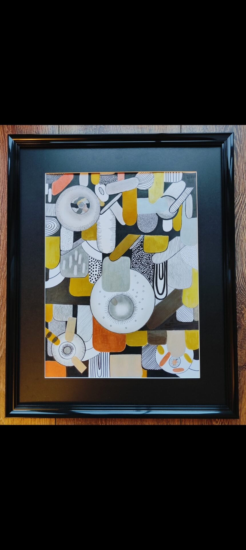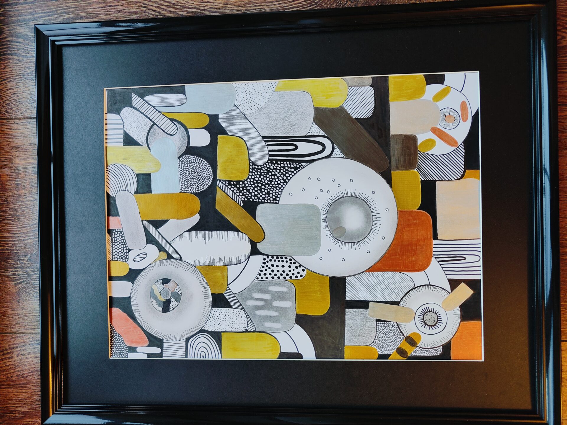 Obraz wykonany cienkopisami różnej grubości oraz kolorowymi metalicznymi pisakami.kolory szary, srebrny, żółty, oliwkowy, czarny. Cienkopisy wodoodporne i trwałe. Papier gruby, biały. Rozmiar obrazu 30×40 cm. Rama wymiary 54×43 cm.
