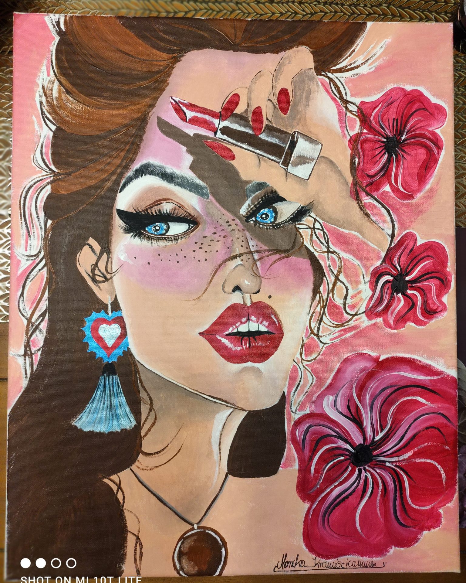 Obraz wykonany na płótnie. Namalowany farbami akrylowymi. Wymiary obrazu to 50 cm wysokość na 40 cm szerokości.