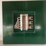Płyta MDF oklejana blachą aluminiową, lakierowaną. Na skrzydłach bocznych płaskorzeźba (żywica patynowana). Obraz wewnętrzny akryl. Sygnowany Kapica 2022.