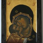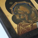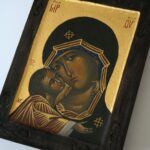 Mam do sprzedania ikonę Matki Boskiej z Dzieciątkiem – Eleusa, namalowaną przeze mnie ręcznie, tradycyjną metodą pisania ikon. Ikona została namalowana w technice temperowo-jajowej (naturalnymi pigmentami rozcieńczanymi żółtkiem) na desce lipowej, zagruntowanej gruntem z kleju kostnego oraz kredy. W kowczegu delikatny ornament kwiatowy wyrzeźbiony dłutem. Złocenia wykonane z płatków 24 karatowego złota. Część złocona i malowana pokryta odpowiednimi werniksami. Wymiary ikony to 20cm x 27cm x 2,5cm.