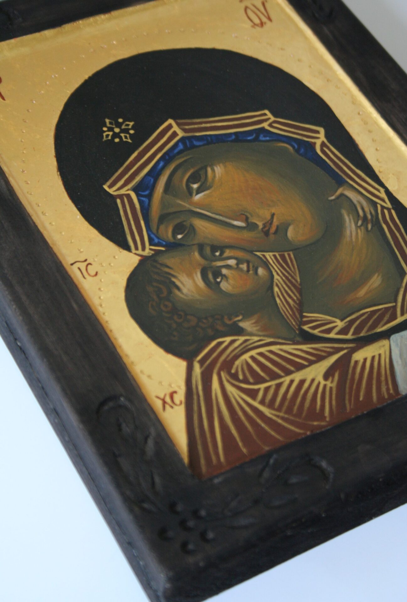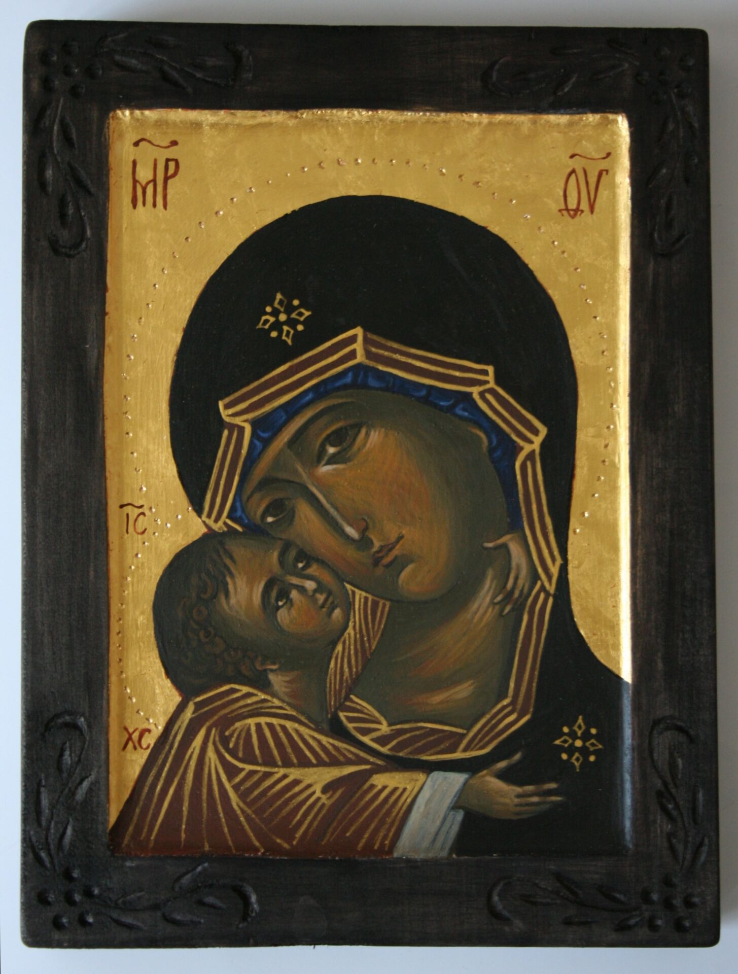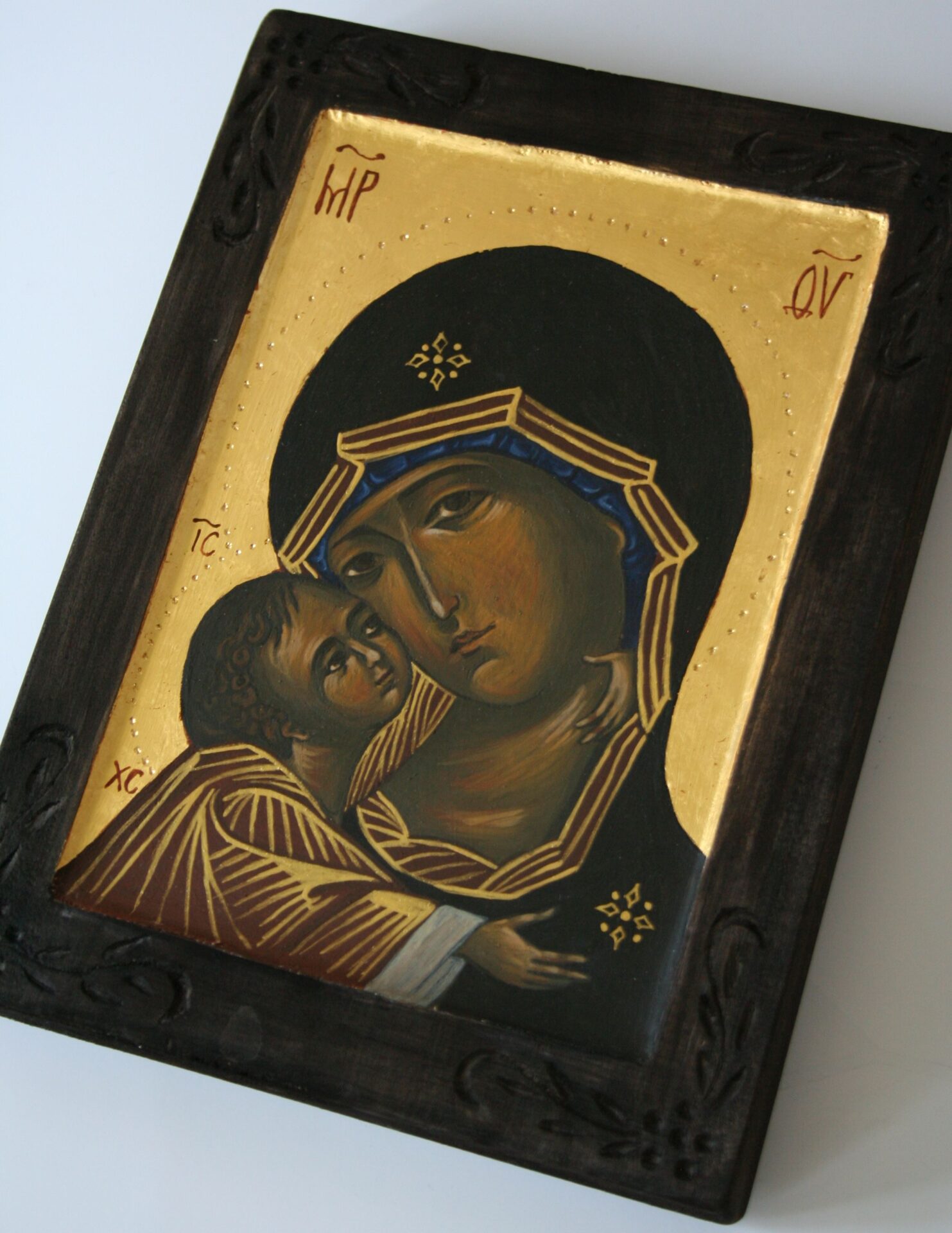 Mam do sprzedania ikonę Matki Boskiej z Dzieciątkiem – Eleusa, namalowaną przeze mnie ręcznie, tradycyjną metodą pisania ikon. Ikona została namalowana w technice temperowo-jajowej (naturalnymi pigmentami rozcieńczanymi żółtkiem) na desce lipowej, zagruntowanej gruntem z kleju kostnego oraz kredy. W kowczegu delikatny ornament kwiatowy wyrzeźbiony dłutem. Złocenia wykonane z płatków 24 karatowego złota. Część złocona i malowana pokryta odpowiednimi werniksami. Wymiary ikony to 20cm x 27cm x 2,5cm.