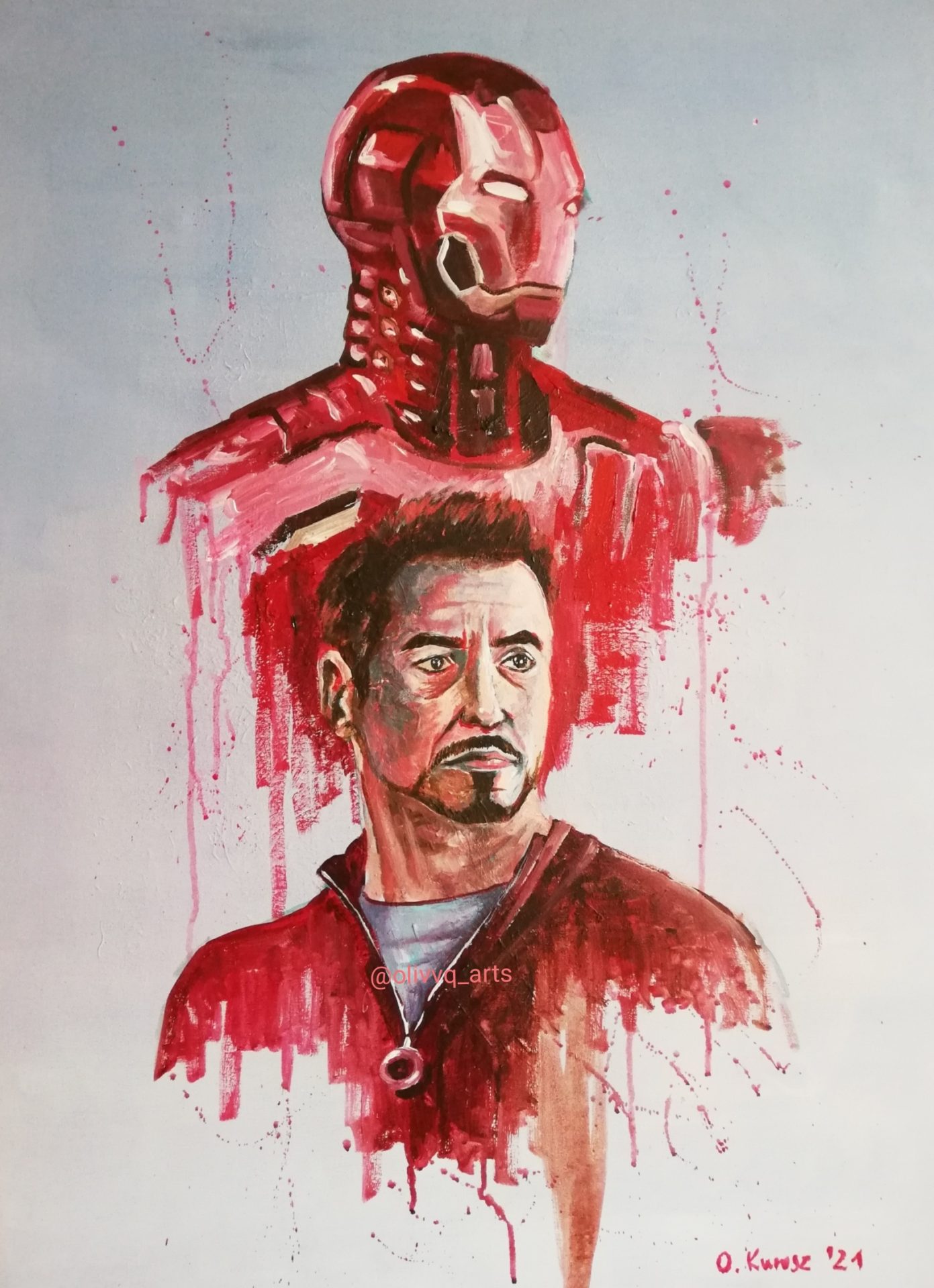 Iron Man namalowany w 2021 roku, na grubym płótnie 100×70 cm. Było to moje pierwsze podejście do portretu.