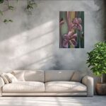 Praca w barwach pastelowych przedstawiając irysy w indywidualny sposób. Obraz pasuje zarówno do wnętrz nowoczesnych, jak i klasycznych. Namalowany farbami akrylowymi na płótnie lnianym. Praca nie wymaga ramy, boczne krawędzie płótna zamalowane co pozwala na bezpośrednie zawieszenie na ścianie. Sygnowany na odwrotnej stronie.
