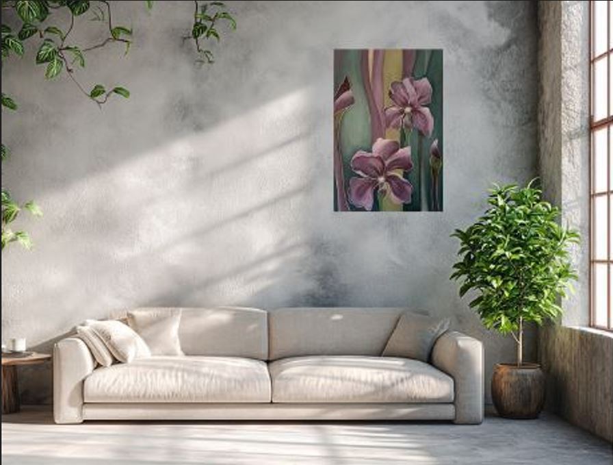 Praca w barwach pastelowych przedstawiając irysy w indywidualny sposób. Obraz pasuje zarówno do wnętrz nowoczesnych, jak i klasycznych. Namalowany farbami akrylowymi na płótnie lnianym. Praca nie wymaga ramy, boczne krawędzie płótna zamalowane co pozwala na bezpośrednie zawieszenie na ścianie. Sygnowany na odwrotnej stronie.
