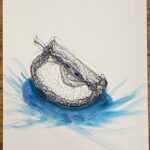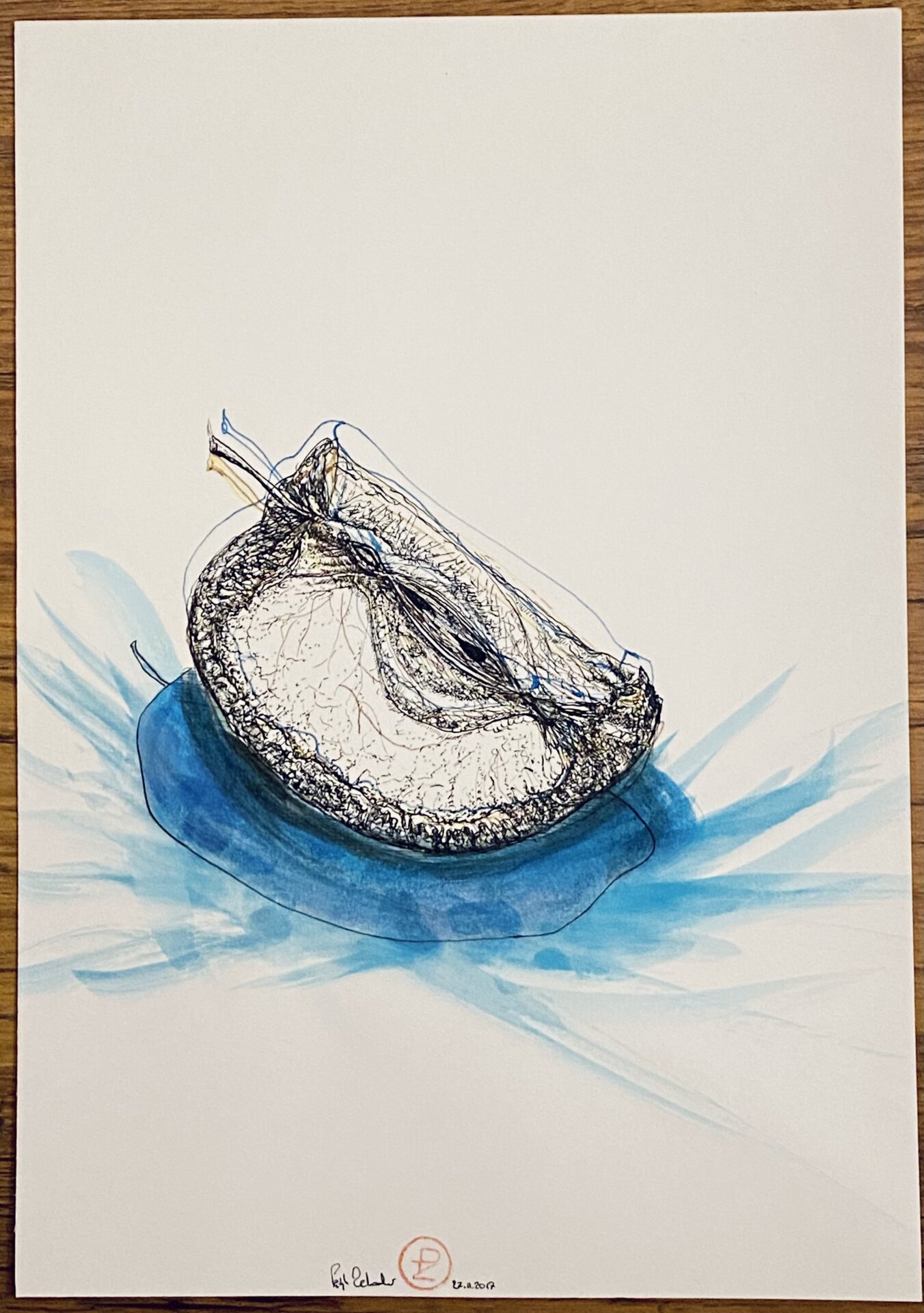 Rysunek piórkiem. Barwny tusz na papierze. Praca wymknęła się z cyklu „Przedmioty w ostrym świetle” i stanowi samodzielny byt . Praca sygnowana podpisem i stemplem.