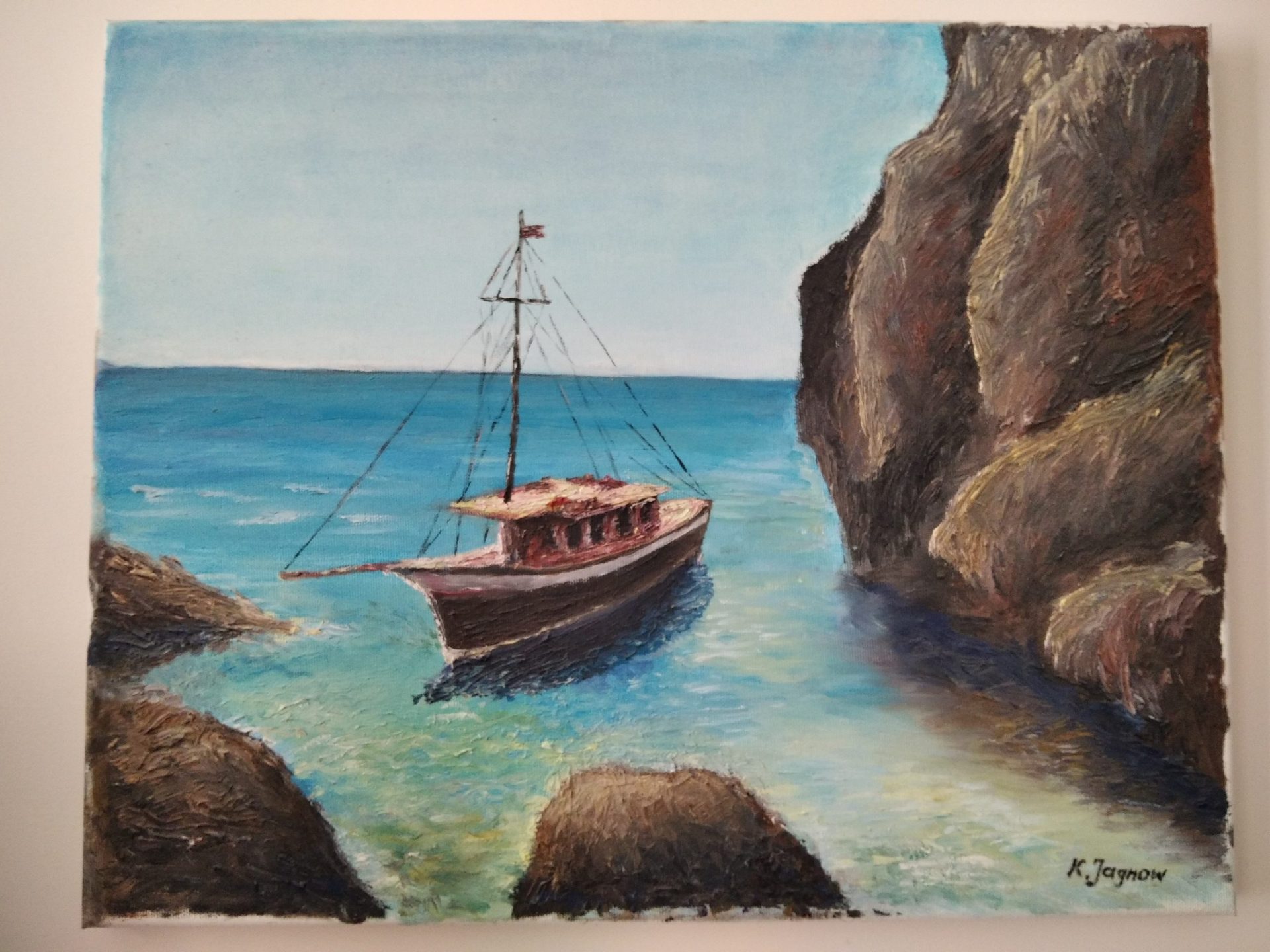Obraz olejny, na płótnie o wymiarach 40x50cm, przedstawiający jacht przy skalistym wybrzeżu.
