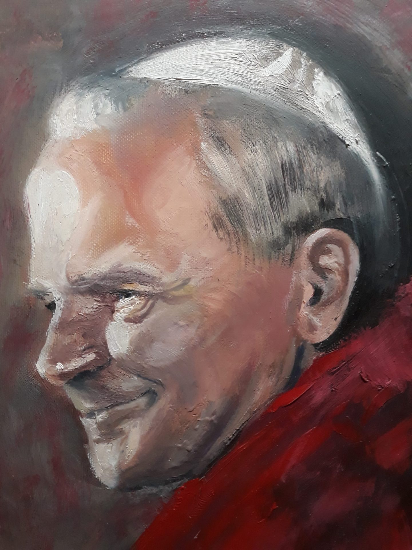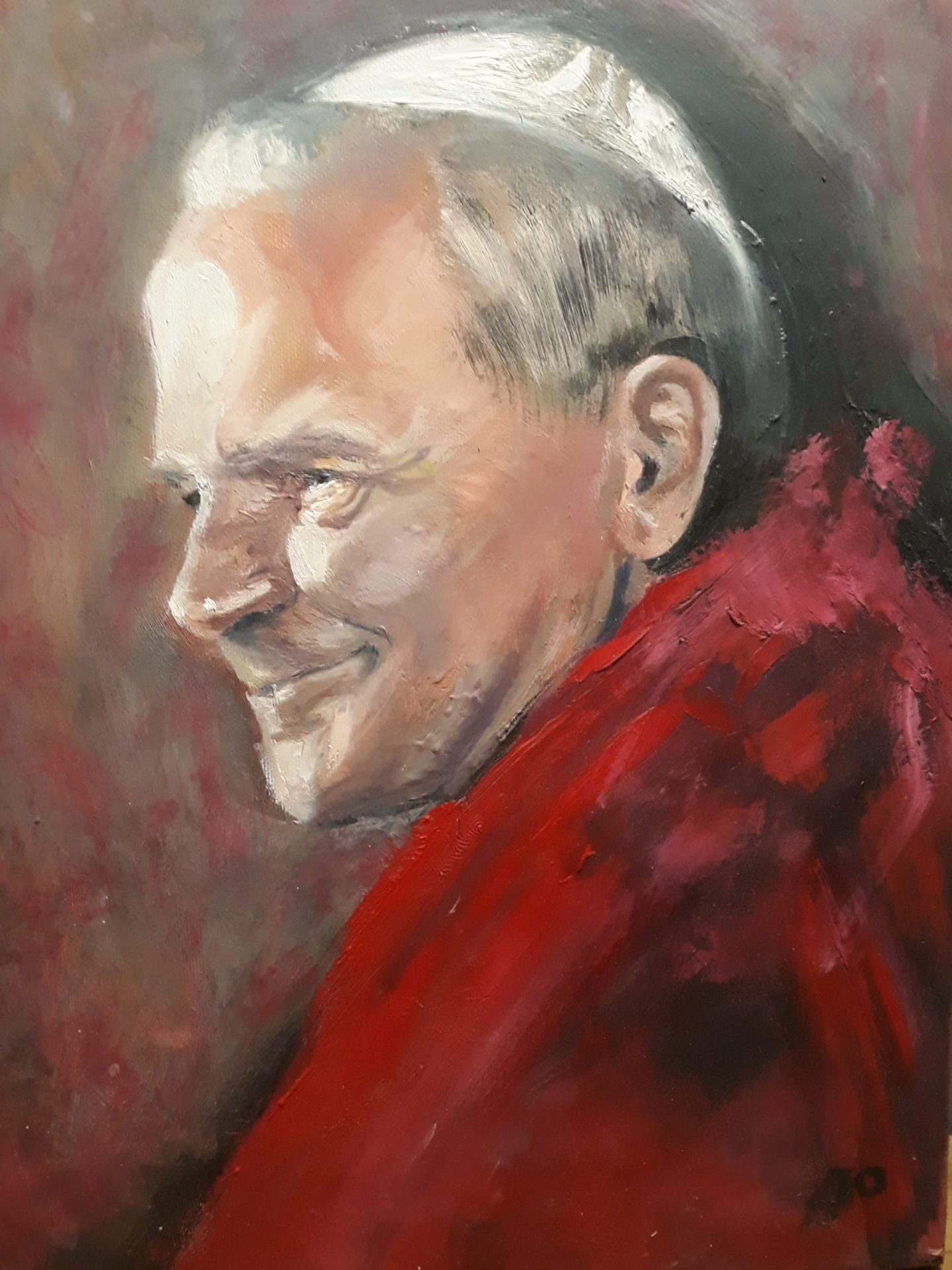 Portret realistyczny, przedstawiający Jana Pawła II na początku pontyfikatu, w 1980 roku, namalowany techniką olejną na płótnie o rozmiarach 30x40cm na podstawie fotografii autorstwa Arturo Mari.
