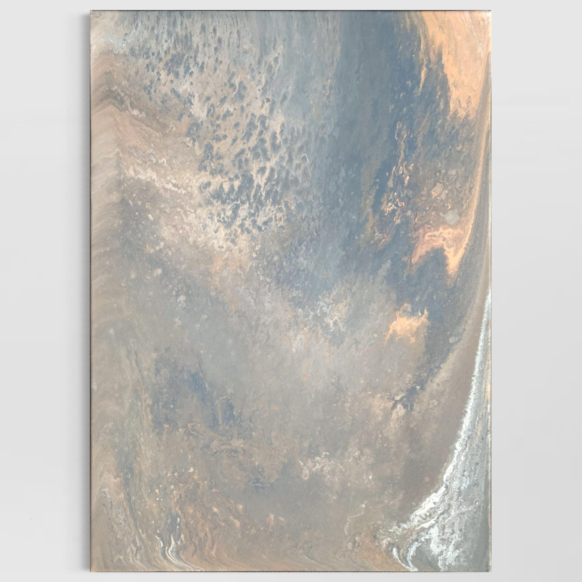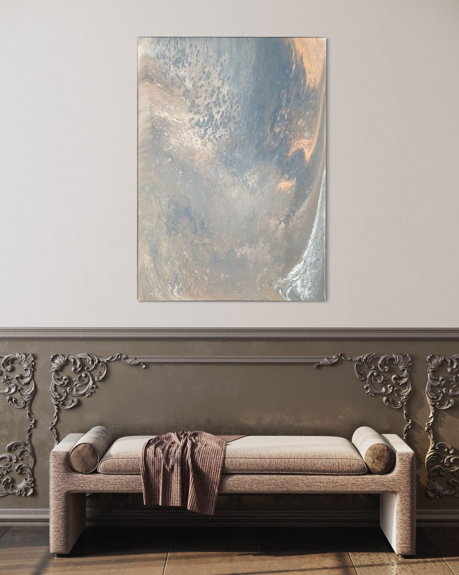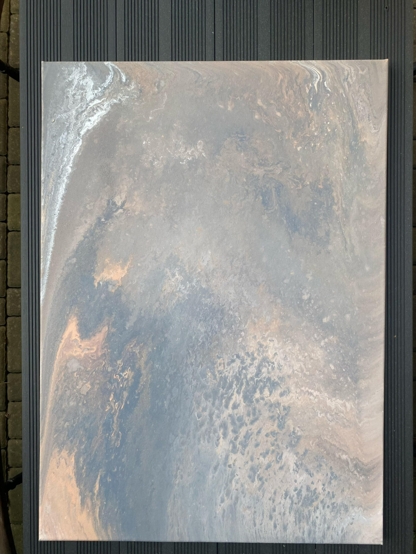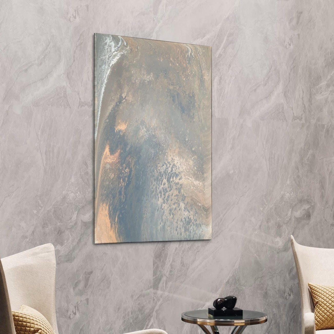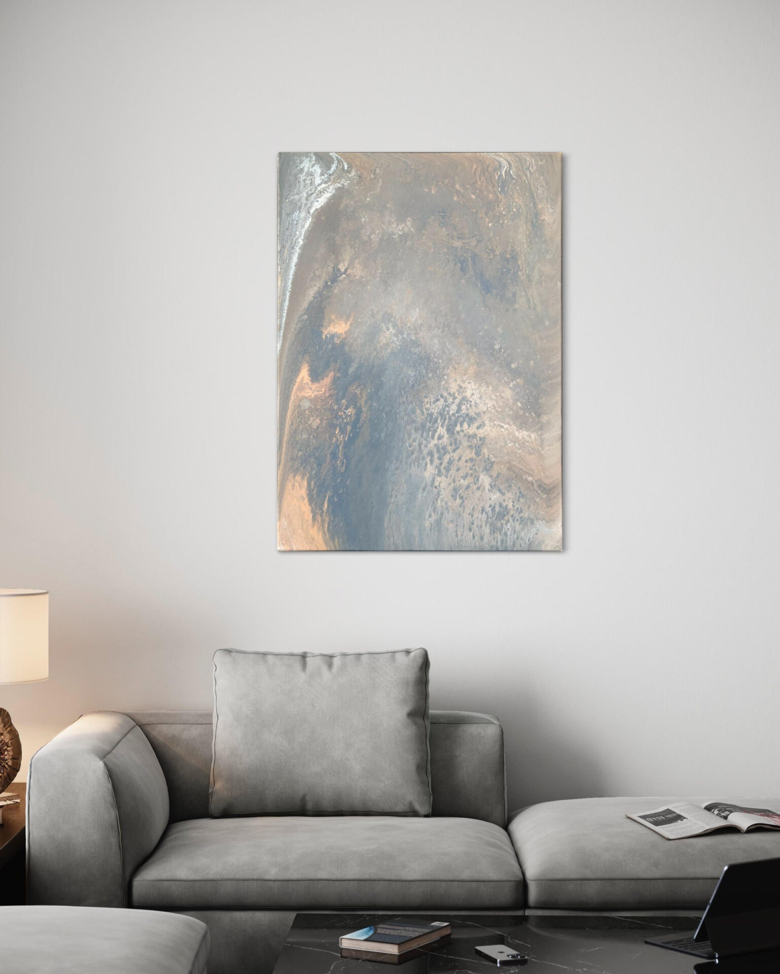 Obraz o wymiarach 70x50x1,5 cm, zatytułowany Jaspis Pejzażowy w Środku. Ta niezwykła kompozycja przypomina płytę szarą lub kamień o takiej samej nazwie. Obraz został wykonany na płótnie bawełnianym o wykończeniu matowym, co nadaje mu nowoczesny charakter i czyni go idealnym dodatkiem do większości wnętrz.