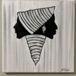 Obraz olejny na płótnie przedstawia dwie profile postaci ustawione tyłem do siebie, wpisane w kształt przypominający kontur Afryki. Kompozycja jest symetryczna, z wyrazistymi kontrastami czerni i bieli oraz detalem w postaci spiralnej ozdoby. Gra linii i kształtów nadaje pracy wymiar abstrakcyjny i głęboko symboliczny, nawiązujący do kultury i tożsamości.