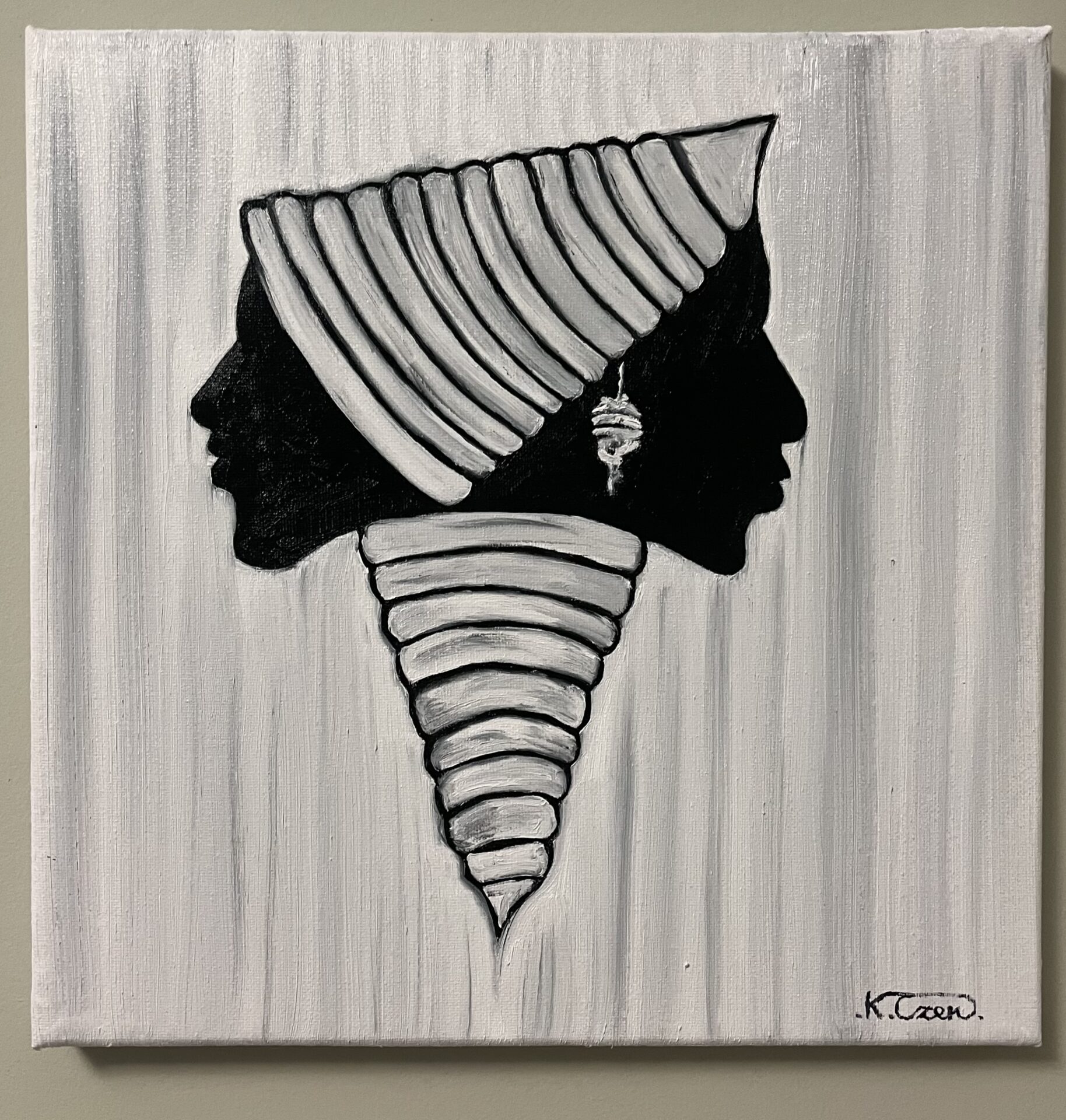 Obraz olejny na płótnie przedstawia dwie profile postaci ustawione tyłem do siebie, wpisane w kształt przypominający kontur Afryki. Kompozycja jest symetryczna, z wyrazistymi kontrastami czerni i bieli oraz detalem w postaci spiralnej ozdoby. Gra linii i kształtów nadaje pracy wymiar abstrakcyjny i głęboko symboliczny, nawiązujący do kultury i tożsamości.