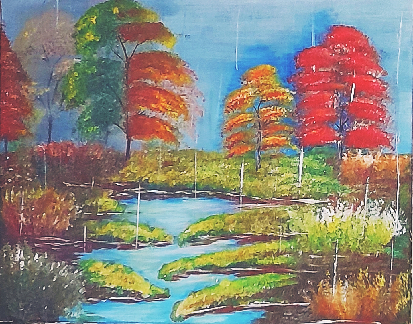 „Jesienny pejzaż w deszczu ” powstał podczas tuturialu z Kingą Krzyś. Farby akrylowe, 40×50.