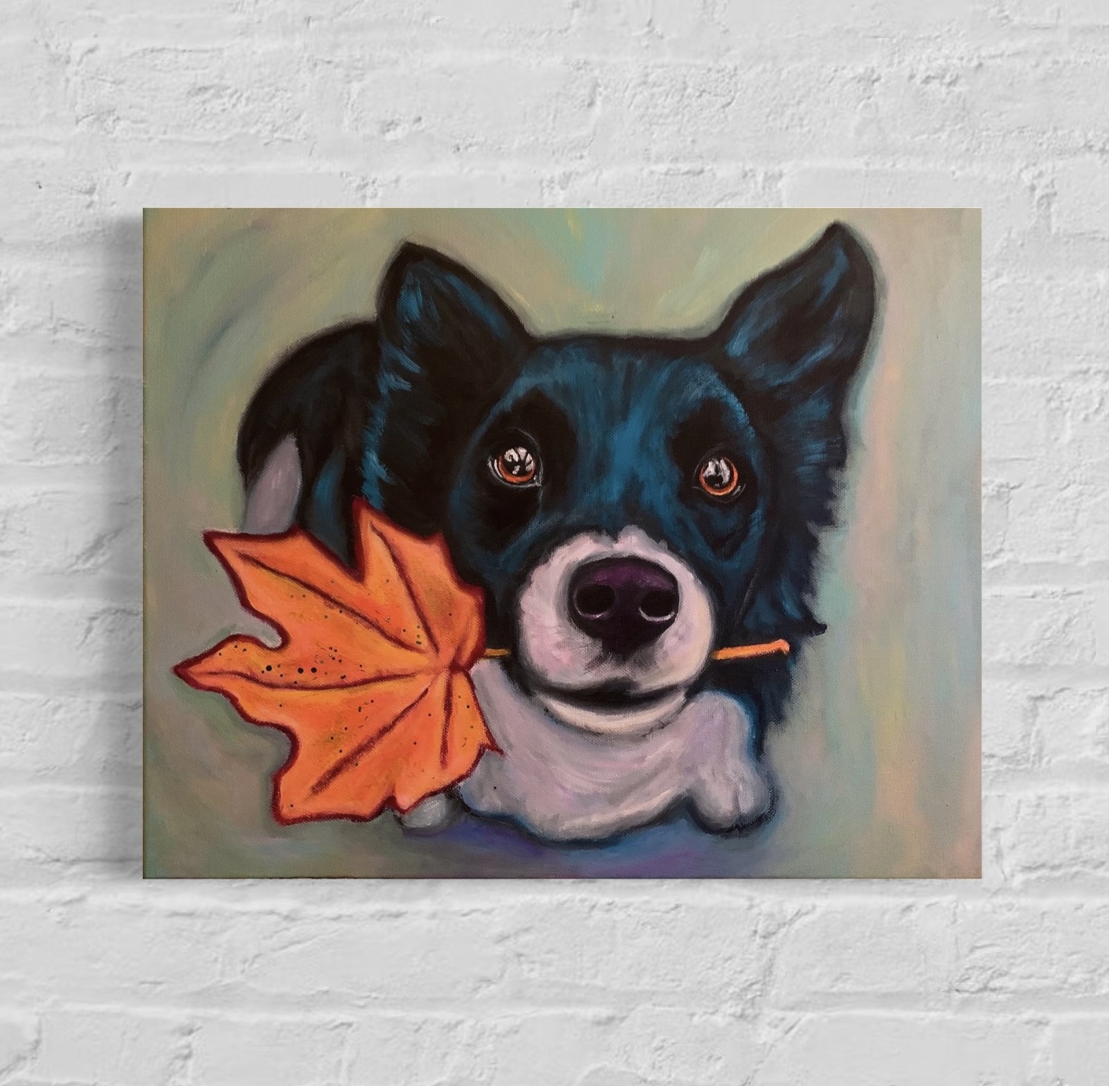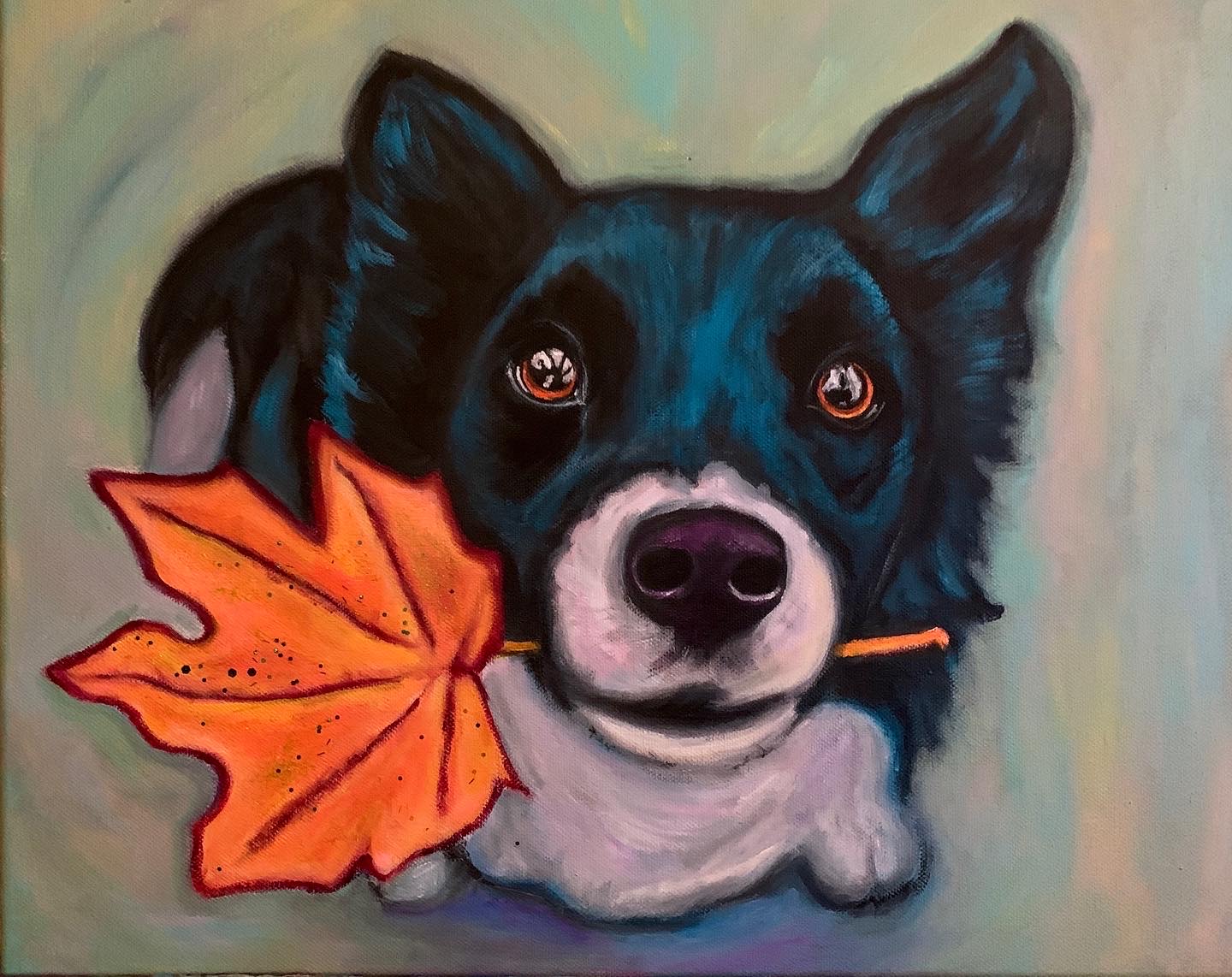 Piękny obraz jesiennego pieska malowany ręcznie akrylami na płótnie. Wymiary – 50 x 40 cm