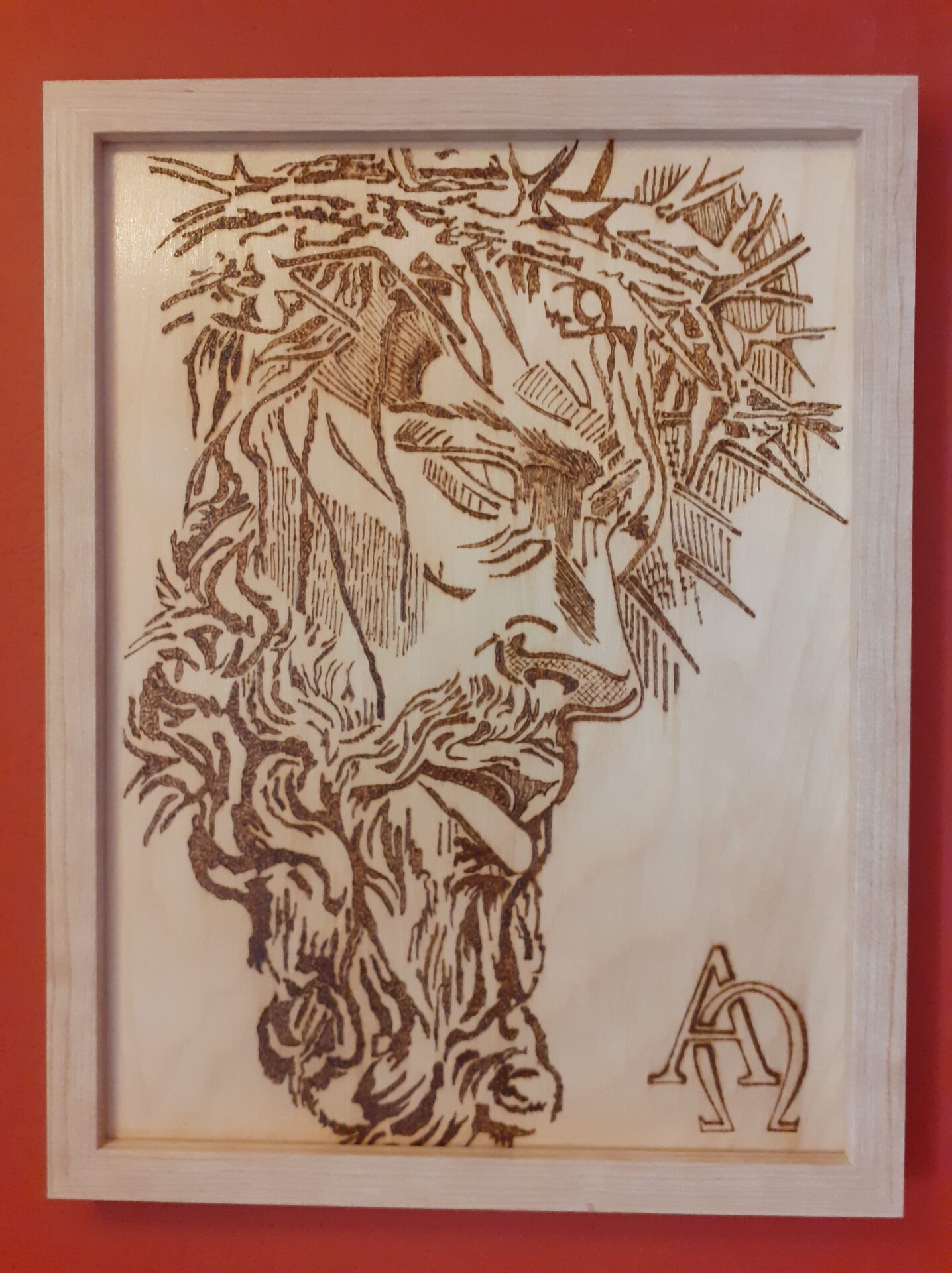 Jesus 1 recznie wypalany obraz na drewnianej sklejce ( grubość sklejki 3mm ). Obraz jest lakierowany co nadaje piekny efekt i gwarancje trwalości. Wymiar 30×40 sm + rama.