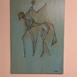 Subtelne połączenie figuratywności z abstrakcją. Obraz przedstawia smukłe, geometryczne postacie jeźdźca i konia na tle chłodnych, zielono-niebieskich tonacji z akcentami ciepłych odcieni pomarańczu. Minimalistyczna forma i delikatne pociągnięcia pędzla nadają dziełu lekkości i elegancji.