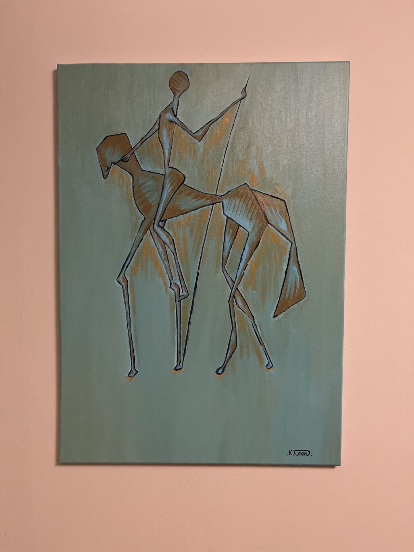 Subtelne połączenie figuratywności z abstrakcją. Obraz przedstawia smukłe, geometryczne postacie jeźdźca i konia na tle chłodnych, zielono-niebieskich tonacji z akcentami ciepłych odcieni pomarańczu. Minimalistyczna forma i delikatne pociągnięcia pędzla nadają dziełu lekkości i elegancji.