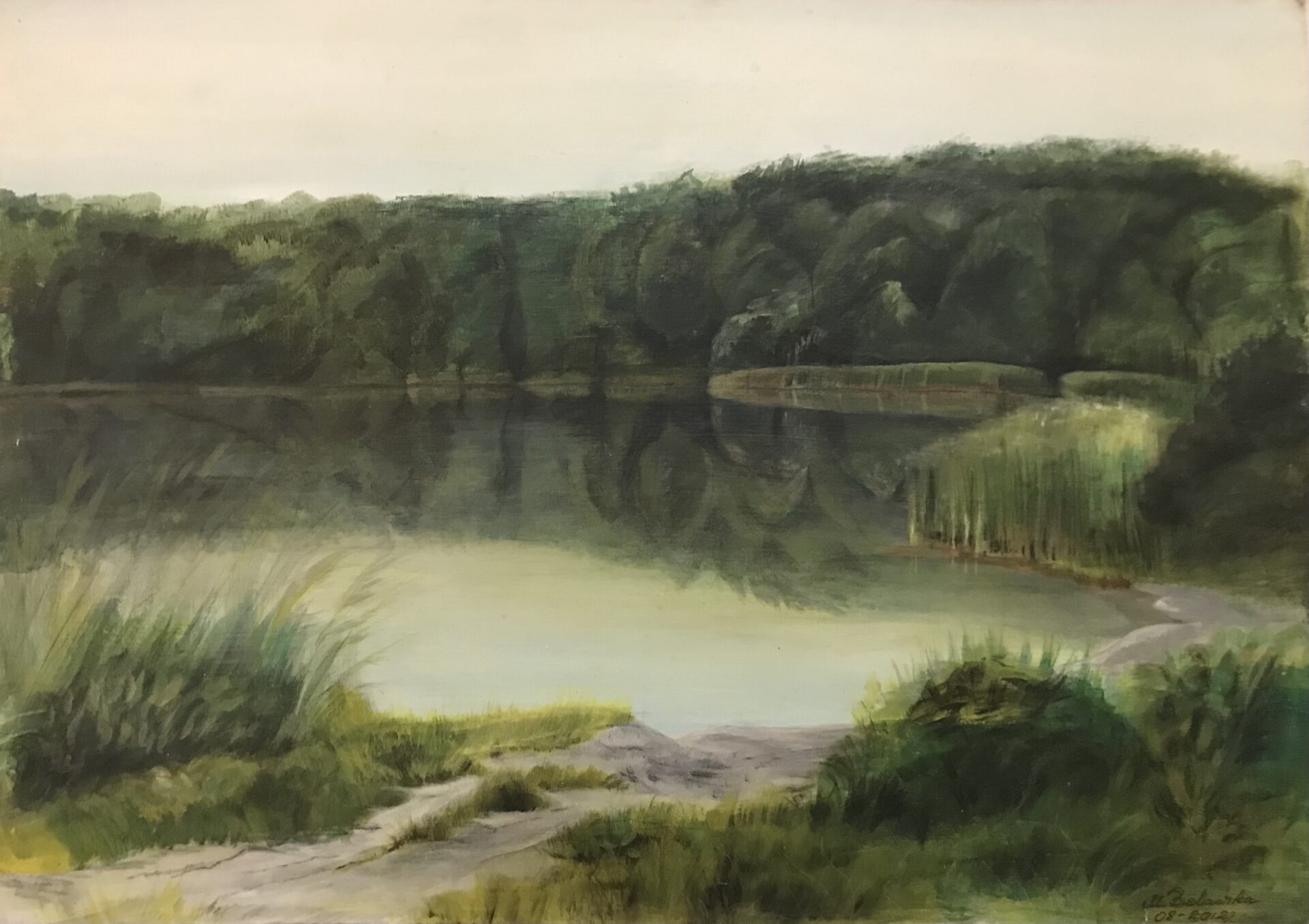 Praca poplenerowa, powstała na plenerze organizowanym przez poznańskiego grafika Andrzeja Kandziorę w sierpniu 2012 roku w Glince Szlacheckiej. Przedstawia jezioro Brzostek położone nieopodal.