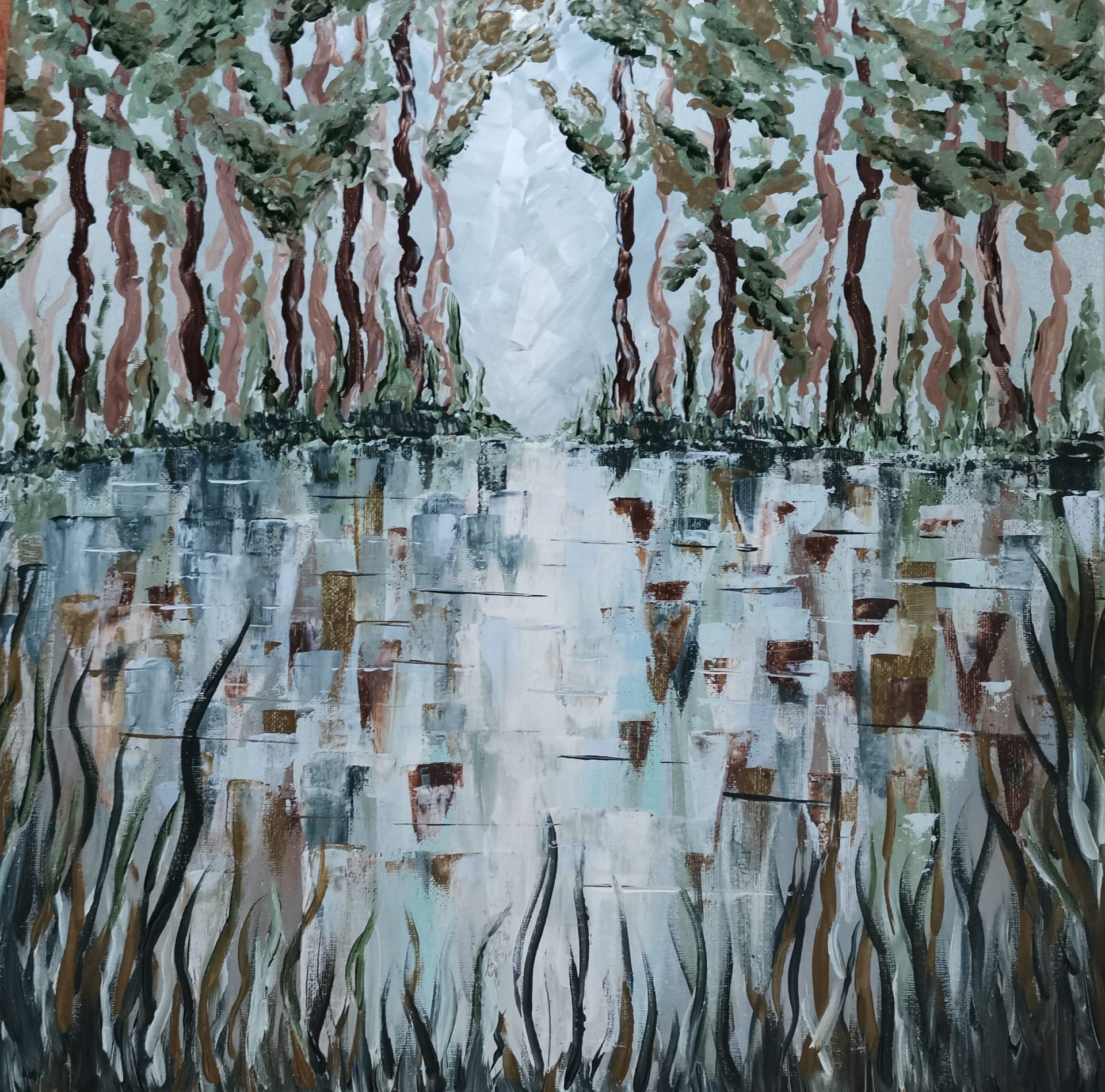 Obraz malowany farbami akrylowymi na podobraziu malarskim. Jest zawerniksowany, a boki zamalowane. Wymiary to 30×40 cm.