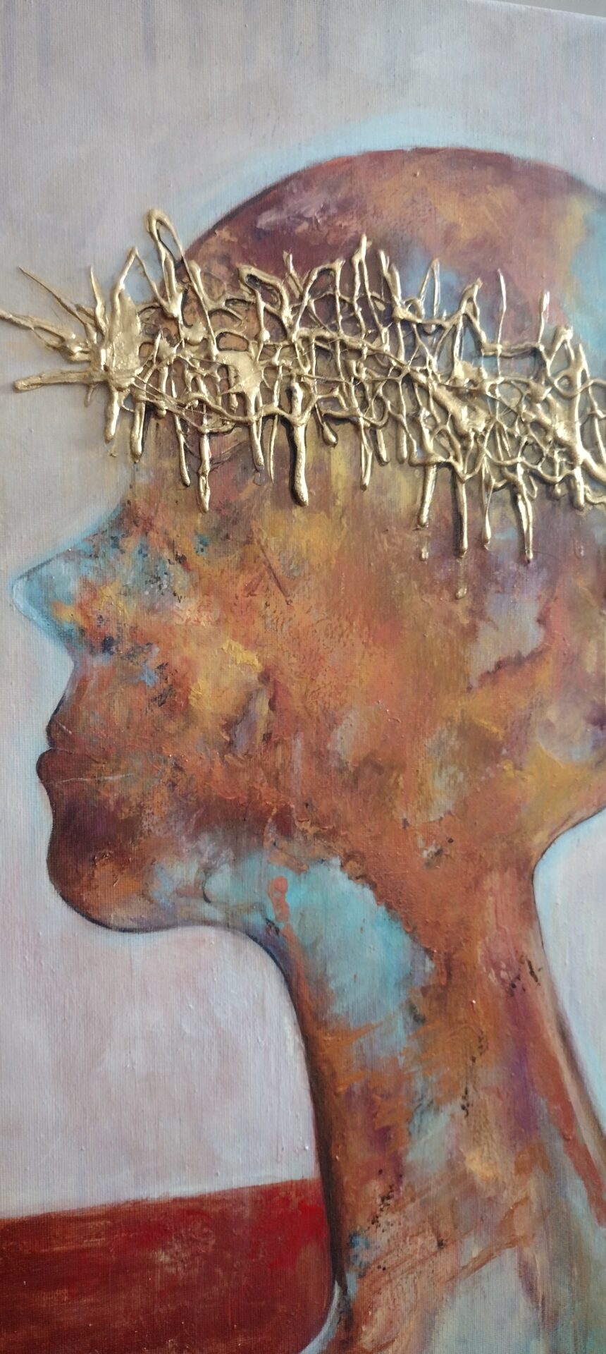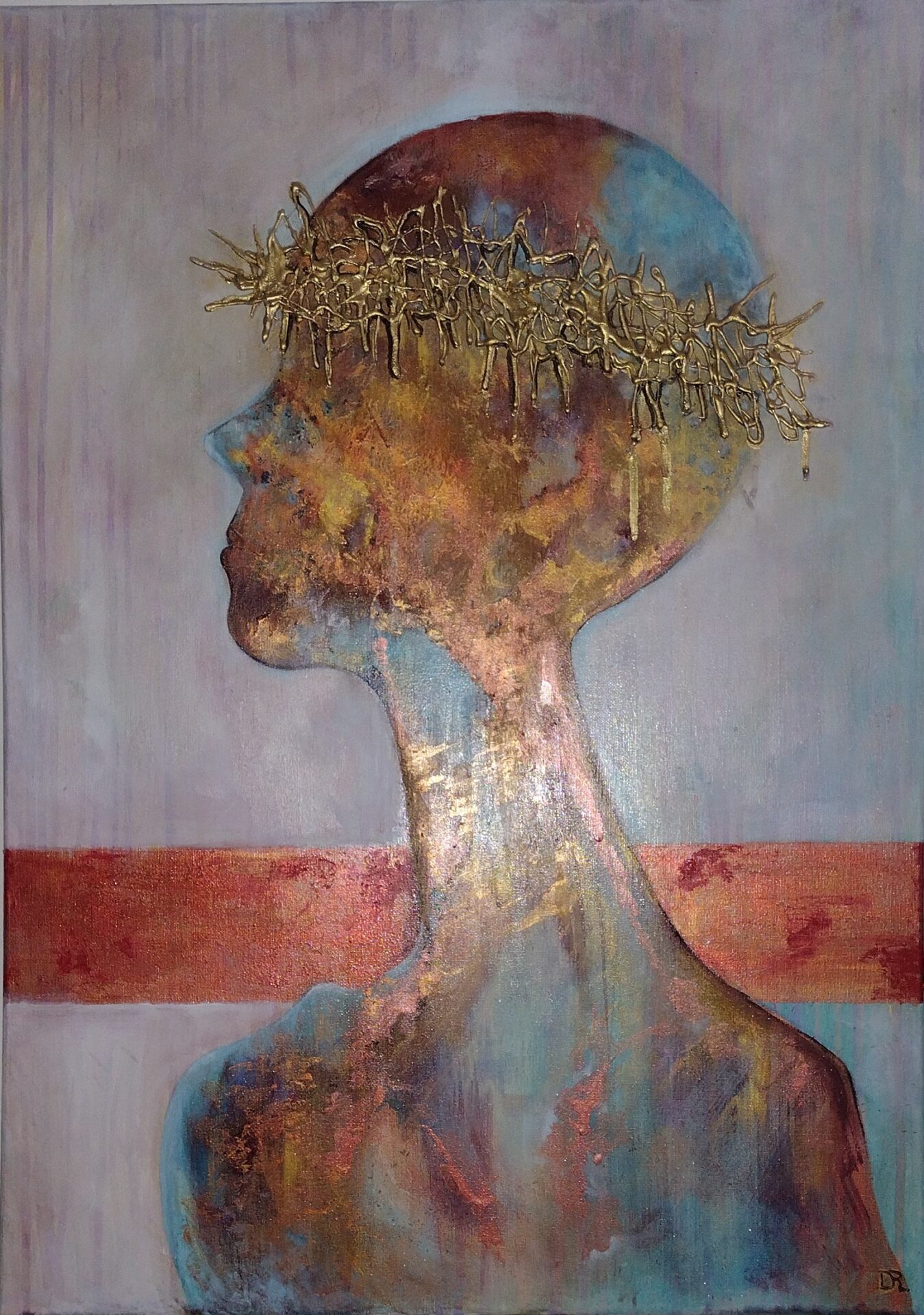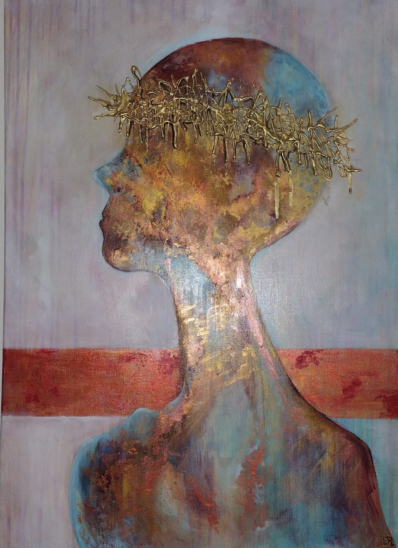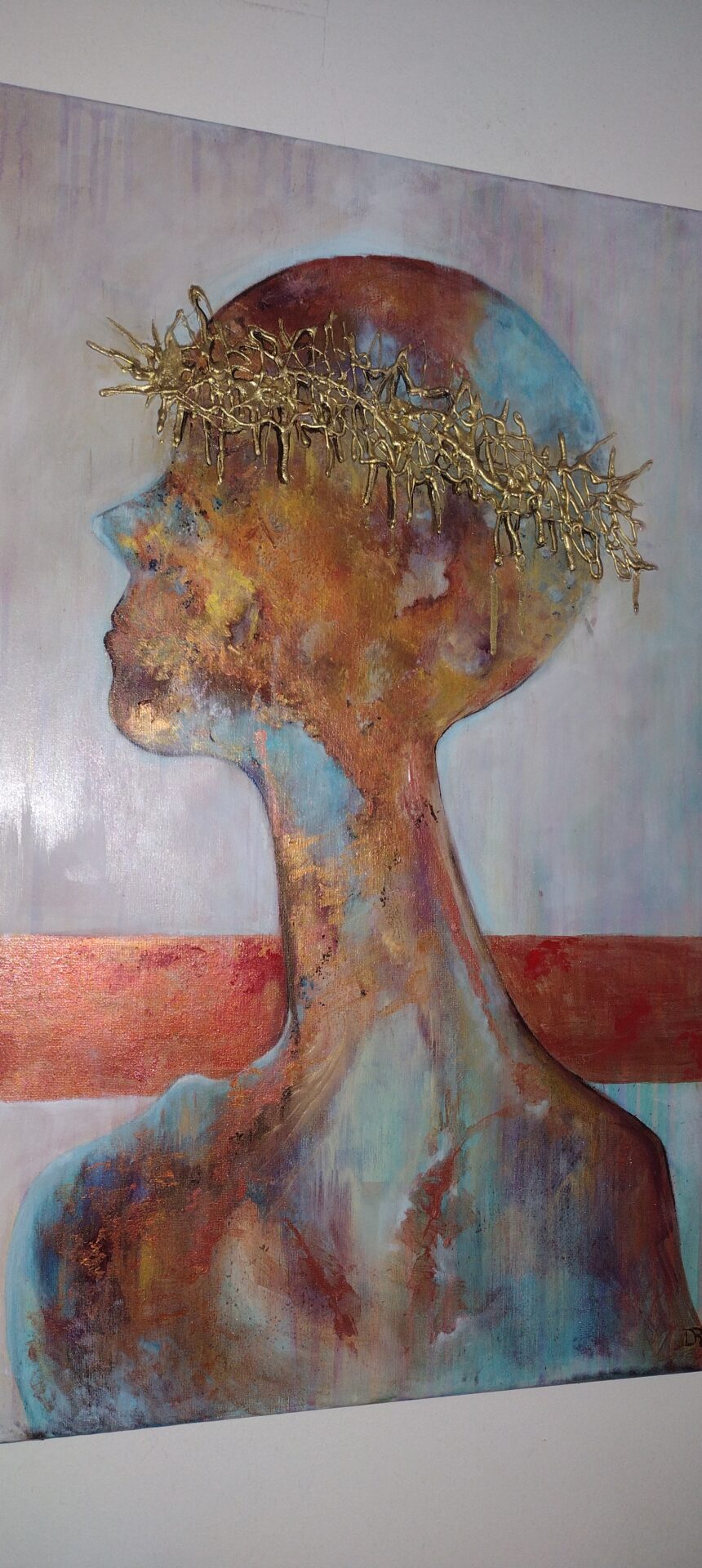 Witam .Przedstawiam nowoczesny obraz wykonany w technice olejnej na podobraziu płóciennym bawełnianym .Miejscami wyraźniejsza,grubsza faktura a „korona cierniowa „uwidoczniona najbardziej .W obrazie wykorzystano kilka odcieni koloru miedzianego oraz złotego .