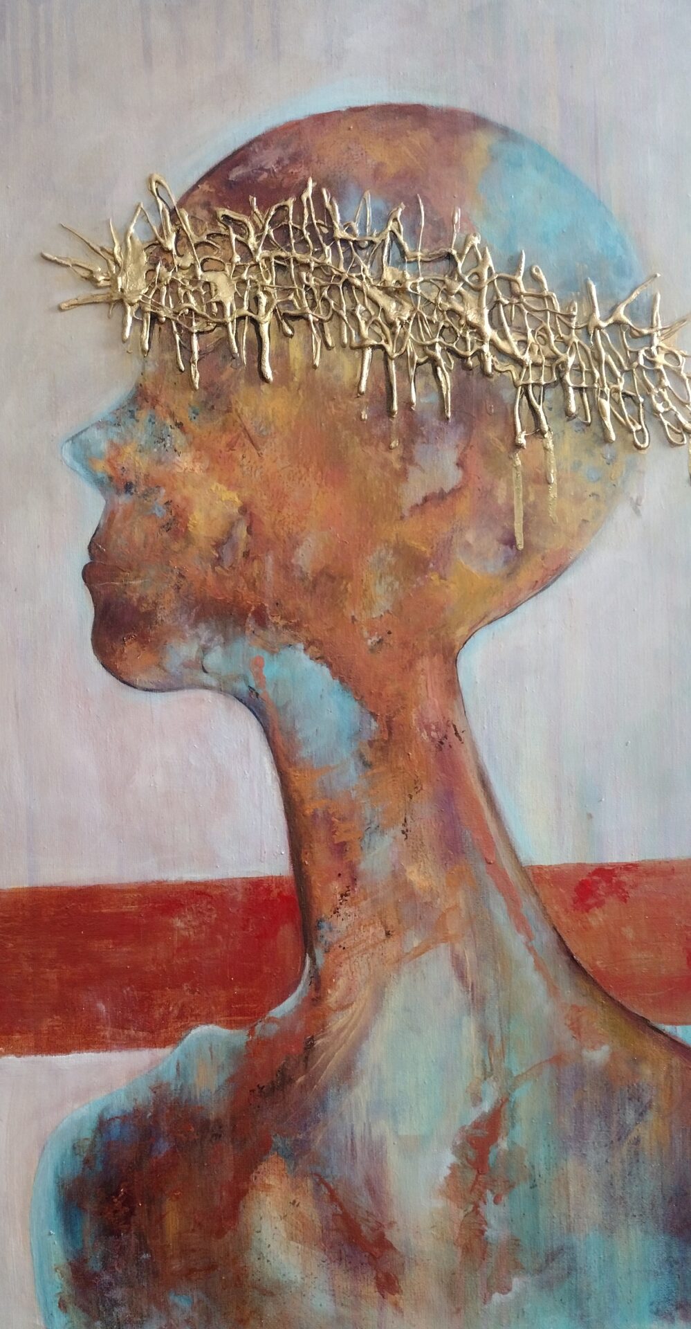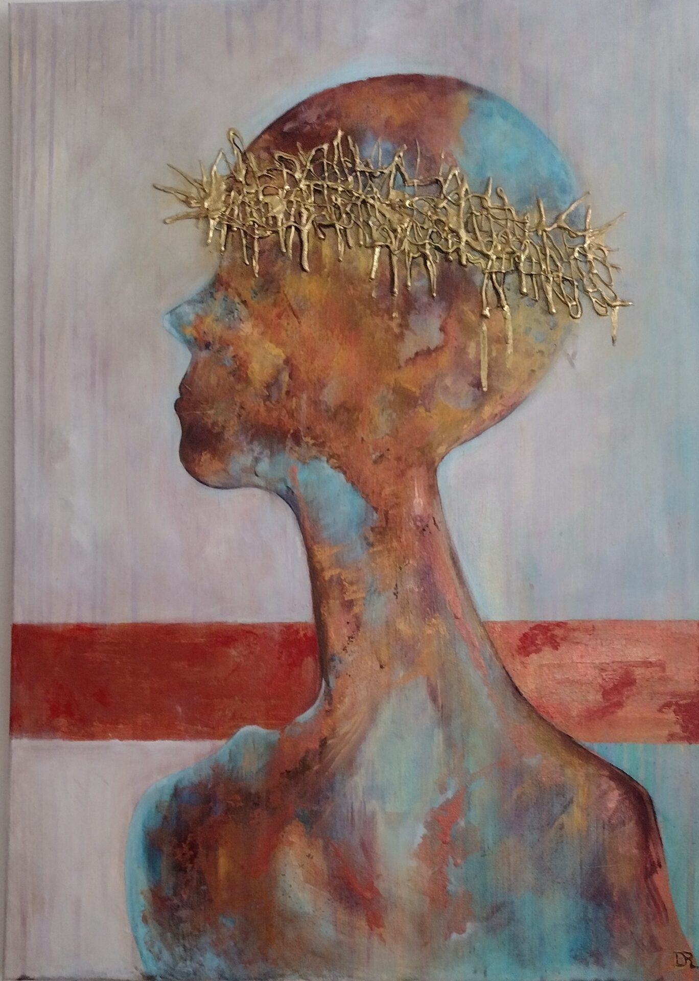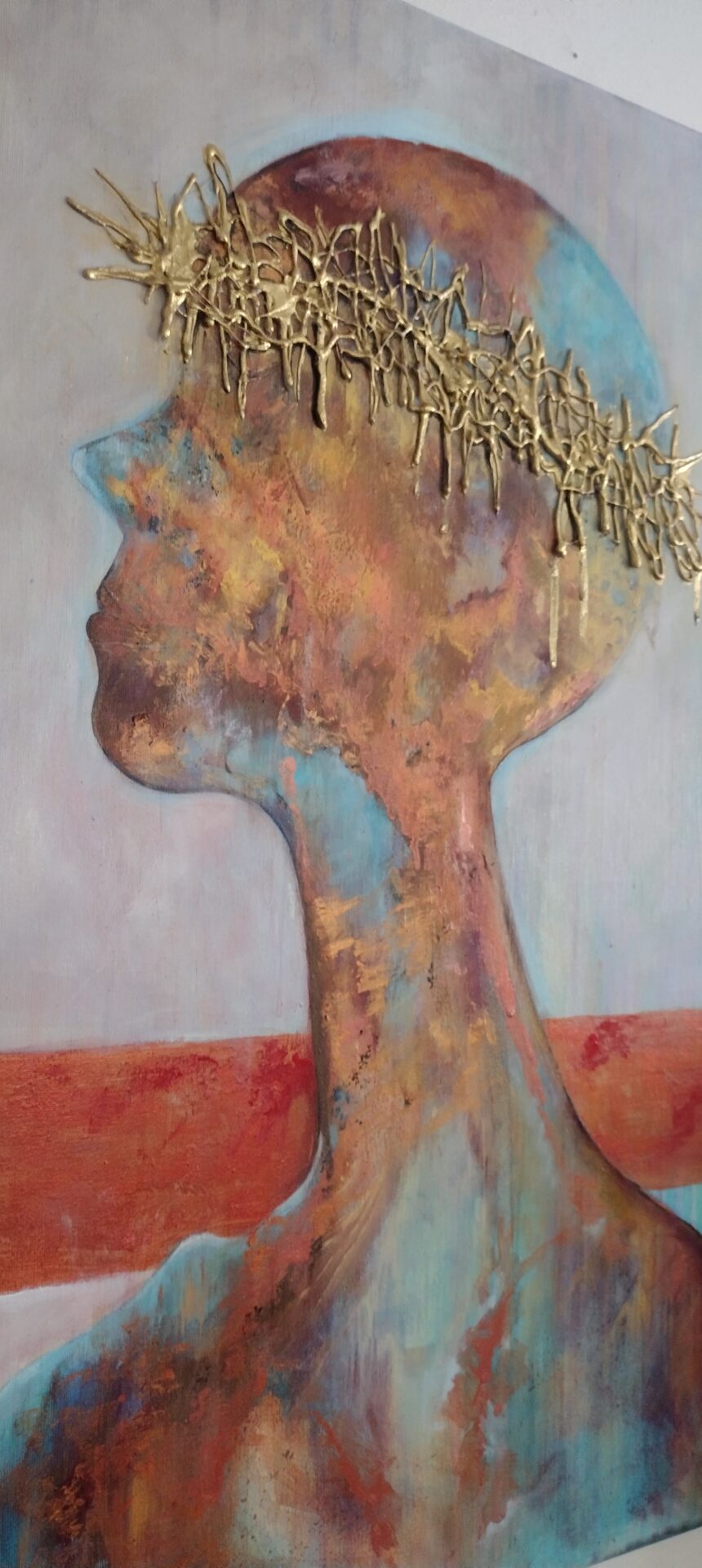 Witam .Przedstawiam nowoczesny obraz wykonany w technice olejnej na podobraziu płóciennym bawełnianym .Miejscami wyraźniejsza,grubsza faktura a „korona cierniowa „uwidoczniona najbardziej .W obrazie wykorzystano kilka odcieni koloru miedzianego oraz złotego .
