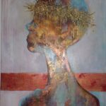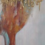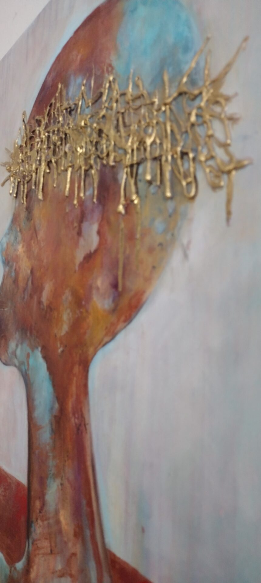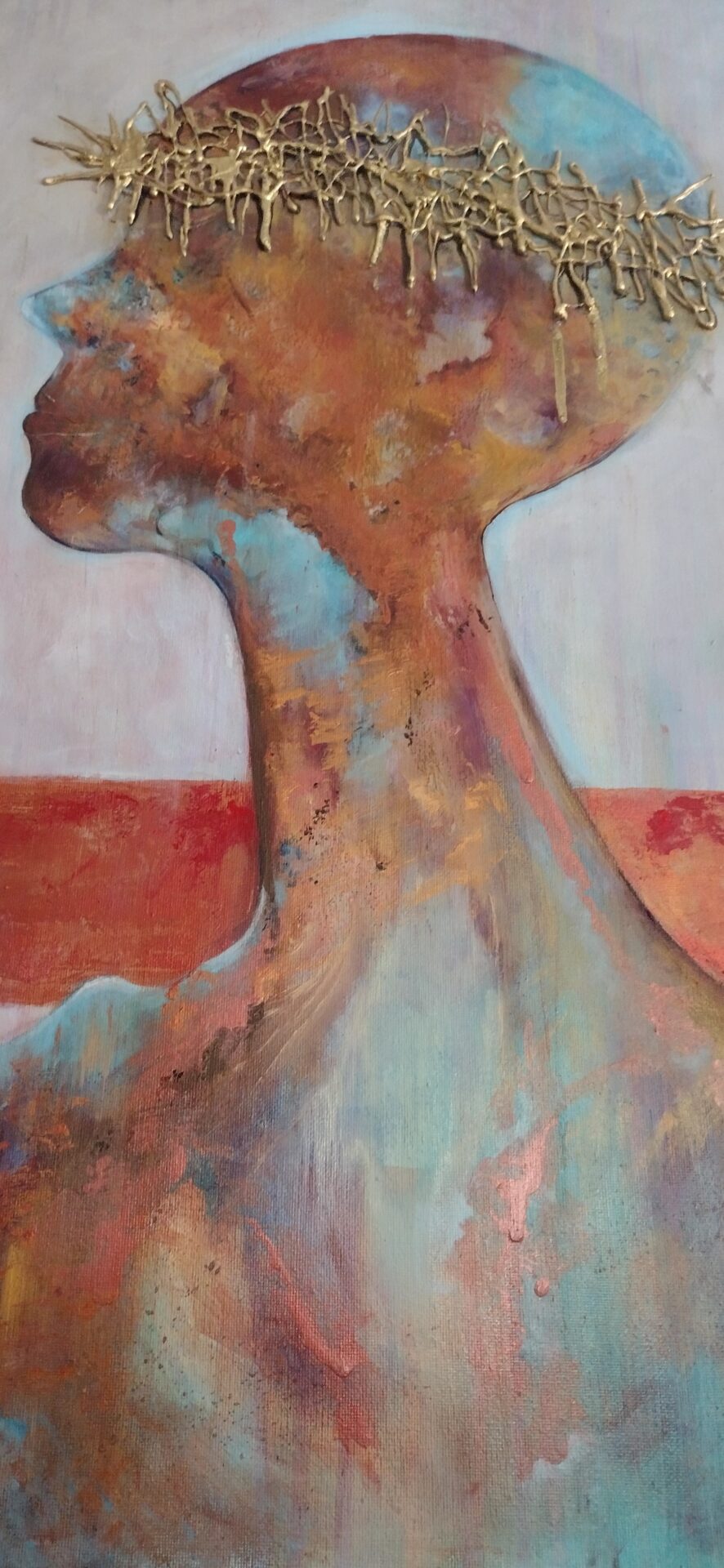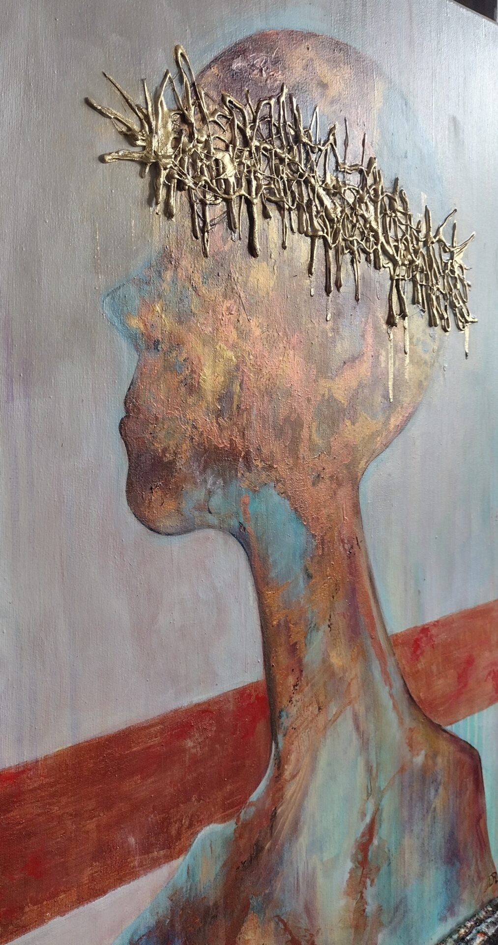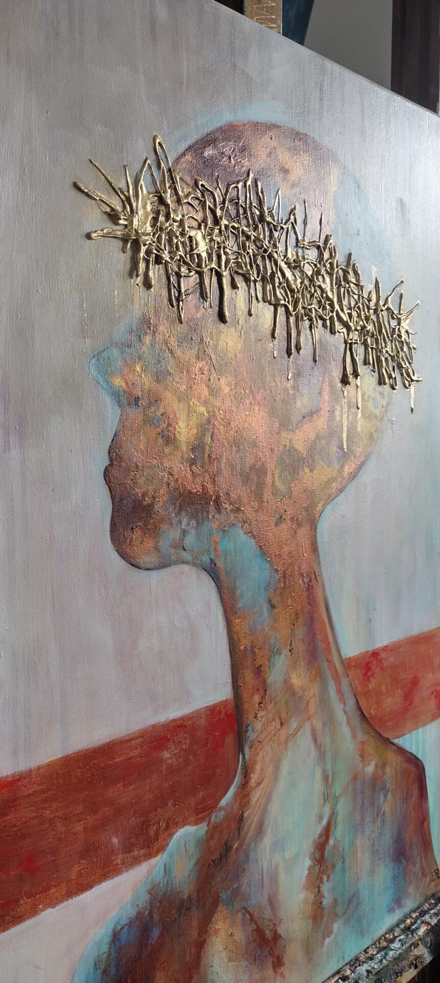 Witam .Przedstawiam nowoczesny obraz wykonany w technice olejnej na podobraziu płóciennym bawełnianym .Miejscami wyraźniejsza,grubsza faktura a „korona cierniowa „uwidoczniona najbardziej .W obrazie wykorzystano kilka odcieni koloru miedzianego oraz złotego .
