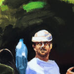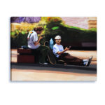Na placu Grzybowskim jest przyjazny skwerek, można na nim posiedzieć, poczytać książkę, dotlenić się wśród zieleni. Jungen i Fili doceniają też walory małej architektury, nie tylko jako miejsce odpoczynku, ale też jako skate park. Obraz powstał na podstawie autorskiej fotografii, którą wykonałem w lecie 2022 r. w Warszawie. Bohaterami obrazu są Jungen i Fifi, autentyczne postacie warszawskiej sceny Skate. W tej scenie odpoczywają po akrobacjach które wykonywali na Placu Grzybowskim.