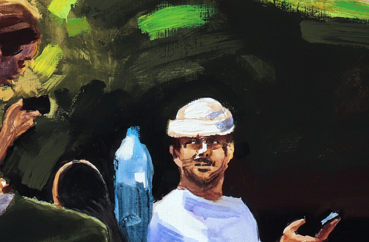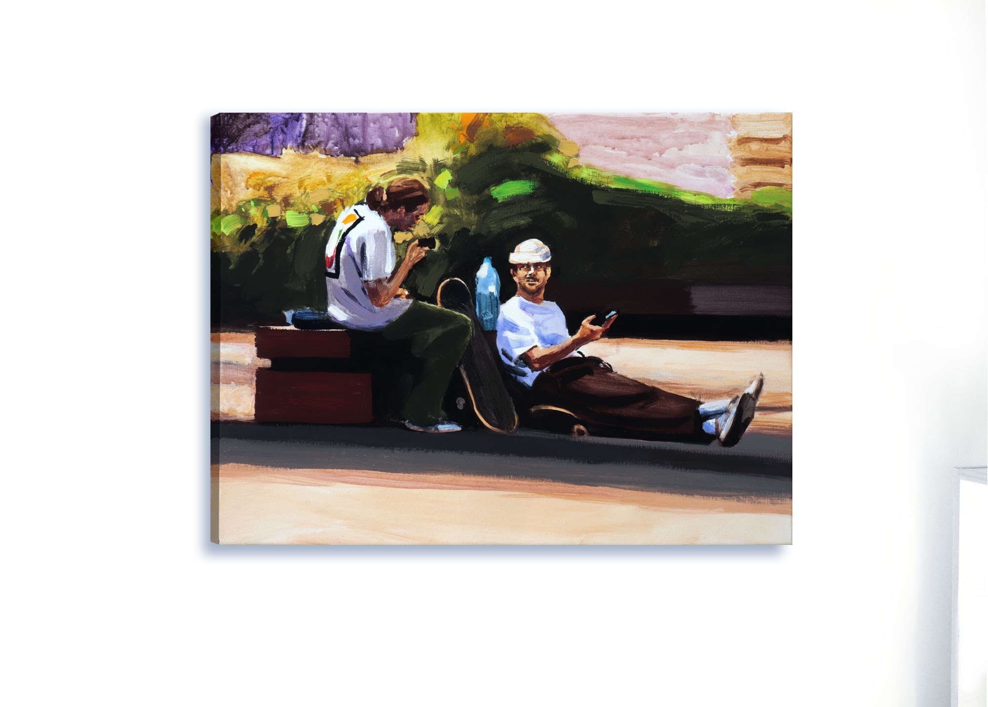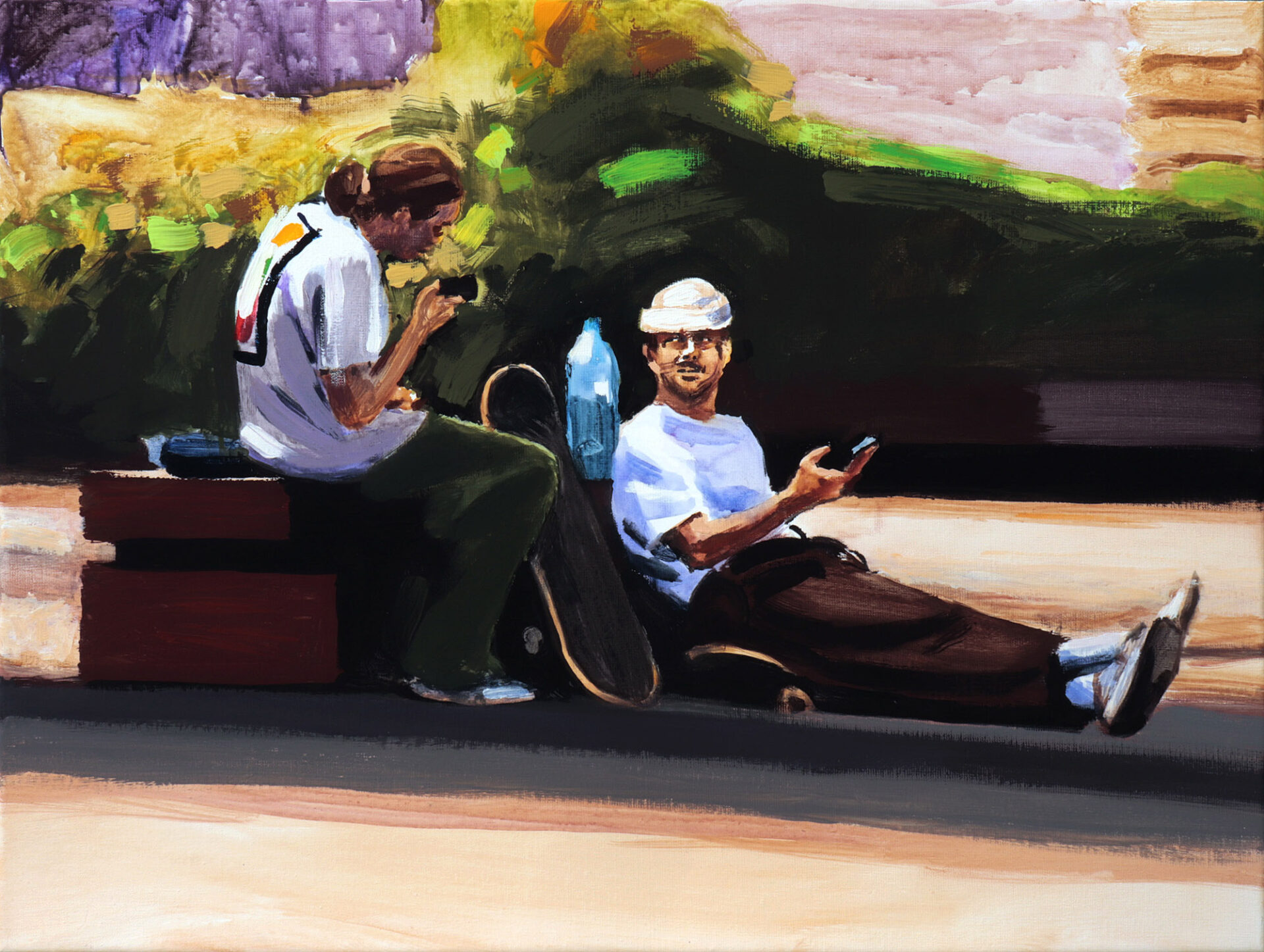 Na placu Grzybowskim jest przyjazny skwerek, można na nim posiedzieć, poczytać książkę, dotlenić się wśród zieleni. Jungen i Fili doceniają też walory małej architektury, nie tylko jako miejsce odpoczynku, ale też jako skate park. Obraz powstał na podstawie autorskiej fotografii, którą wykonałem w lecie 2022 r. w Warszawie. Bohaterami obrazu są Jungen i Fifi, autentyczne postacie warszawskiej sceny Skate. W tej scenie odpoczywają po akrobacjach które wykonywali na Placu Grzybowskim.