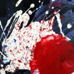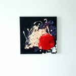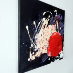 Informacje podstawowe: akryl na płótnie bawełnianym (gruntowanym) 30×30 cm. Barwy: czerń, biel, czerwień, fiolet. Boki czarne, poza prawym rogiem – biel jako kontynuacja obrazu.