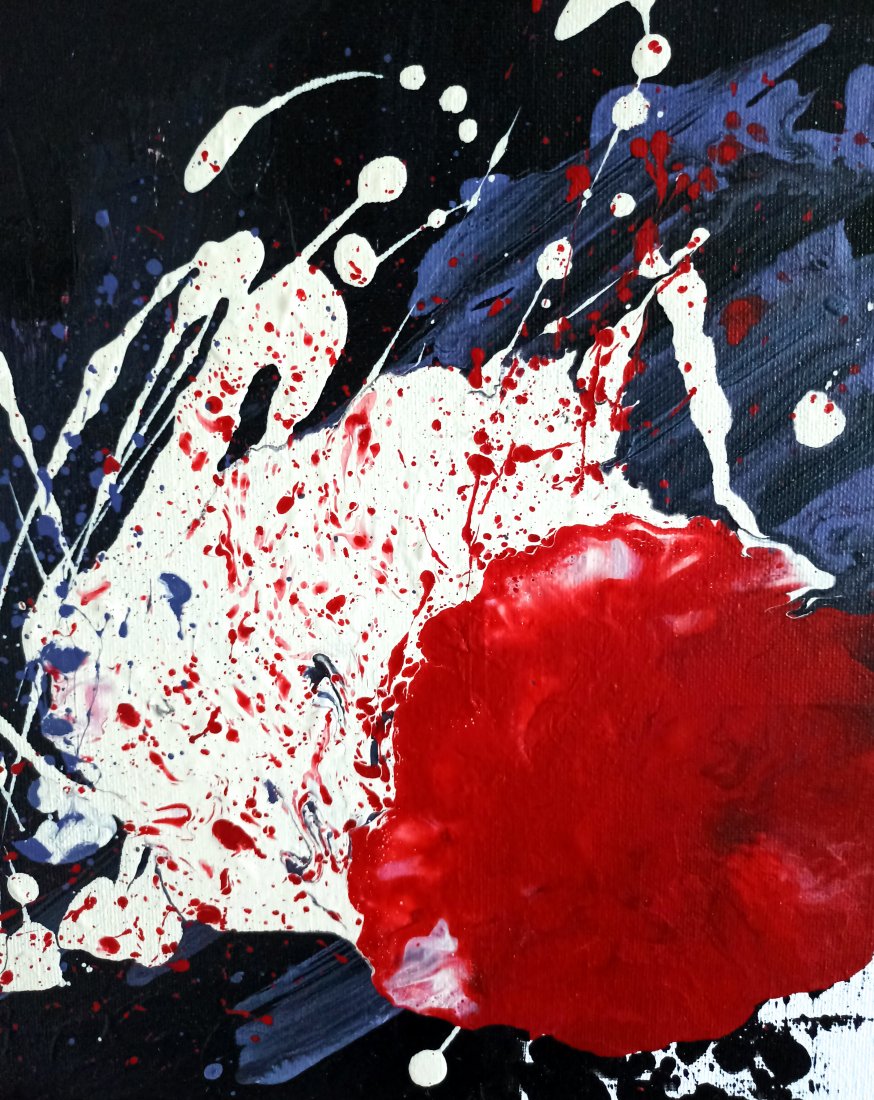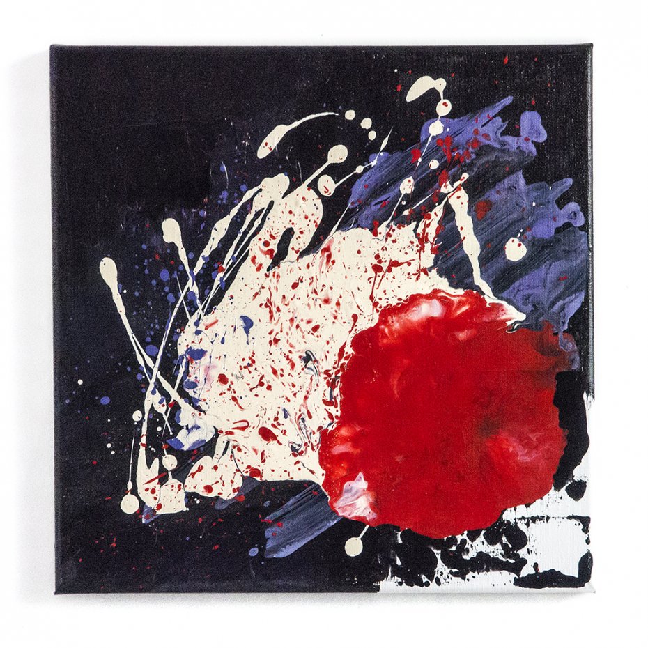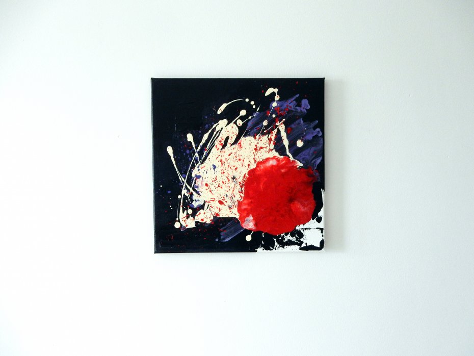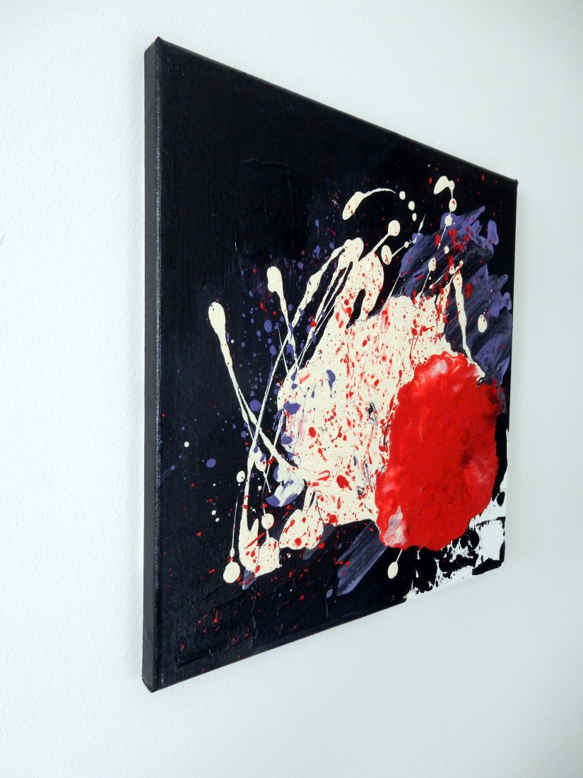 Informacje podstawowe: akryl na płótnie bawełnianym (gruntowanym) 30×30 cm. Barwy: czerń, biel, czerwień, fiolet. Boki czarne, poza prawym rogiem – biel jako kontynuacja obrazu.