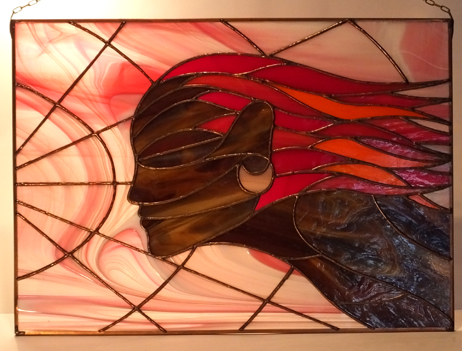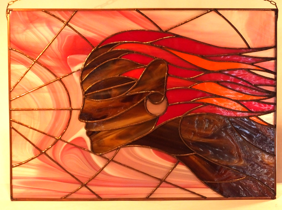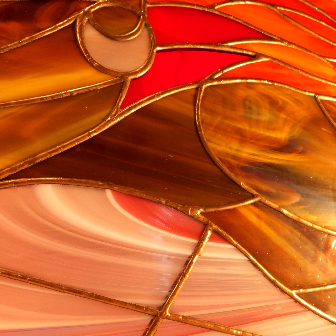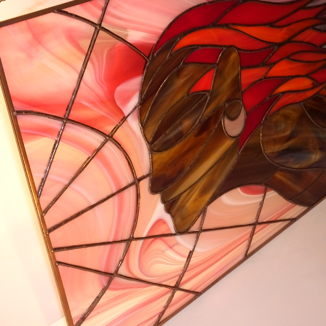 Obraz witrażowy wykonany ręcznie w technice Tiffany. Składa się z 71 elementów szklanych połączonych lutowiem. Obraz oprawiony jest w profil miedziany, do którego przylutowany jest mosiężny łańcuszek umożliwiający powieszenie. Zaprojektowany w Pracowni Artystycznej Cahaya w sercu Gór Świętokrzyskich. Certyfikat autentyczności pracy.