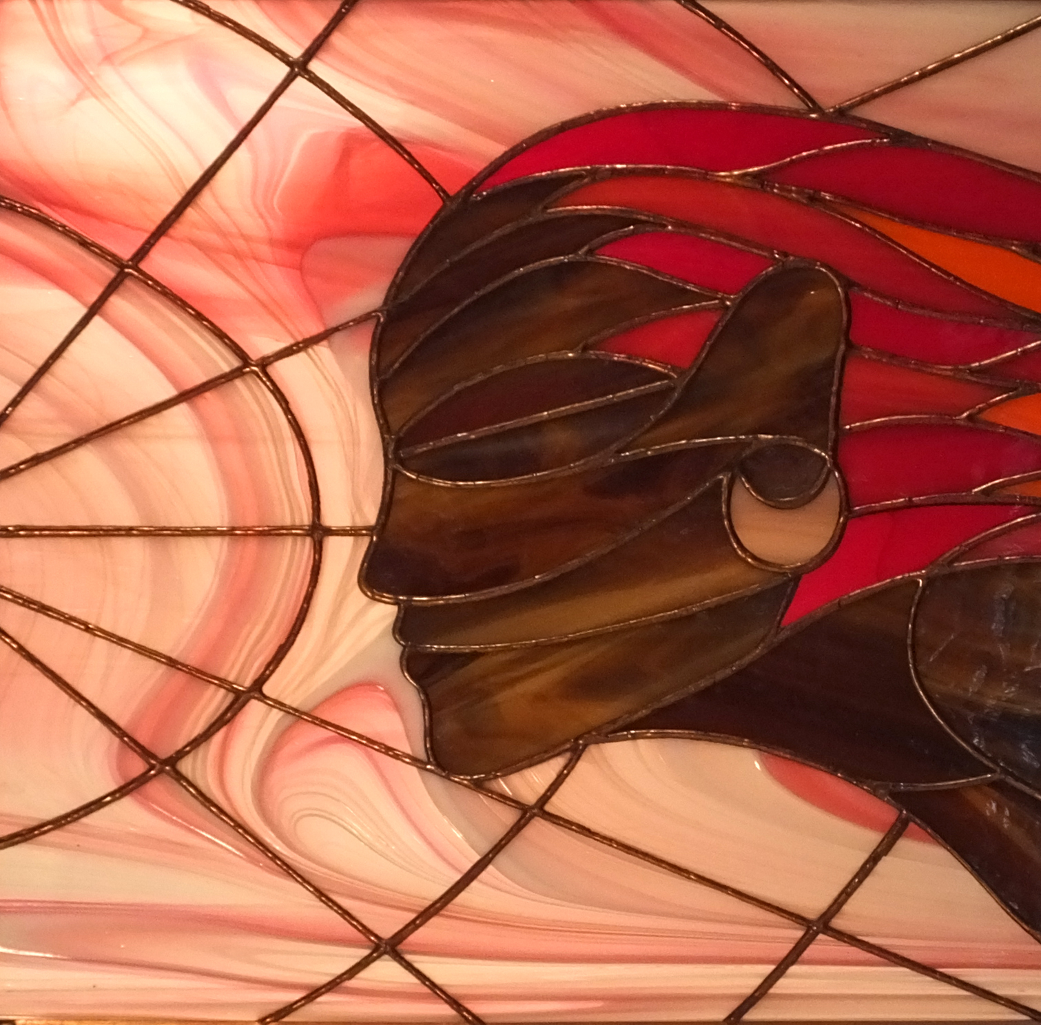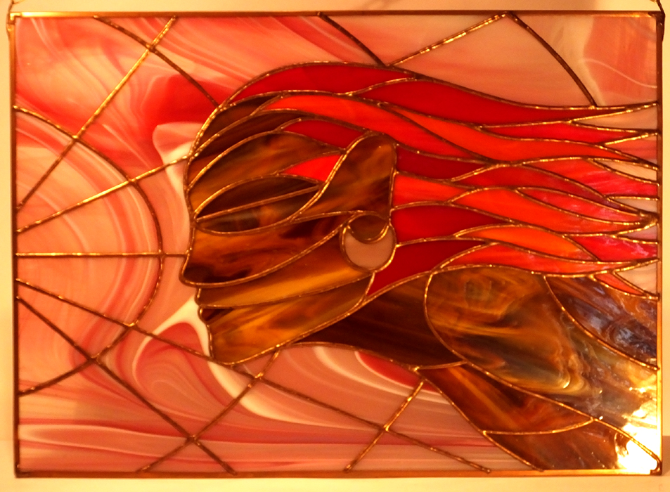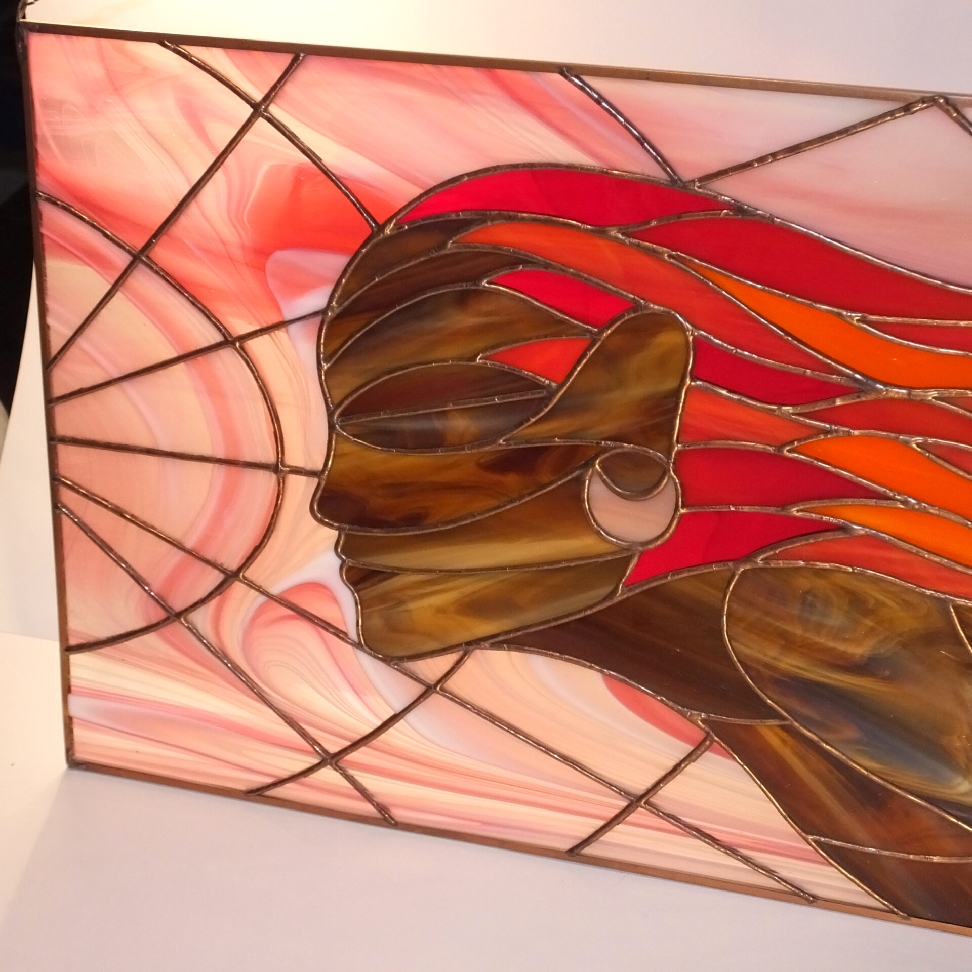 Obraz witrażowy wykonany ręcznie w technice Tiffany. Składa się z 71 elementów szklanych połączonych lutowiem. Obraz oprawiony jest w profil miedziany, do którego przylutowany jest mosiężny łańcuszek umożliwiający powieszenie. Zaprojektowany w Pracowni Artystycznej Cahaya w sercu Gór Świętokrzyskich. Certyfikat autentyczności pracy.