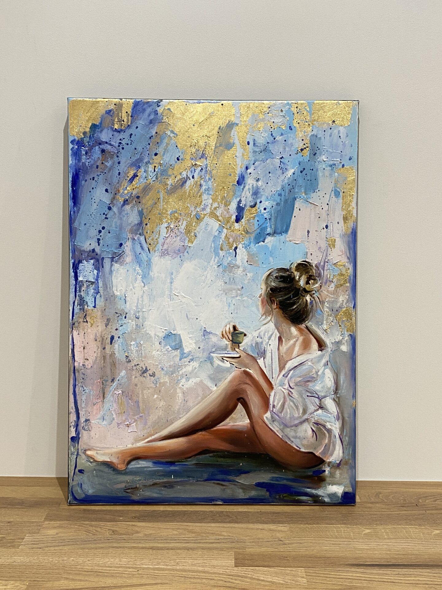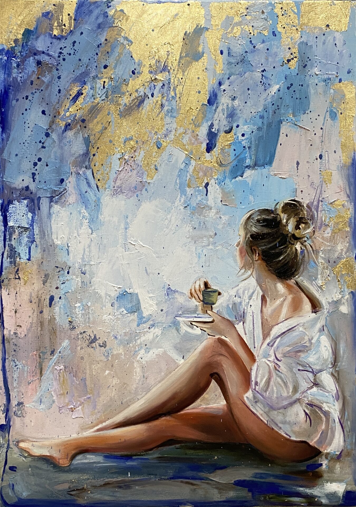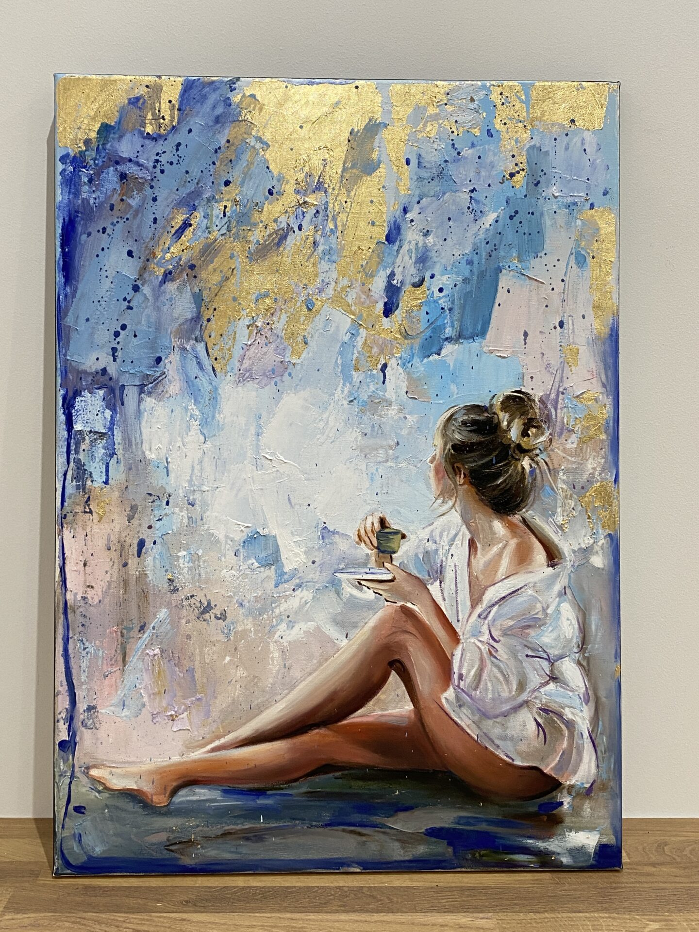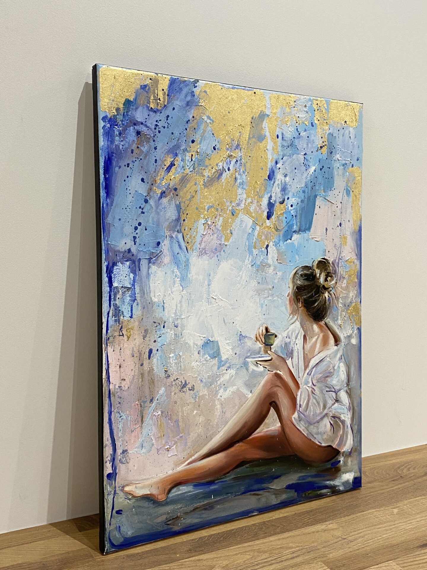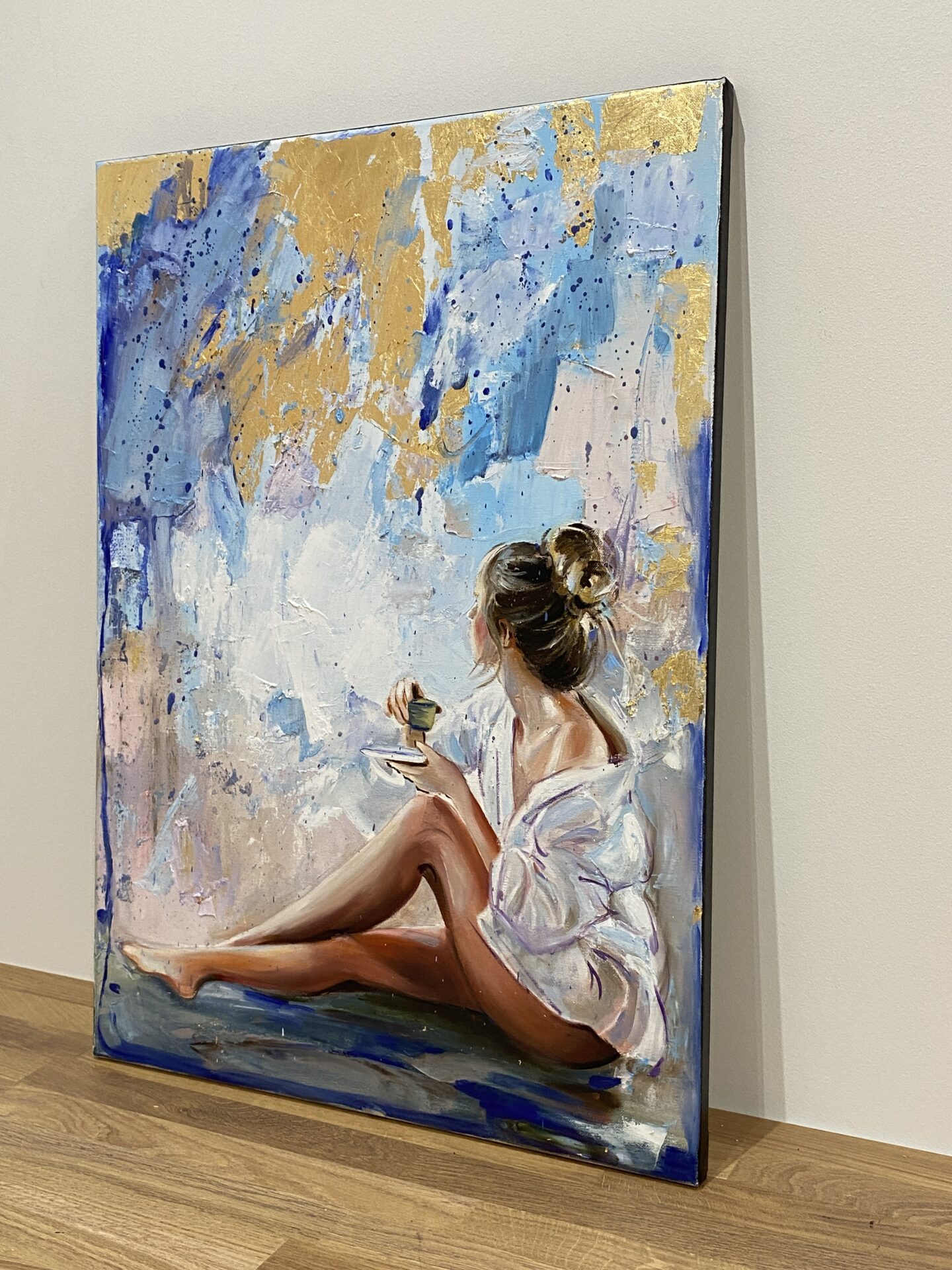• Obraz malowany wysokiej jakości farbami olejnymi na płótnie bawełnianym z dodatkami płatków złota o wymiarze 70×50cm, rok wykonania 2023.