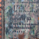 Obraz na deskach – wiele warstw nałożonych na siebie i wytartych. Tekst wytłoczony: