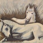 Inspiracją obrazu było moje uwielbienie natury i zwierząt. Konie mają dla mnie szczególne znaczenie symboliczne, są wyrazem wolności, mocy i uważności. Na tym akurat obrazie jest mama i syn, dojrzałość i ciekawość, zderzenie różnych stanów. Obraz ma boki zamalowane w kolorze tła i zamontowaną zawieszkę.