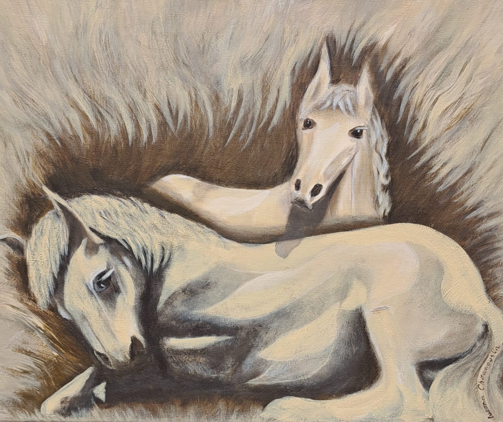 Inspiracją obrazu było moje uwielbienie natury i zwierząt. Konie mają dla mnie szczególne znaczenie symboliczne, są wyrazem wolności, mocy i uważności. Na tym akurat obrazie jest mama i syn, dojrzałość i ciekawość, zderzenie różnych stanów. Obraz ma boki zamalowane w kolorze tła i zamontowaną zawieszkę.
