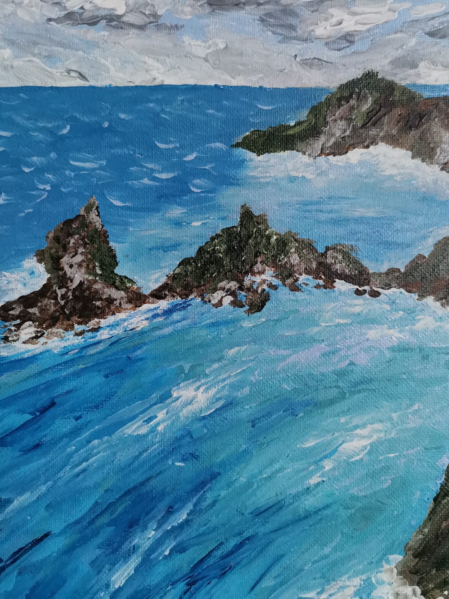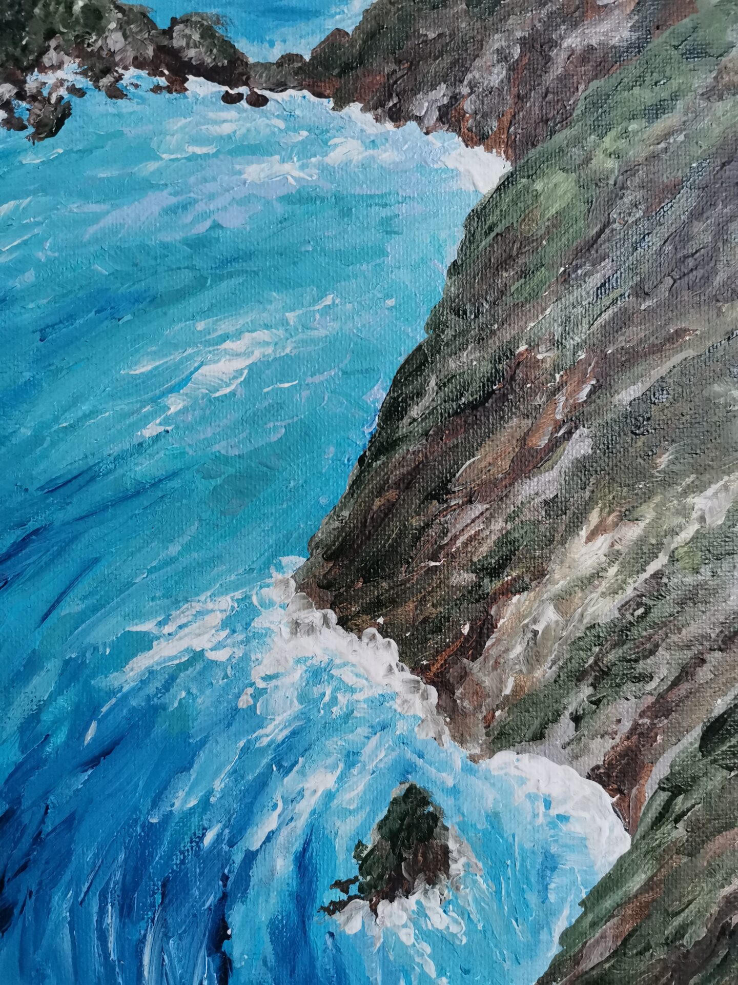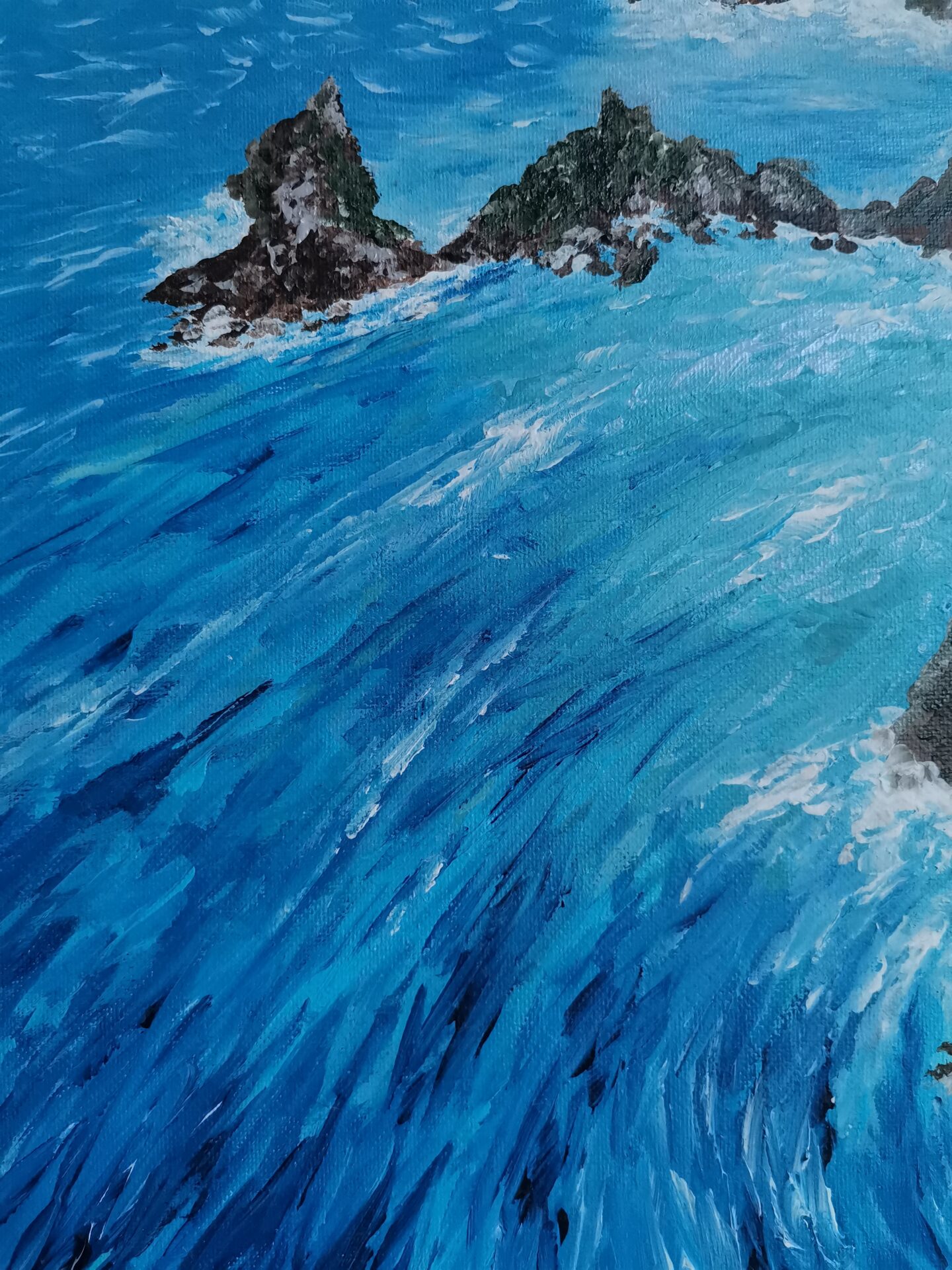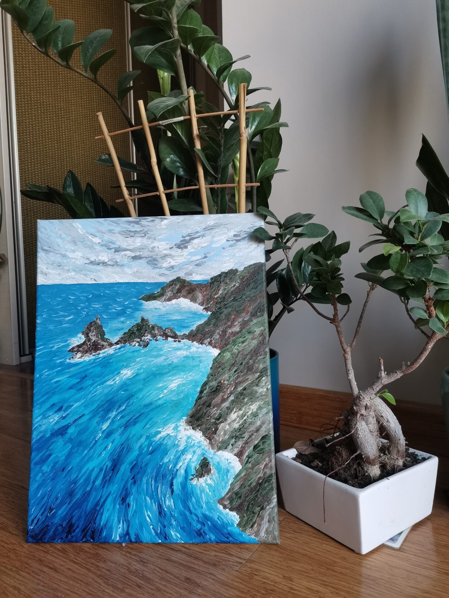 Obraz namalowany farbami akrylowymi na podobraziu malarskim. Boki są zamalowane, a obraz zawerniksowany. Wymiary obrazu to 30×40 cm.