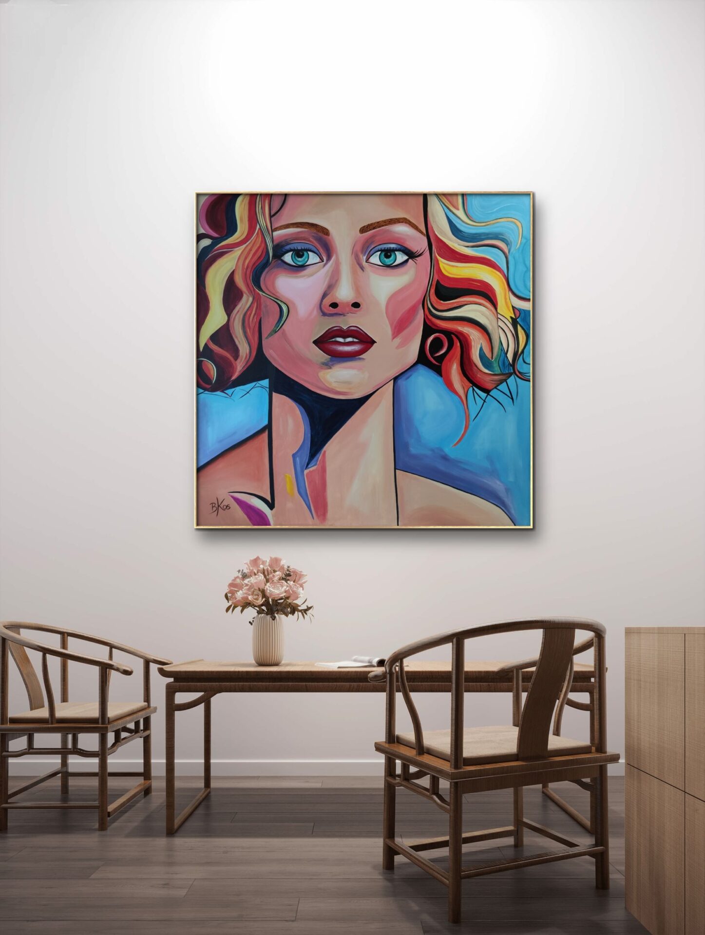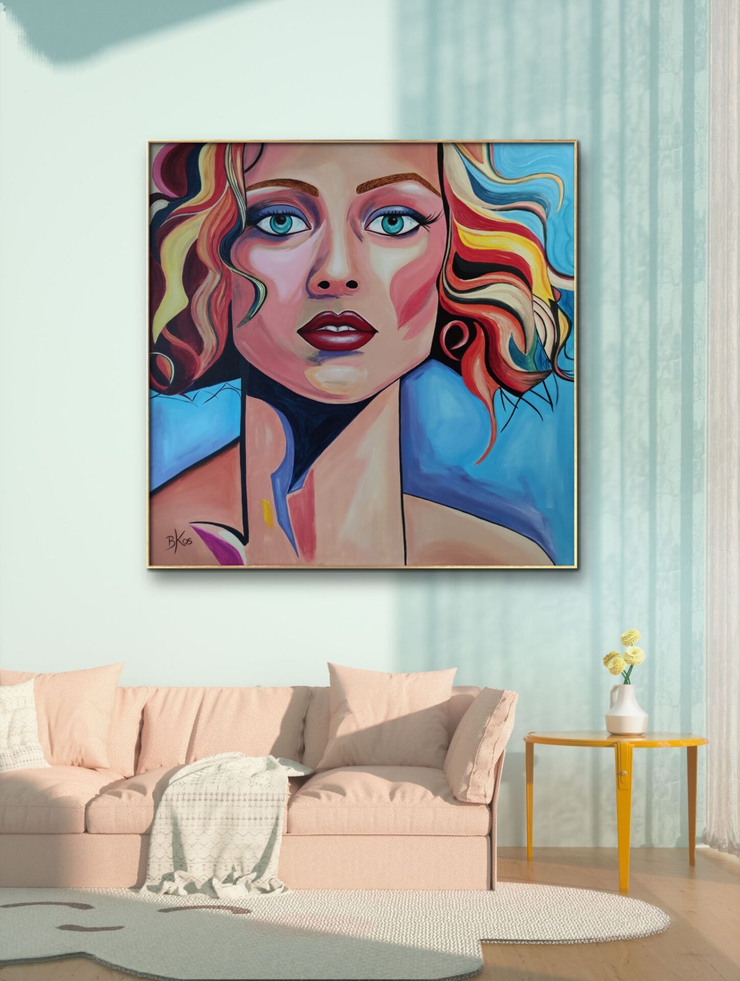Obraz dziewczyny o głębokim, tajemniczym spojrzeniu, za sprawą intensywnej palety barw, emanuje pełnią życia i energią, a jednocześnie spokojem i delikatnością. Dzięki temu wnętrze nabierze niepowtarzalnego charakteru. Namalowany jest farbami akrylowymi na bawełnianym płótnie. Boki są starannie zamalowane jako kontynuacja obrazu, więc nie wymaga ramy. Pokryty jest ochronnym matowym werniksem, który nadaje głębi kolorom. Możliwy jest także zakup reprodukcji obrazu w formie wydruku na płótnie w dowolnej wielkości. O szczegóły dotyczące ceny reprodukcji proszę pytać telefonicznie lub mailowo.