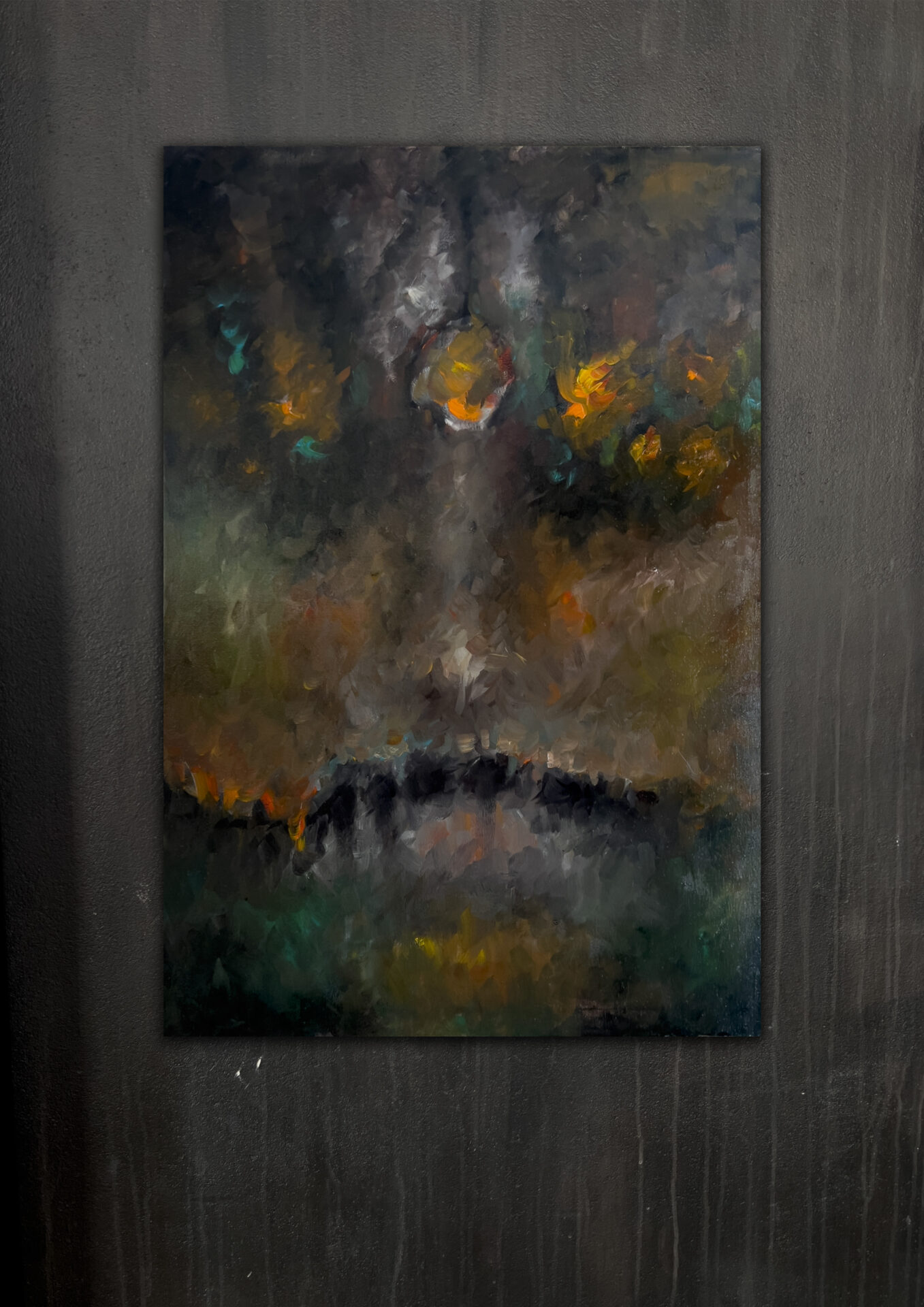 Obraz namalowany olejami, w odcieniach zieleni, szarości i pomarańczy, wymiary 50×70 cm