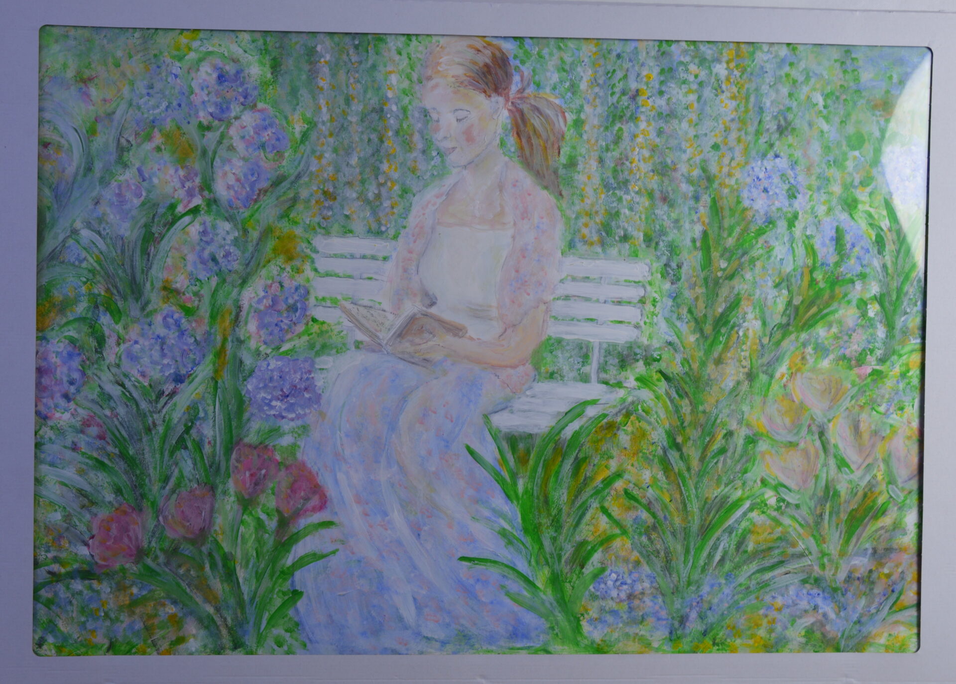 Kobieta czytająca. Obraz malowany farbą akrylową na piance 5 mm oprawiony w antyramę z pleksi.