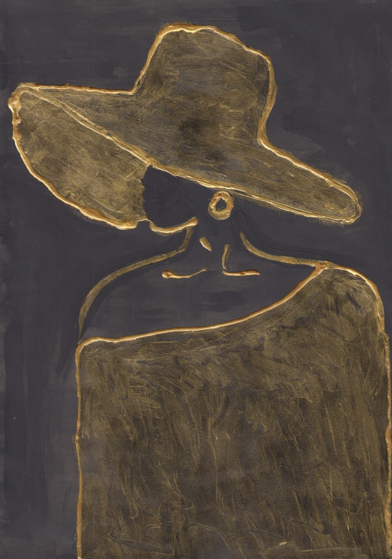 Rysunek został wykonany na kartce a4. Przedstawia kobietę w kapeluszu, która jest namalowana specjalnym złotym żelem (który wysycha po pewnym czasie ). Tło jest pomalowane czarną farbą. Chciałam przedstawić elegancką kobietę na wzór Francuzki.