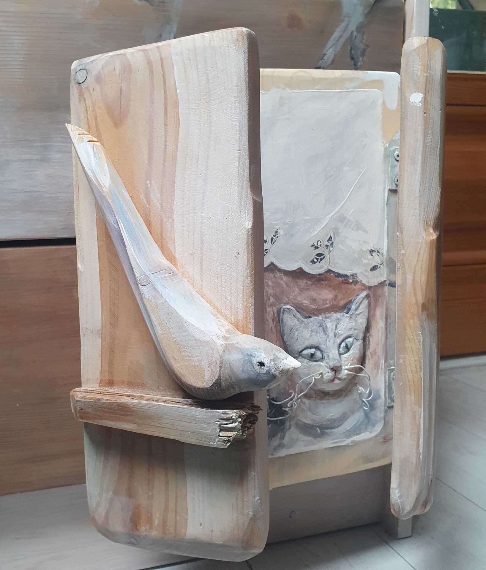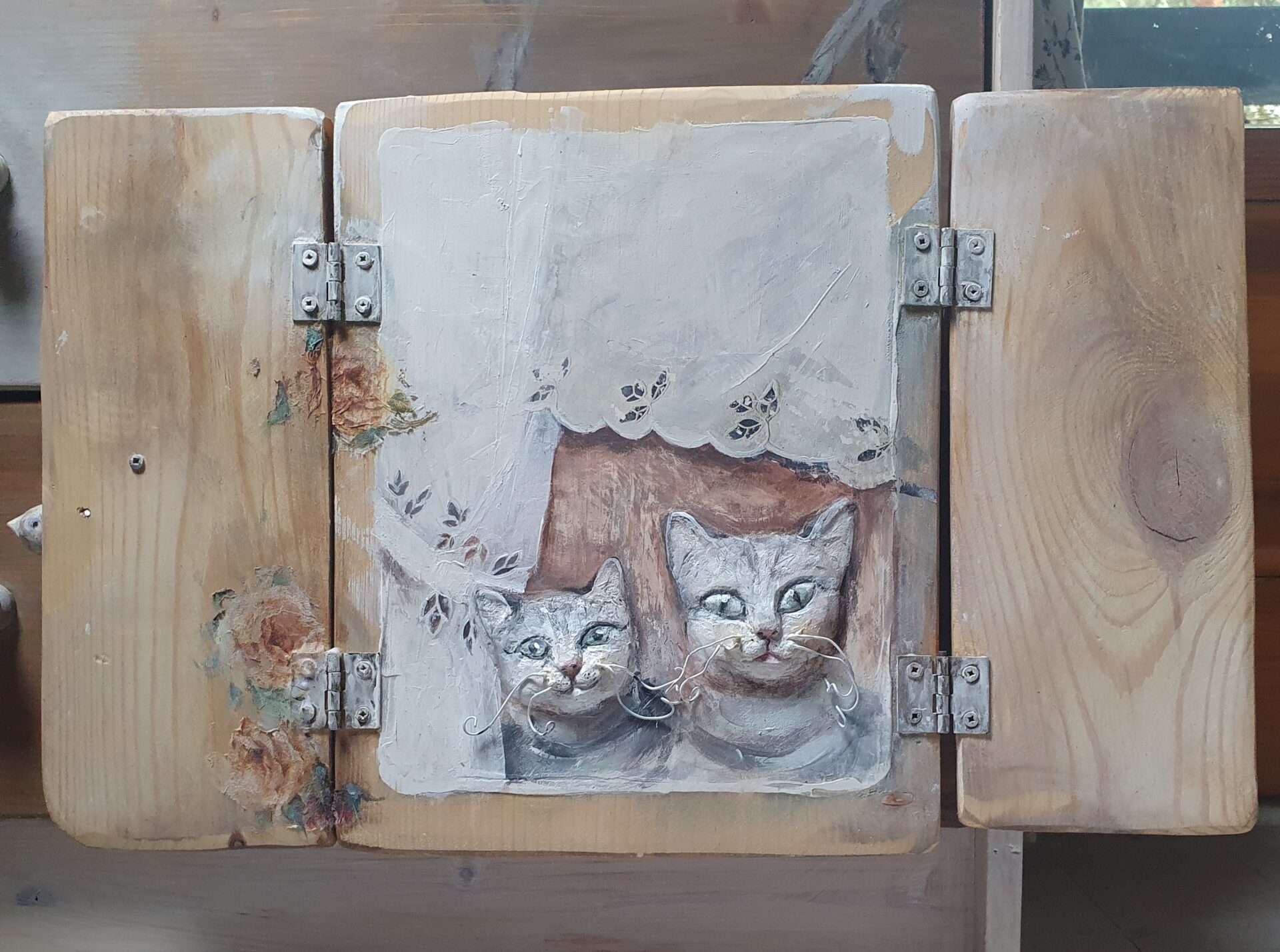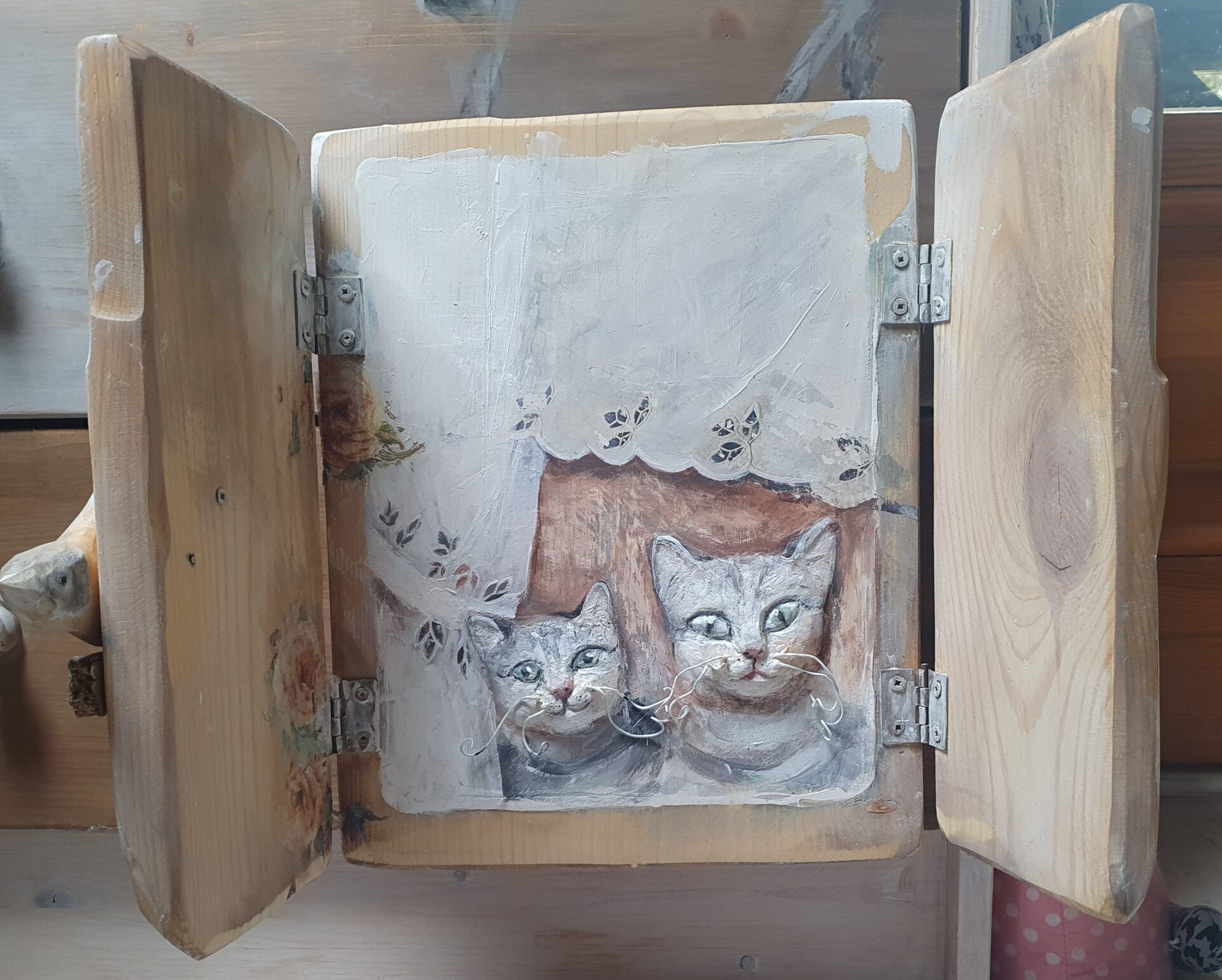 dekoracyjny obrazek-okienko, technika mieszana; akryl, decoupage, transfer, masa drzewna. przedmiot zrobiony ze starych deseczek, na froncie po zamknięciu okienniczek drewniany ptaszek, mordki kotków zrobione są z masy drzewnej – wypukłe, wąsy z drucików, wykończenie lakierem i woskiem.