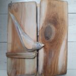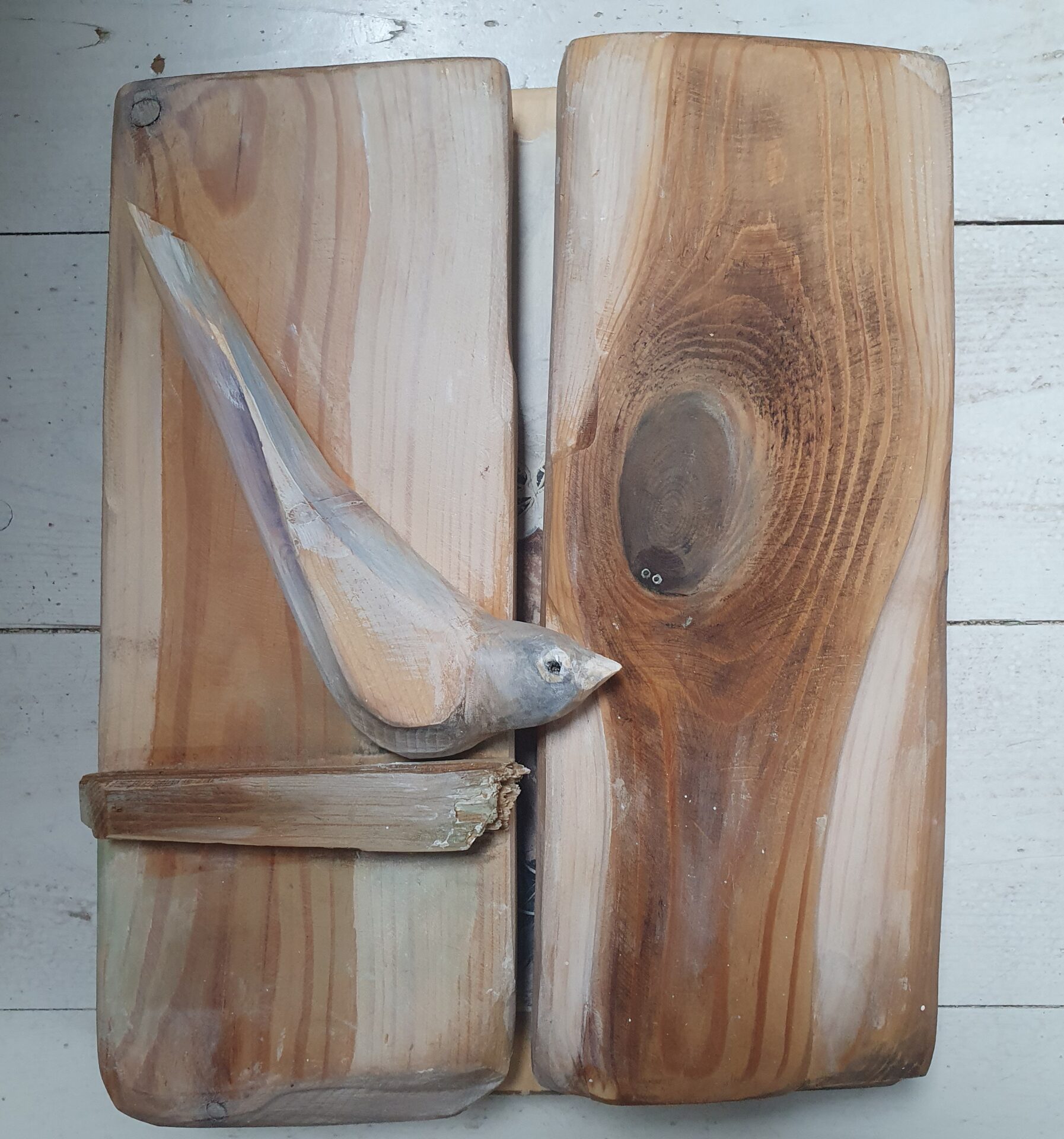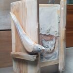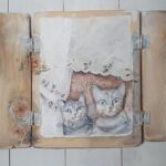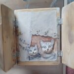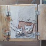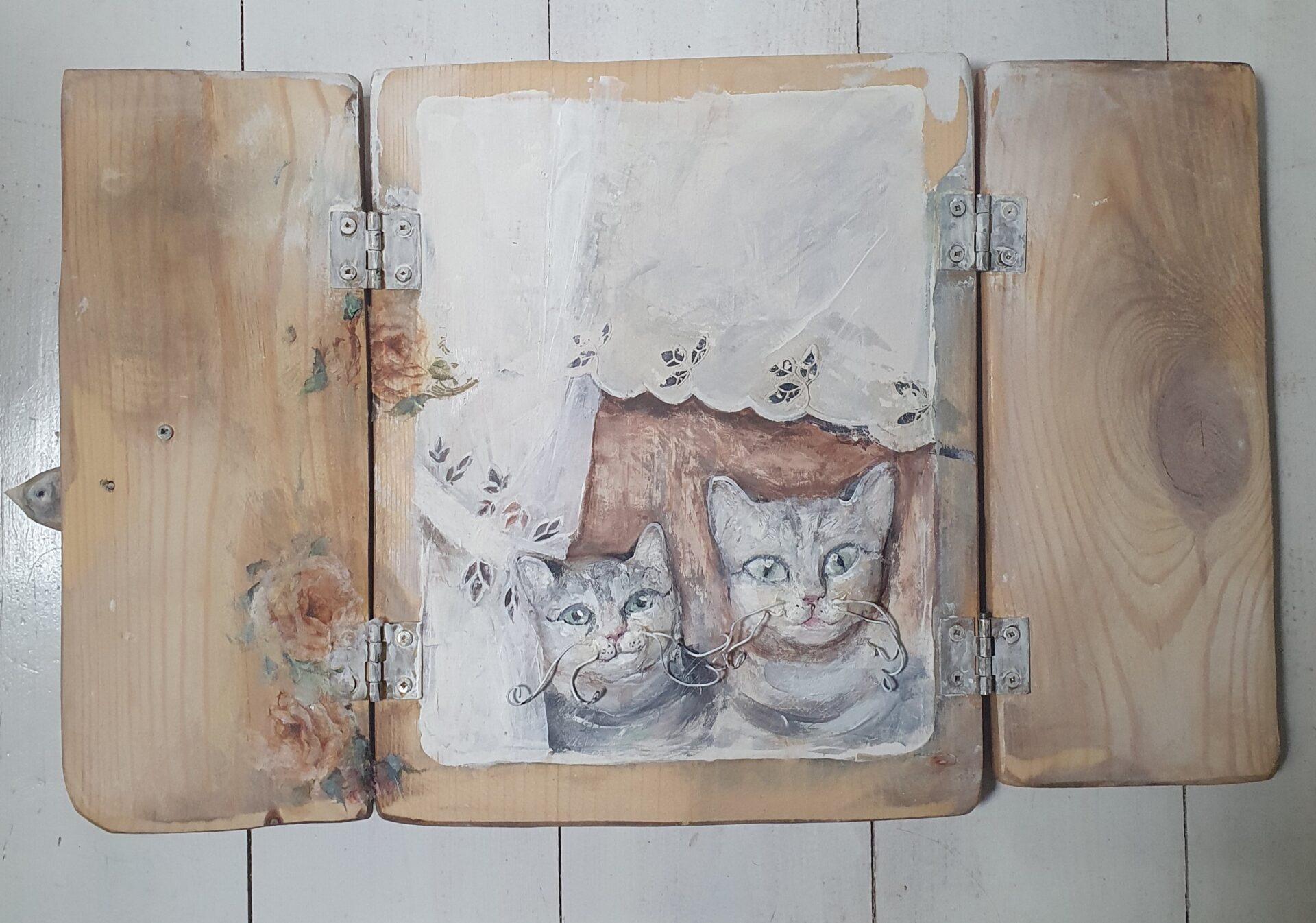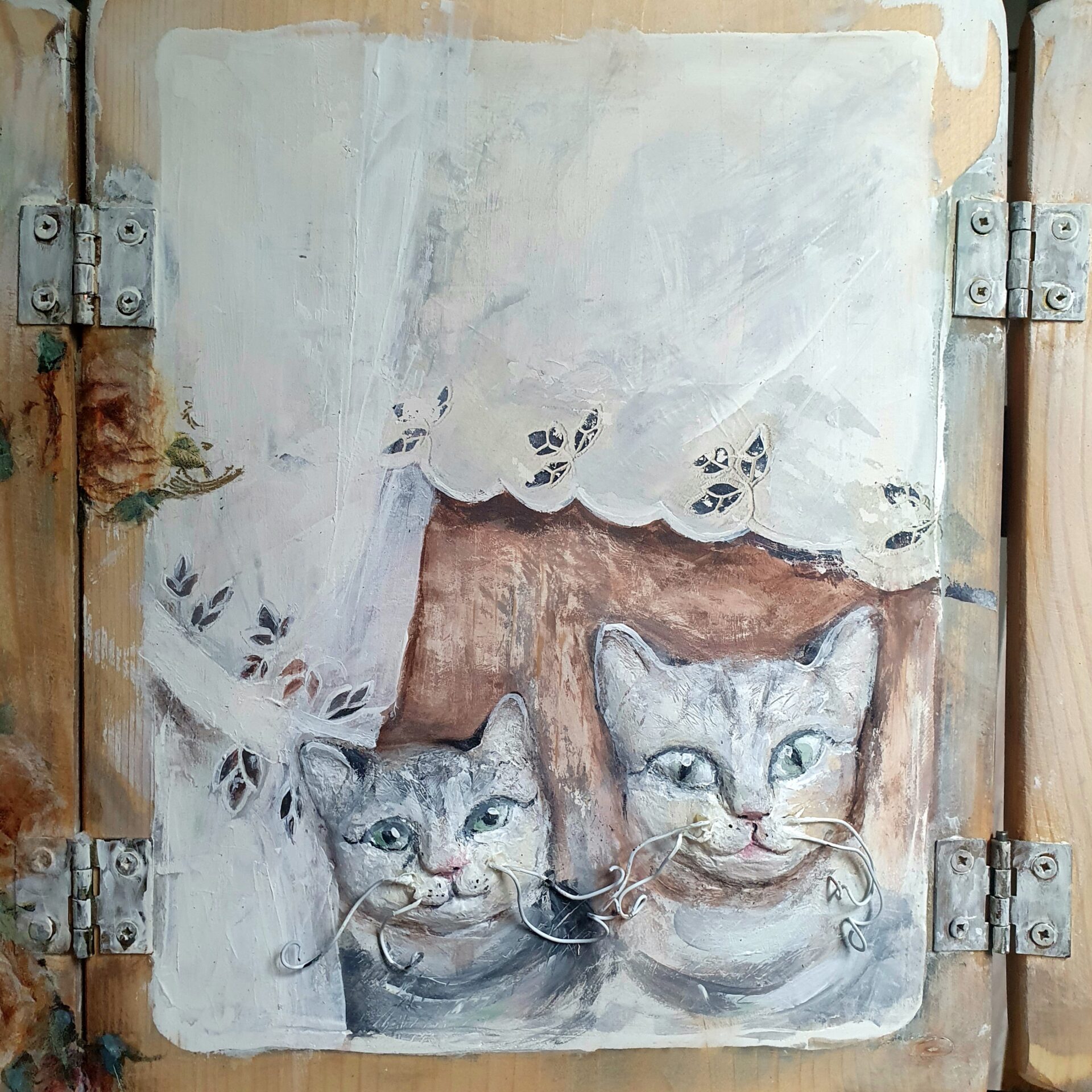 dekoracyjny obrazek-okienko, technika mieszana; akryl, decoupage, transfer, masa drzewna. przedmiot zrobiony ze starych deseczek, na froncie po zamknięciu okienniczek drewniany ptaszek, mordki kotków zrobione są z masy drzewnej – wypukłe, wąsy z drucików, wykończenie lakierem i woskiem.