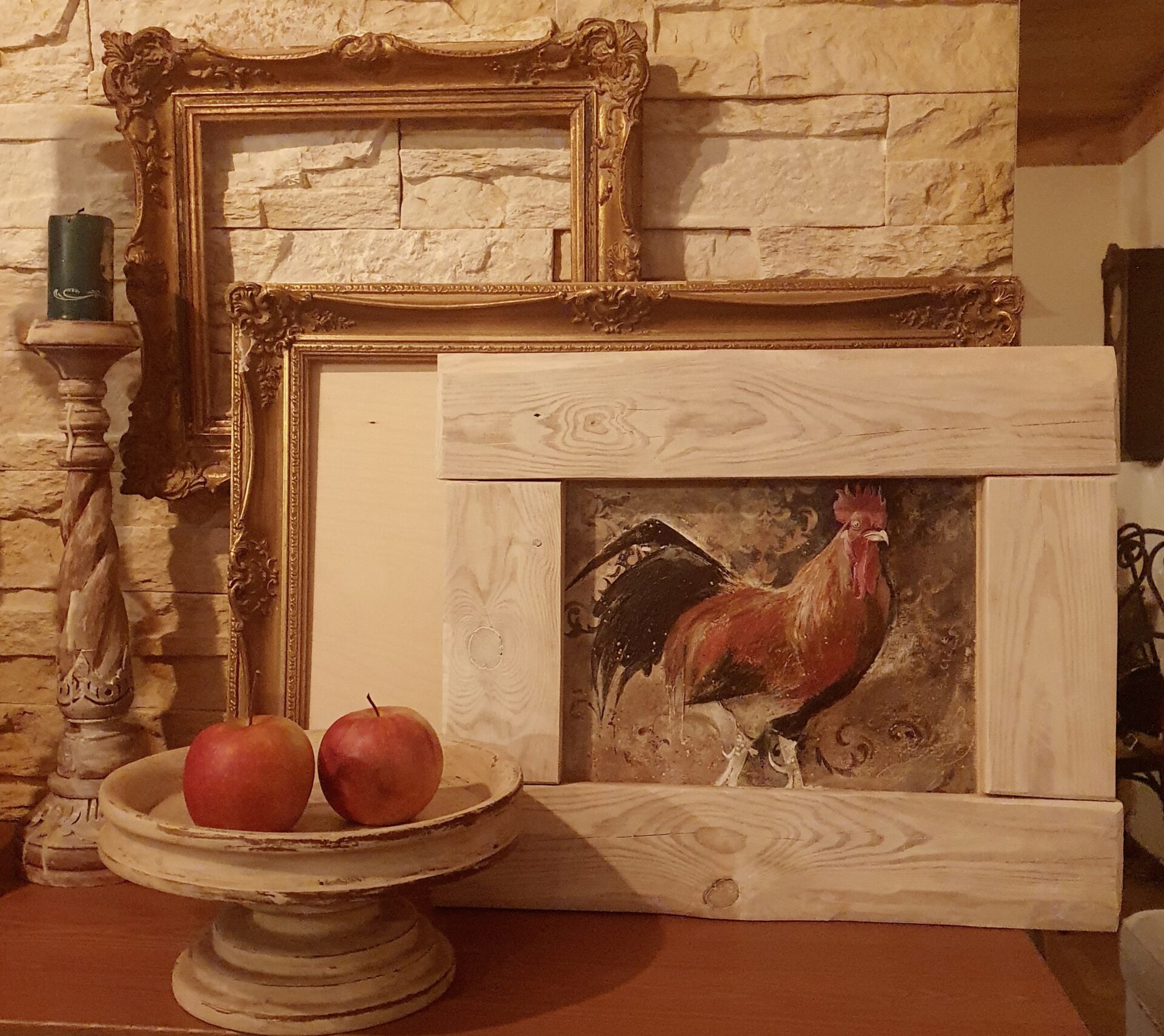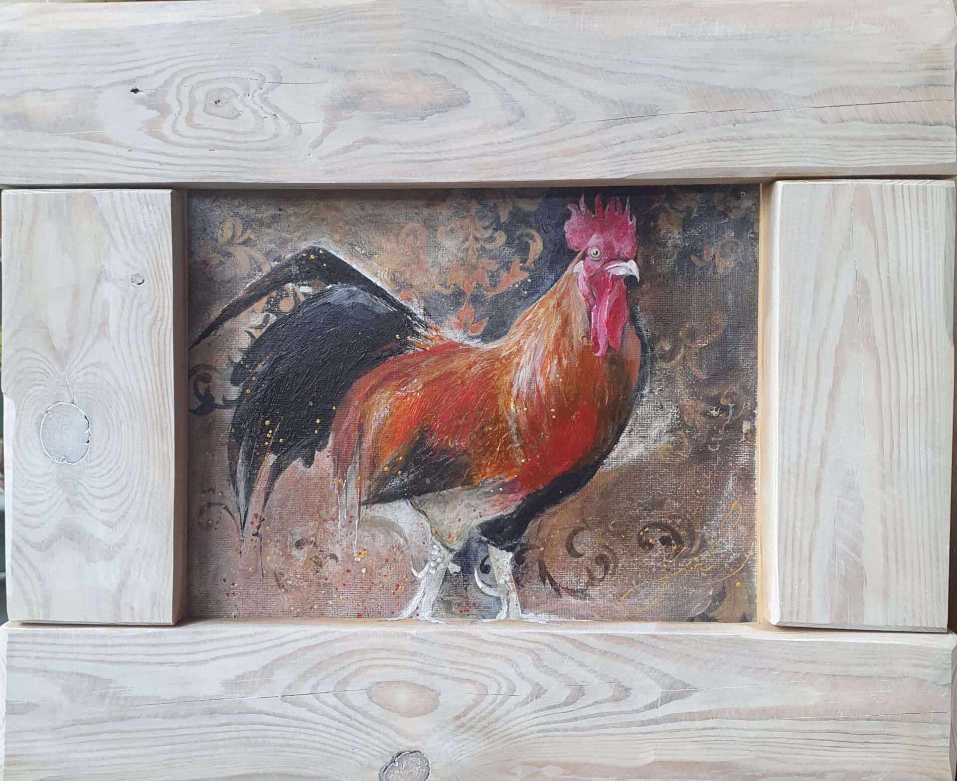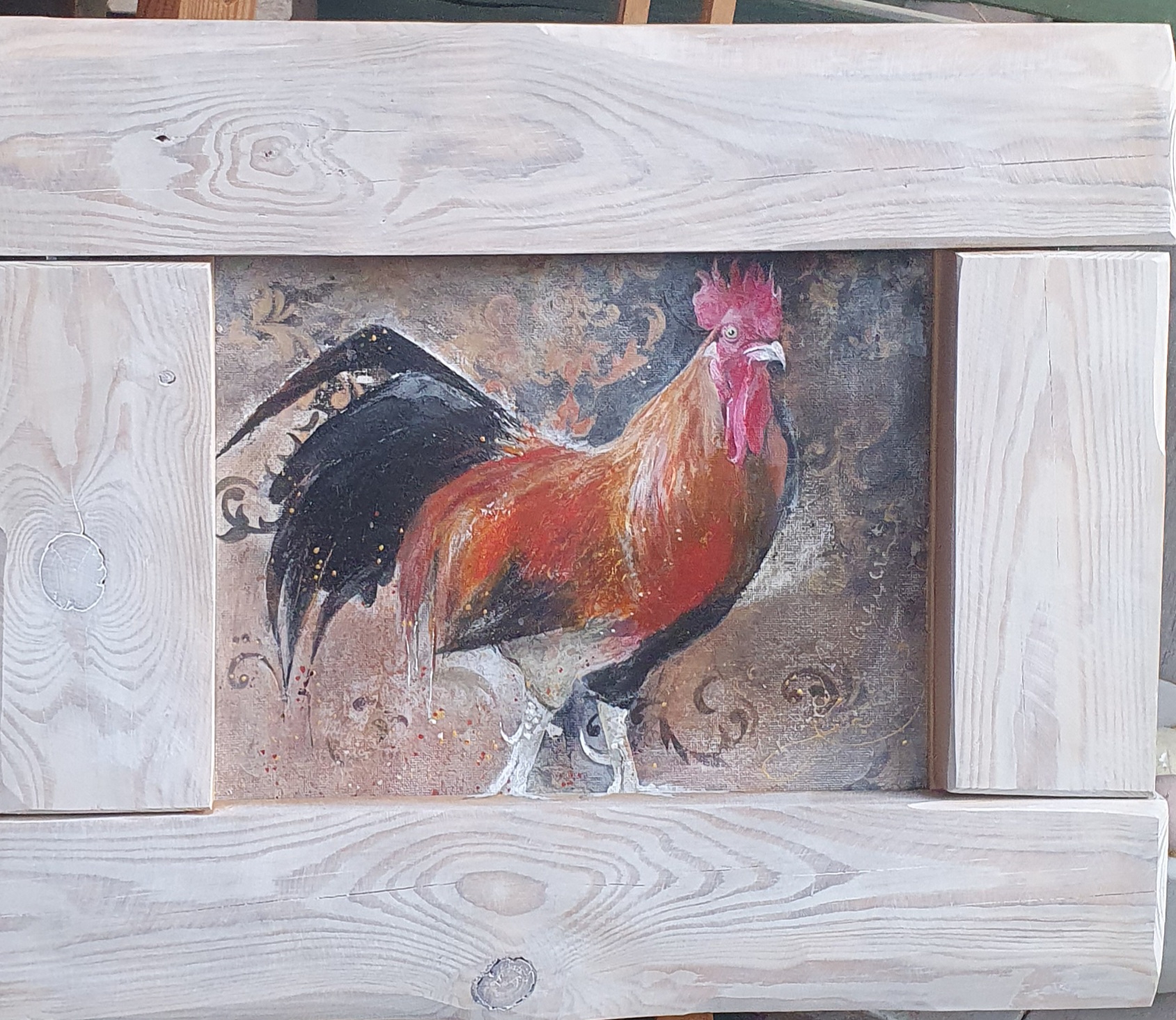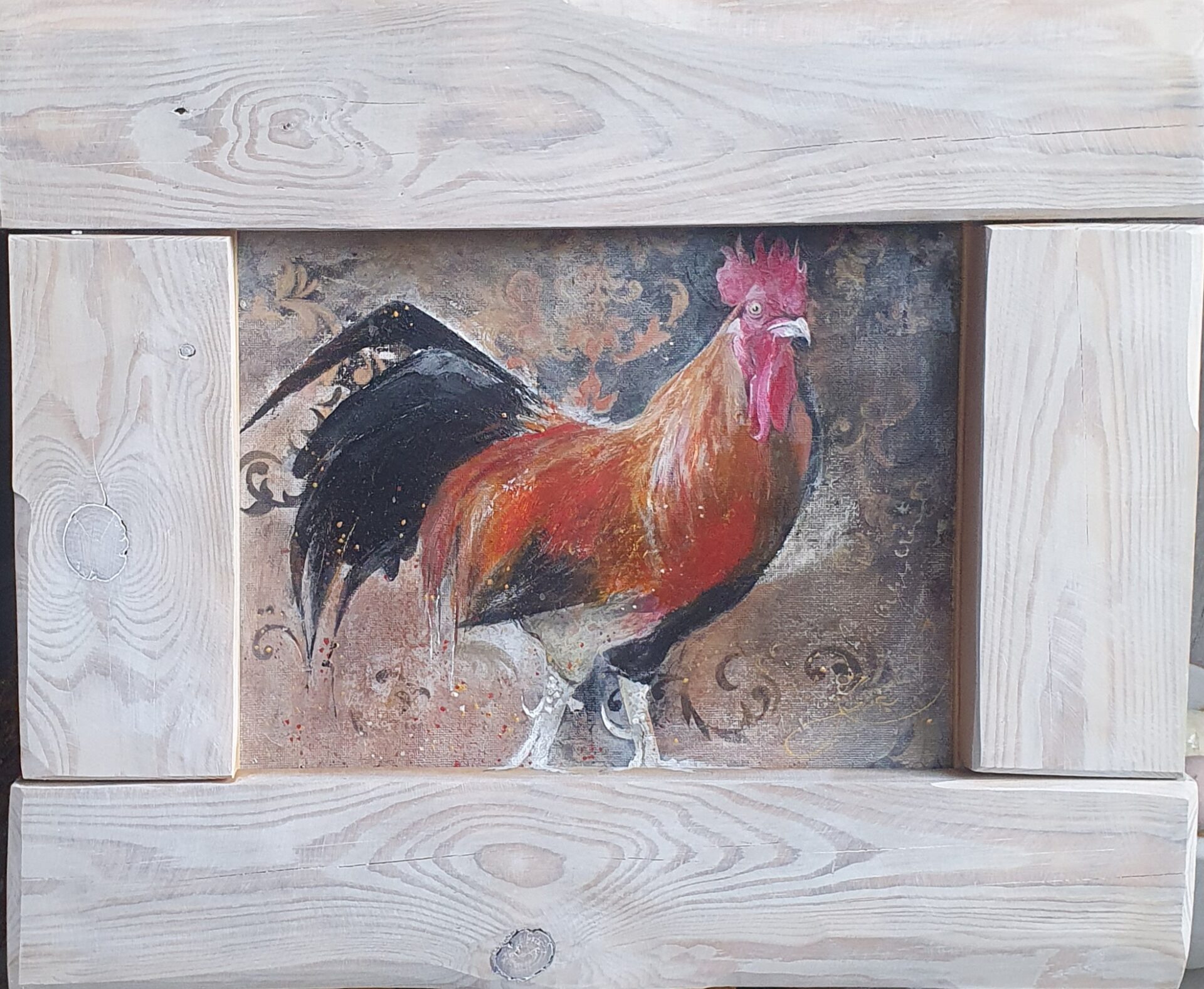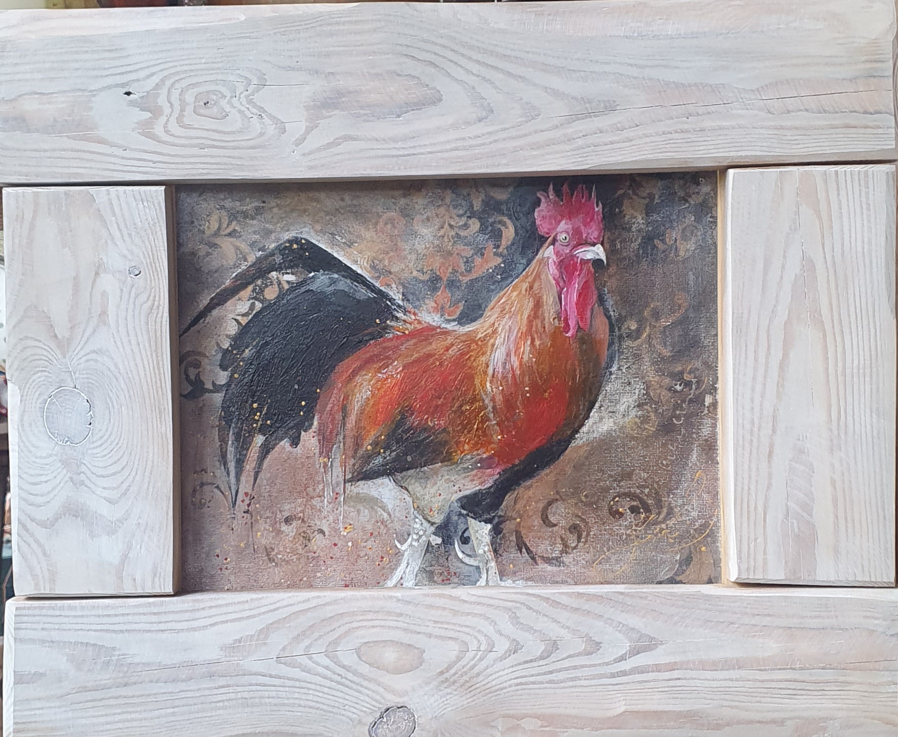 Obrazek-ilustracja, akryl na płótnie w ramie ze starych deseczek rozbielonych woskiem, dekoracja do kuchni lub innego wnętrza w rustykalnym stylu.